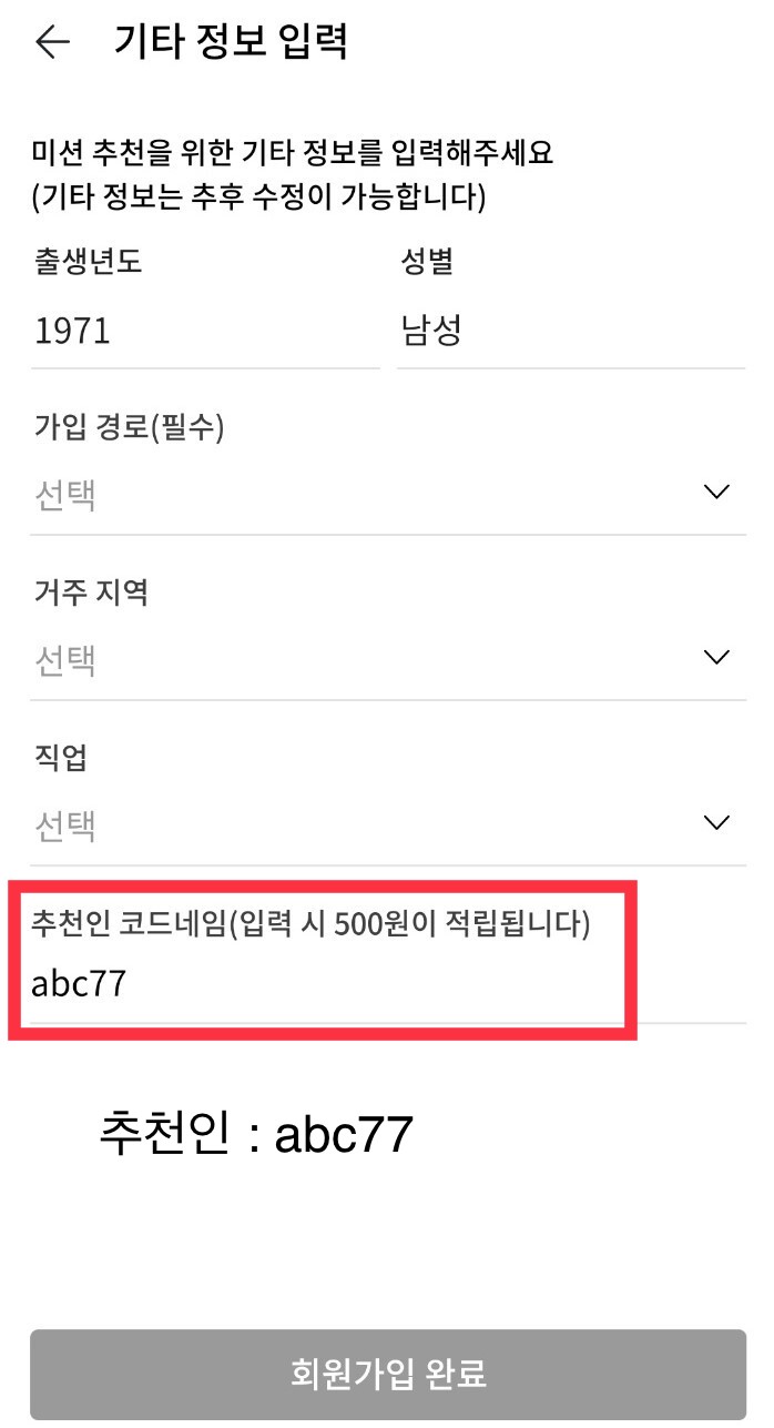 이 내용은 위에서 설명해드렸던 내용의 사진입니다. 궁금하신 점이 있으시다면 사진을 참고해주세요. 그리고 제 추천인 코드네임은 abc77입니다. 입력하고 가입하시면 500원이 추가로 적립됩니다. 비워두시면 0원으로 시작해요! 꼭 입력하시고 가입하세요~