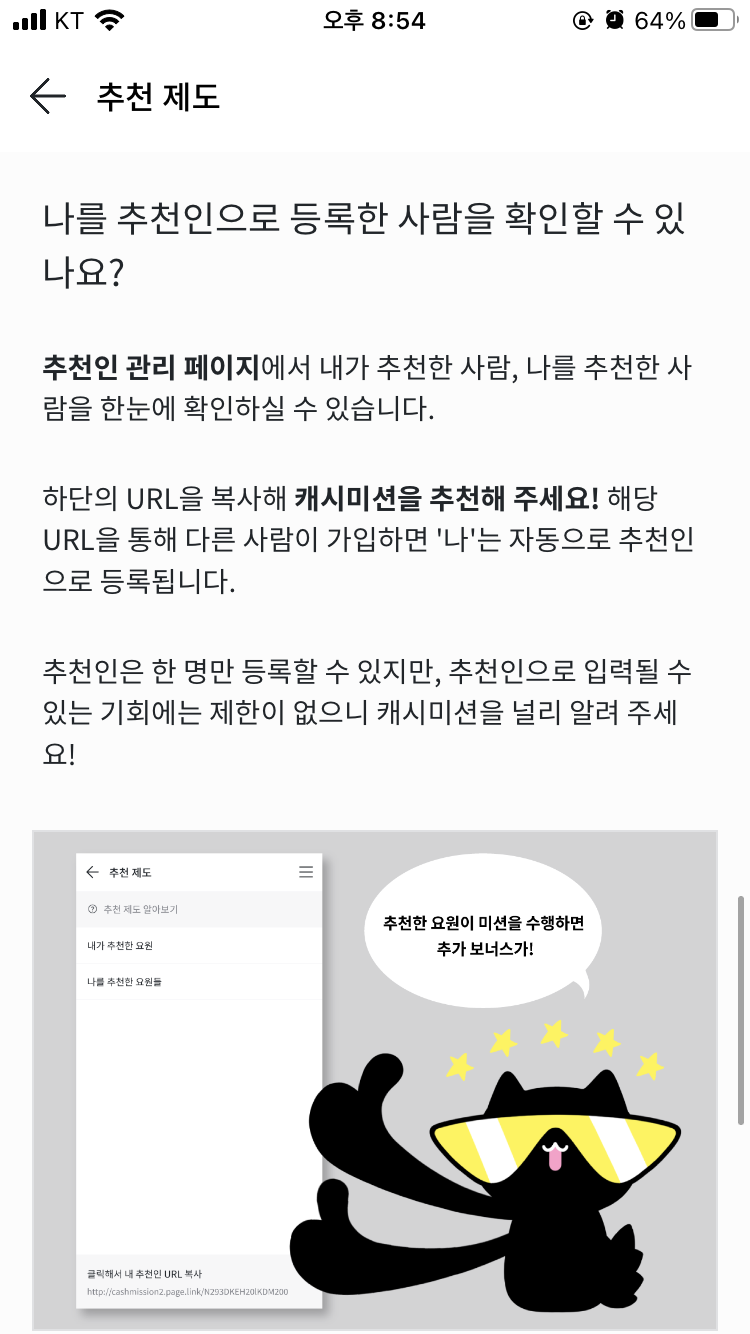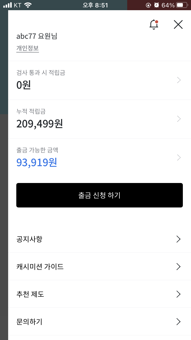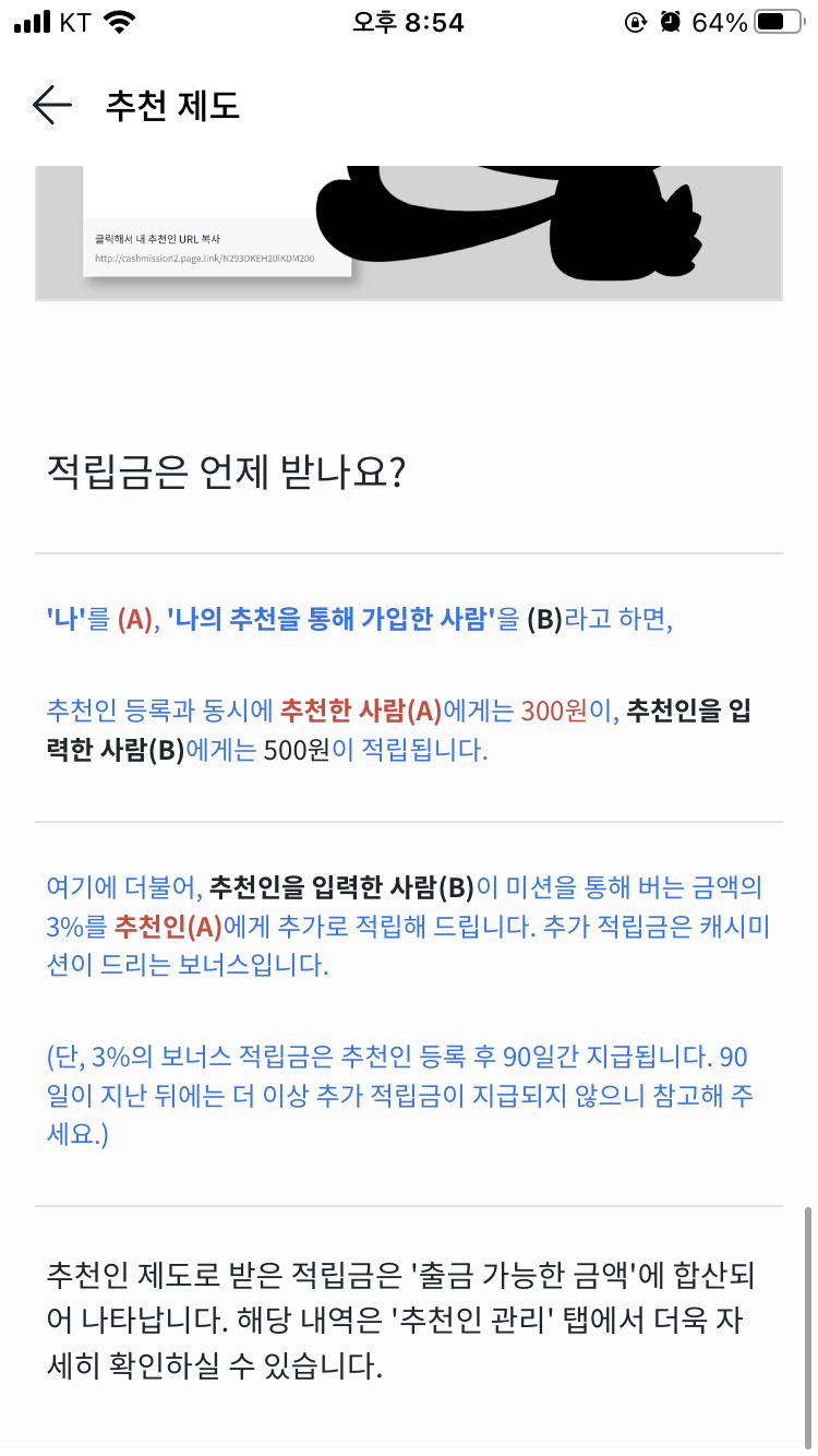 저는 지금까지 약 11만원 정도를 출금하였습니다. 출금 신청을 하게 되면 매주 화요일, 목요일에 입금됩니다. 그리고 캐시미션에는 추천인 제도가 있는데요. 이것에 대해 간략하게 설명해드리겠습니다.