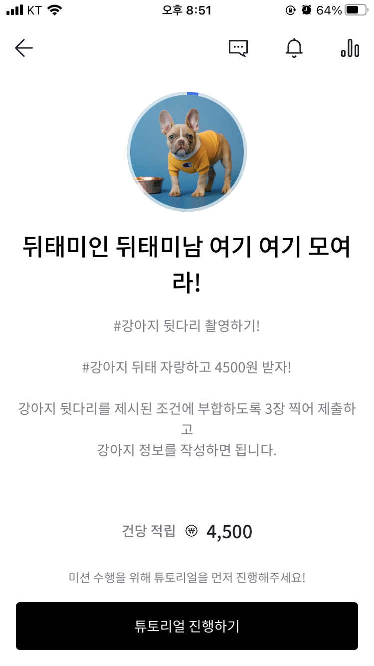 첫 번째 사진을 보시면 강아지 뒷다리를 촬영하시는 미션을 확인하실 수 있습니다. 이런 미션을 완료하면 4,500원이라는 높은 포인트를 적립하게 됩니다. 쌓은 포인트는 홈 화면에서 우측 상단의 가로 줄 세 개 모양 버튼을 터치하시면 '출금 신청 하기'를 보실 수 있는데요. 해당 버튼을 클릭하게 되면 자신의 계좌 정보를 입력하고 출금을 신청하실 수 있습니다.