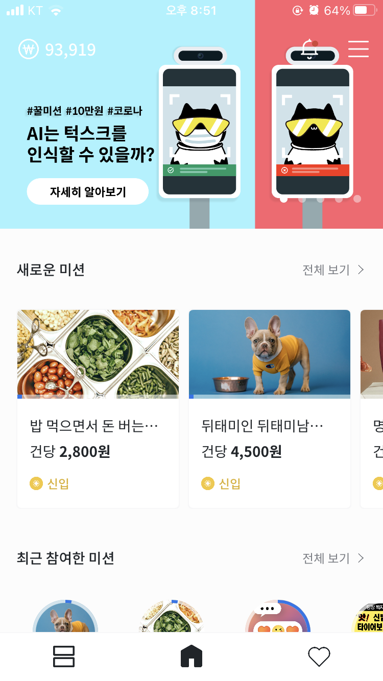 위 사진에 보이는 것과 같이, 다양한 미션(박스 그리기, 음성 녹음하기, 사진 수집 등)을 수행하면 진짜 현금으로 바꾸실 수 있는 포인트를 적립받으실 수 있습니다. 미션에 참여하시면 인공지능 개발에 기여한다는 뿌듯함도 얻으실 수 있고요.