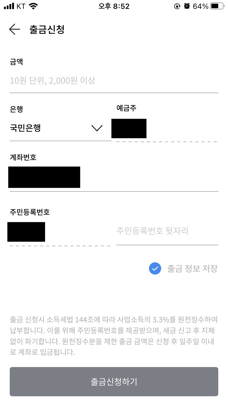 여기서 주의해야 할 점이 있다면, 출금 신청한 금액의 3.3%는 원천징수하여 세금으로 납부하게 된다는 것입니다. 세금 납부는 국민의 의무이므로, 아까운 느낌이 들어도 어쩔 수 없이 내야 되는 거겠죠? 세금 납부 신고를 위해 제공받은 주민등록번호는 세금 신고 이후 지체없이 파기된다고 하니 개인정보에 대해 걱정하시는 분도 한시름 덜었겠죠?