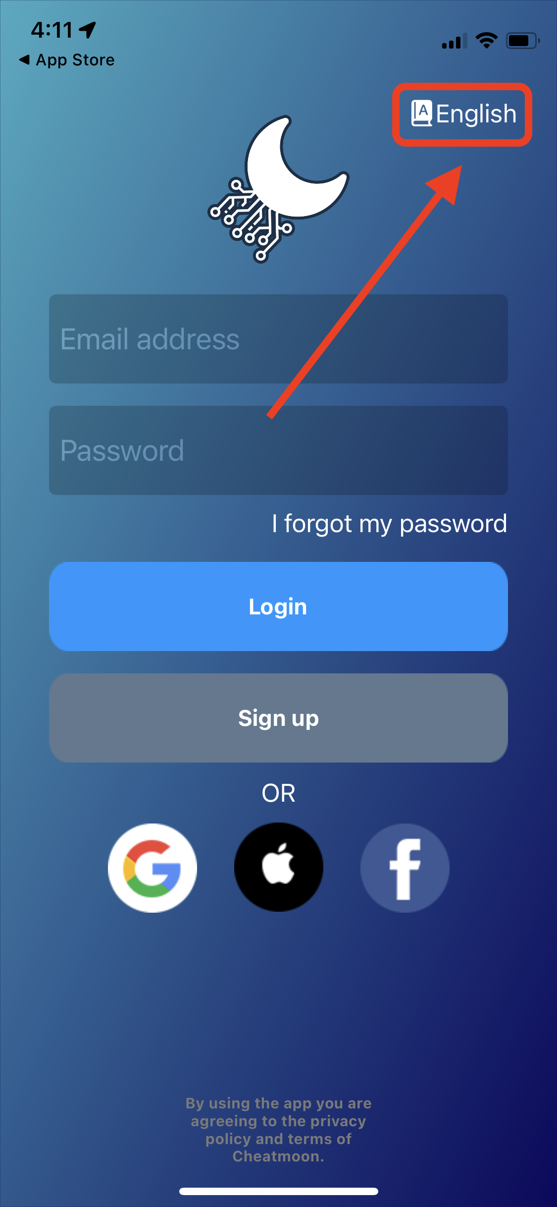 1. 구글 플레이 스토어 및 앱스토어에서 Cheatmoon Network' 앱을 설치하고 실행합니다. 그리고 로그인 페이지에서 우측 'English'를 선택해 언어를 변경해줍니다.