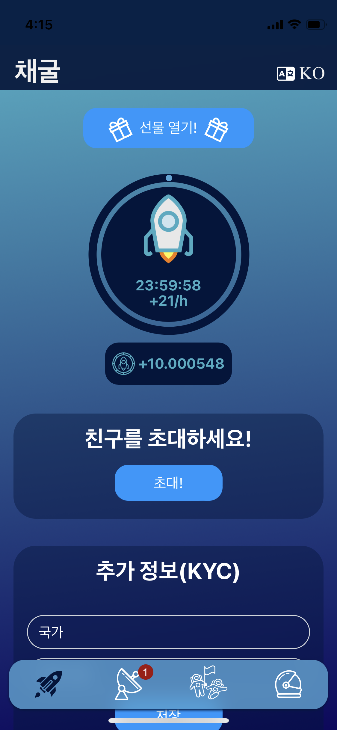 4. 귀하의 정보를 입력하고 로켓 모양을 누르면 24시간 동안 채굴이 진행됩니다. 21CTM/1h 비율로 진행되며 친구를 초대하거나 트러스트 서클을 추가하면 1명당 3CTM/1h 비율이 증가합니다.