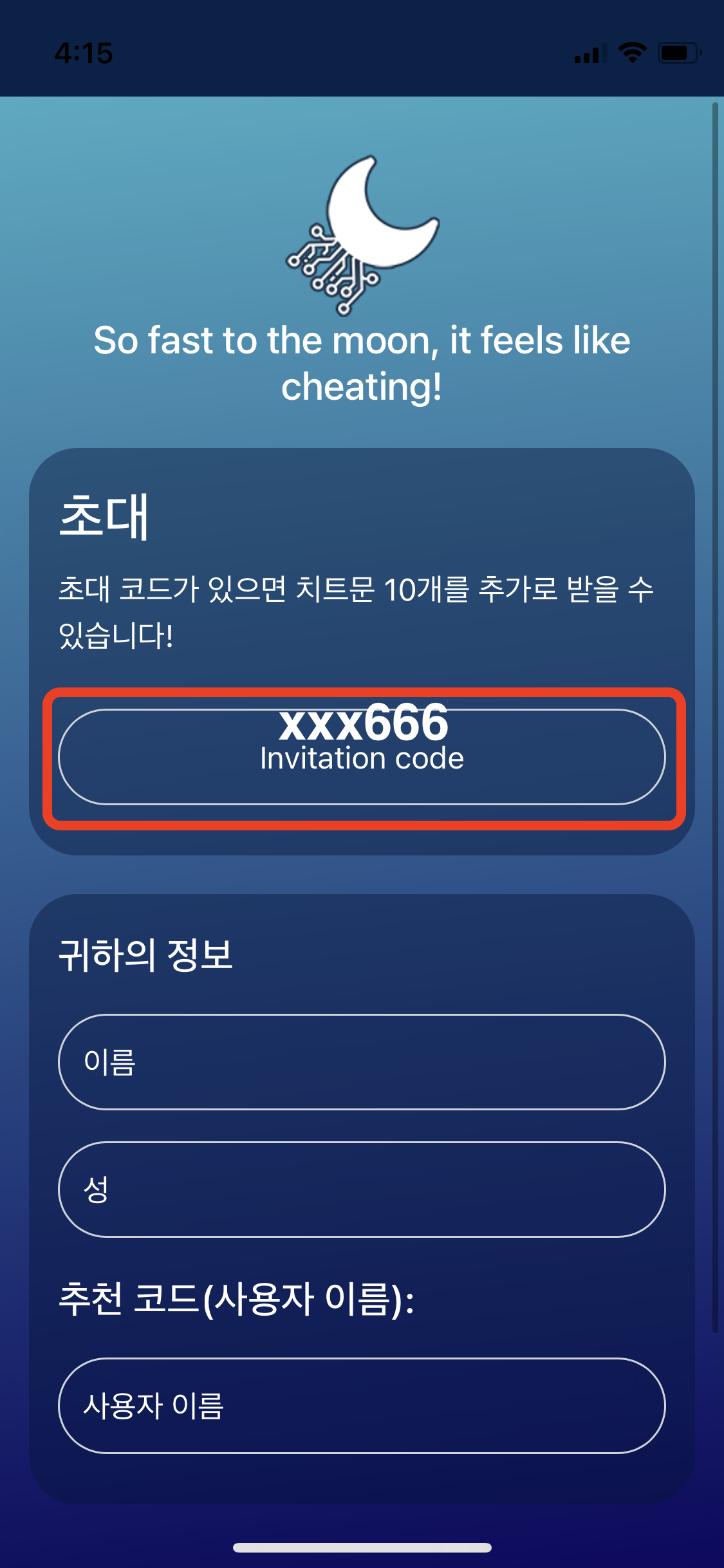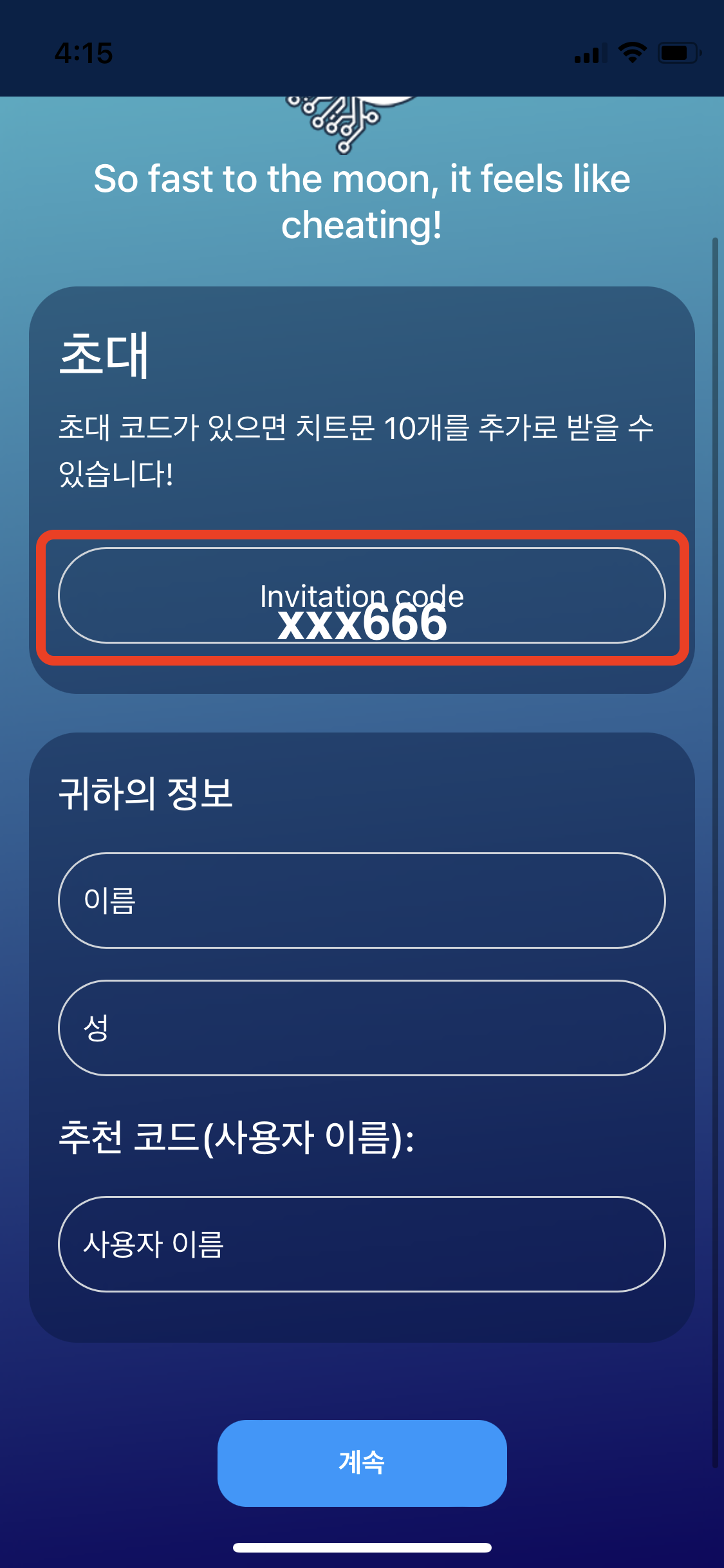 3. 구글 계정으로 로그인하고 기다리면 회원정보를 입력하는 페이지가 등장합니다. invitation code(초대 코드) 입력란에 xxx666을 입력하고 귀하의 정보를 입력해 주세요.