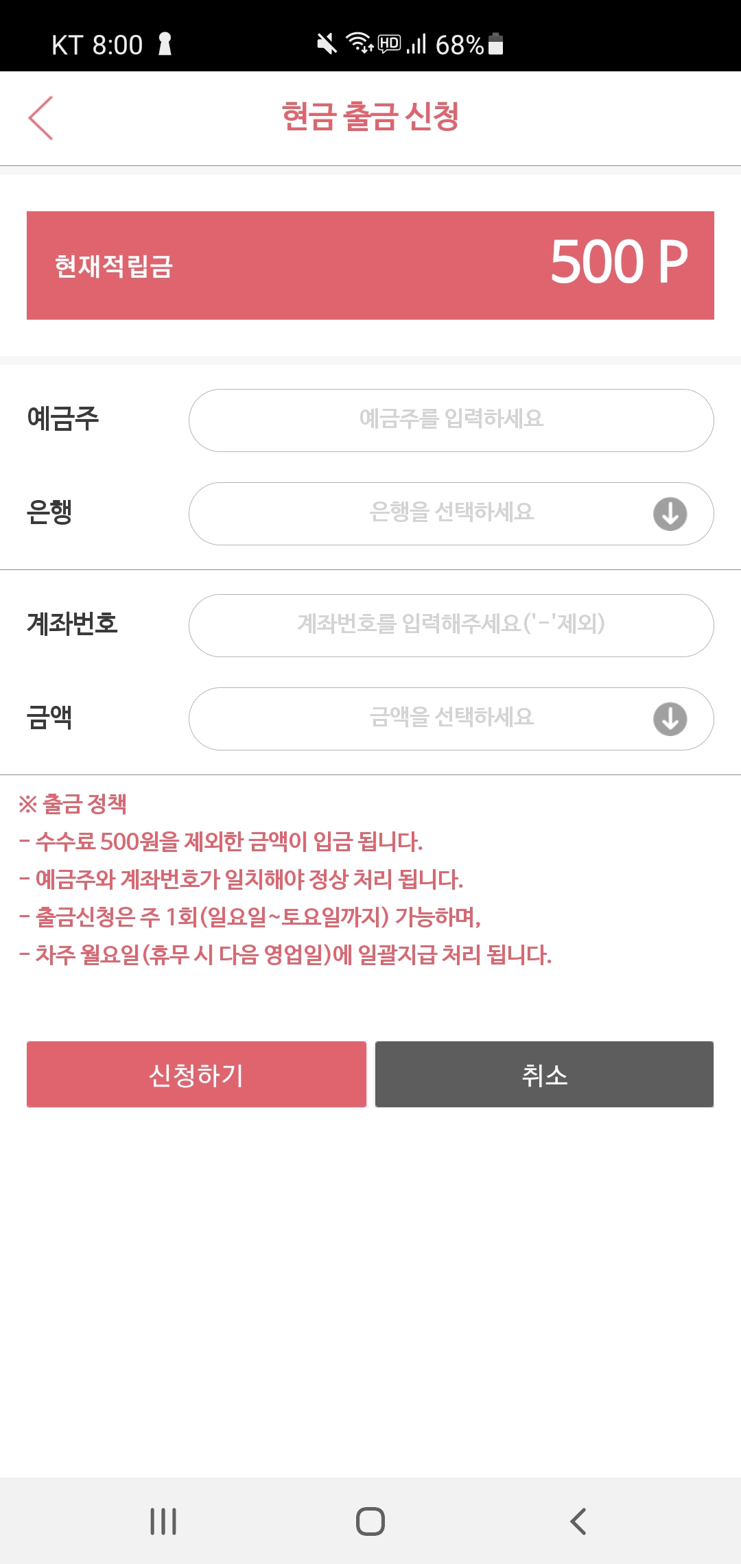 여기서 나름 괜찮은 건 현금 출금 신청 서비스입니다. 현재 적립금 포인트를 수수료 500원만 지불하고 현금으로 출금할 수 있는 서비스인데, 예금주의 계좌번호가 일치해야 하고 출금 신청은 주 1회만 가능하다고 하네요. 차주 월요일에 일괄 지급 처리된다고 하는데, 캐시몽에서 포인트를 얻으면 스토어에서 현금으로 출금 신청하는 게 가장 유리한 것 같습니다. 이상으로 글을 마칩니다.
