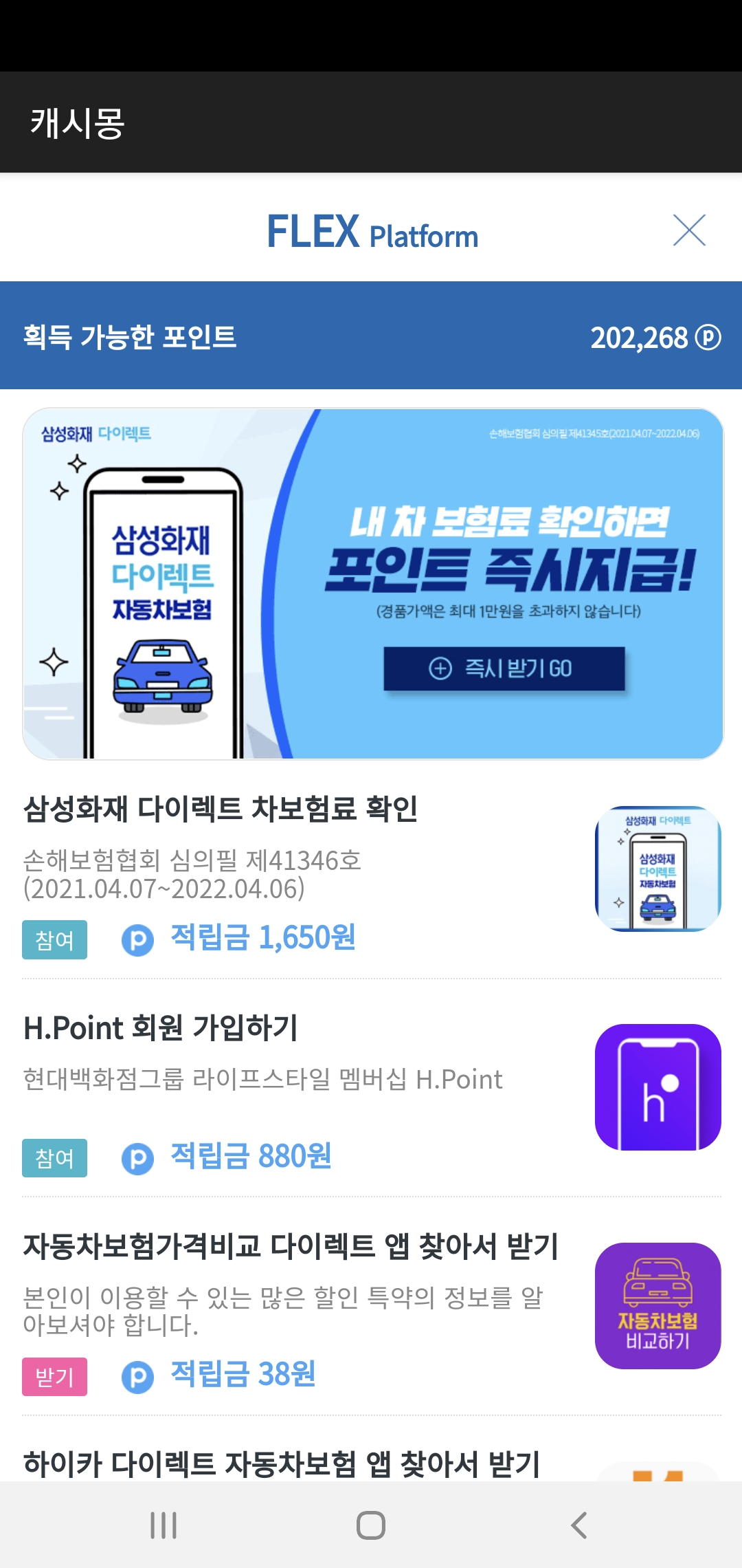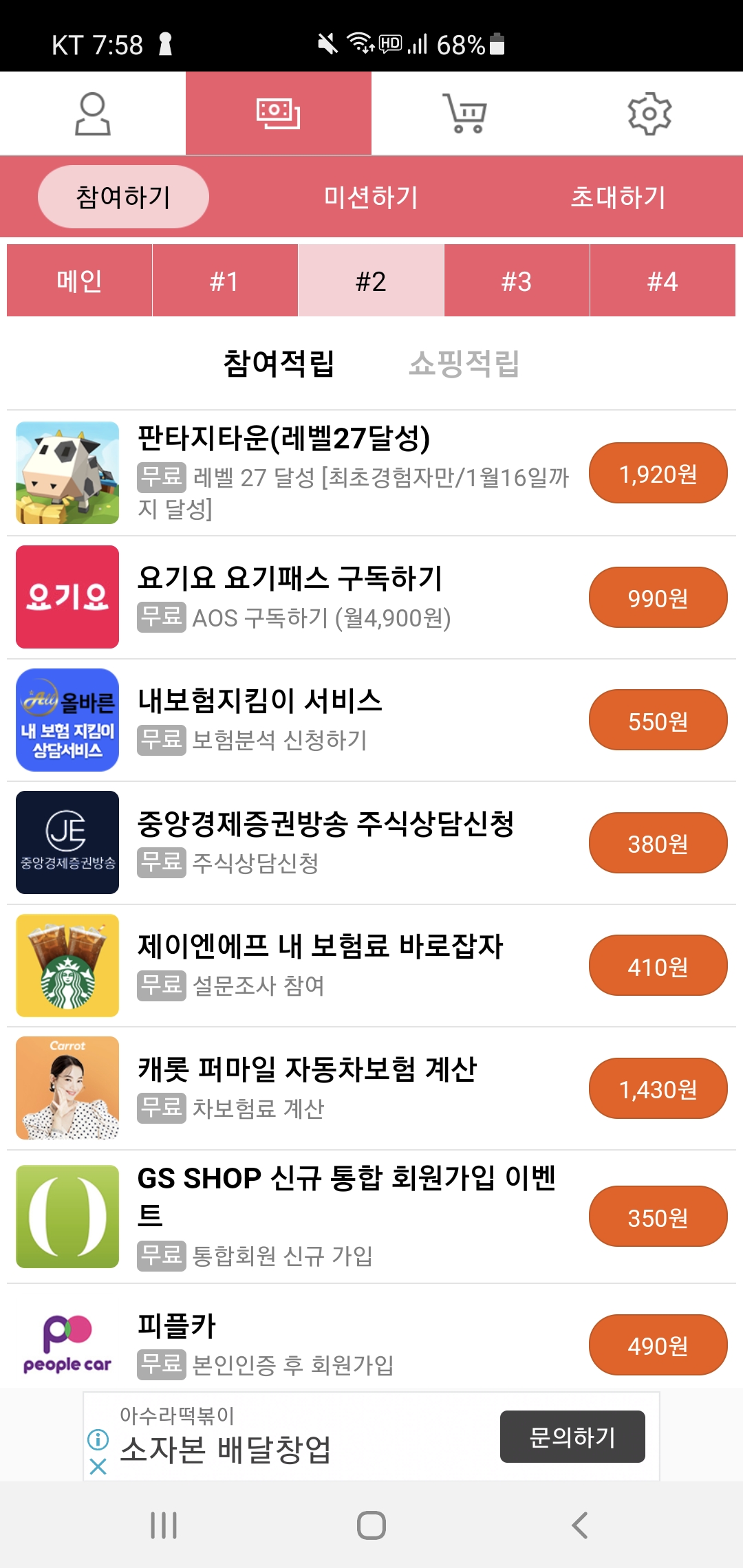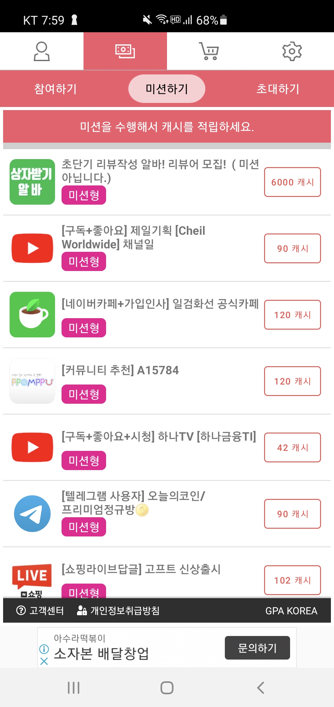 #3 충전소와 #4 충전소 화면입니다. 가입형 또는 구매형의 광고가 자주 보입니다. 가입형이 항상 그렇듯 참여하기엔 꺼려지지만 높은 적립 포인트가 매력적이네요. 미션하기 페이지에선 유튜브 구독하기/좋아요, 네이버 카페 가입인사 등의 미션을 통해 포인트를 적립 받을 수 있었습니다.