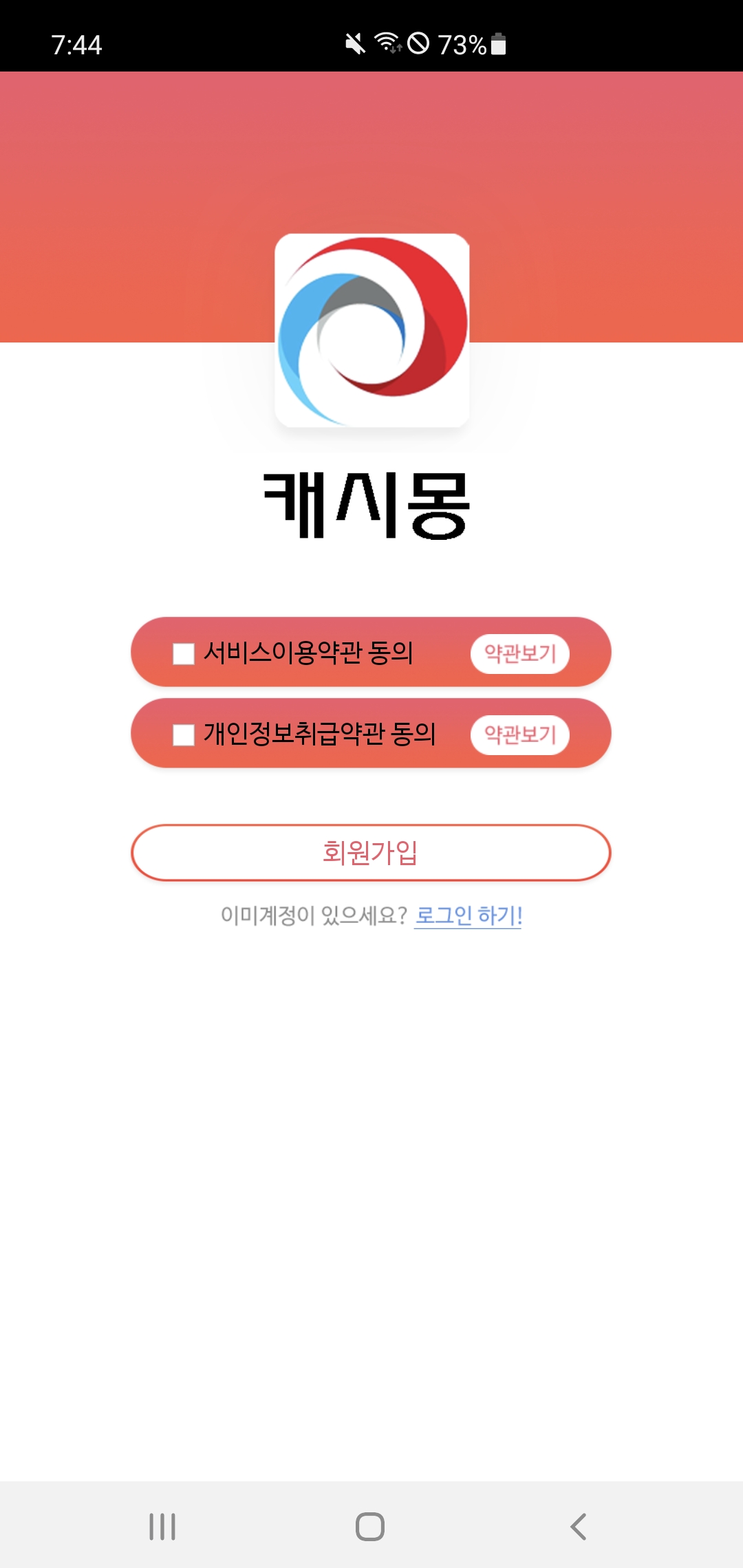 서비스이용약관과 개인정보취급약관에 동의한 다음 '회원가입'을 눌러 가입을 진행하시면 됩니다. 참고로 캐시몽은 공기계로 가입할 수 없으며, 휴대폰에 유심 카드가 장착되어 있어야 가입을 진행할 수 있었습니다.