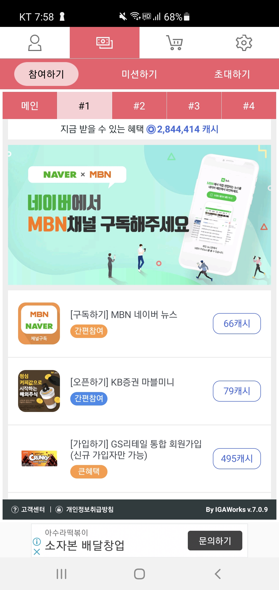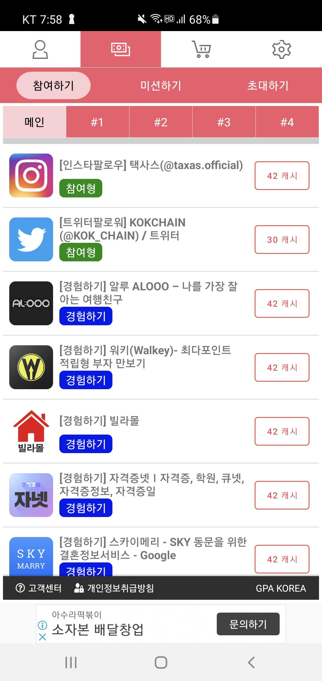 캐시몽에서 포인트를 적립 받는 수단은 굉장히 직관적입니다. 사진에 보이듯이 충전소가 메인, #1, #2, #3, #4 이렇게 총 5개로 나누어져 있으며, 마음에 드는 광고를 골라 포인트를 적립 받으시면 됩니다. 인스타그램과 트위터, 페이스북 팔로우 등 엄청 많은 광고가 구비되어 있습니다.