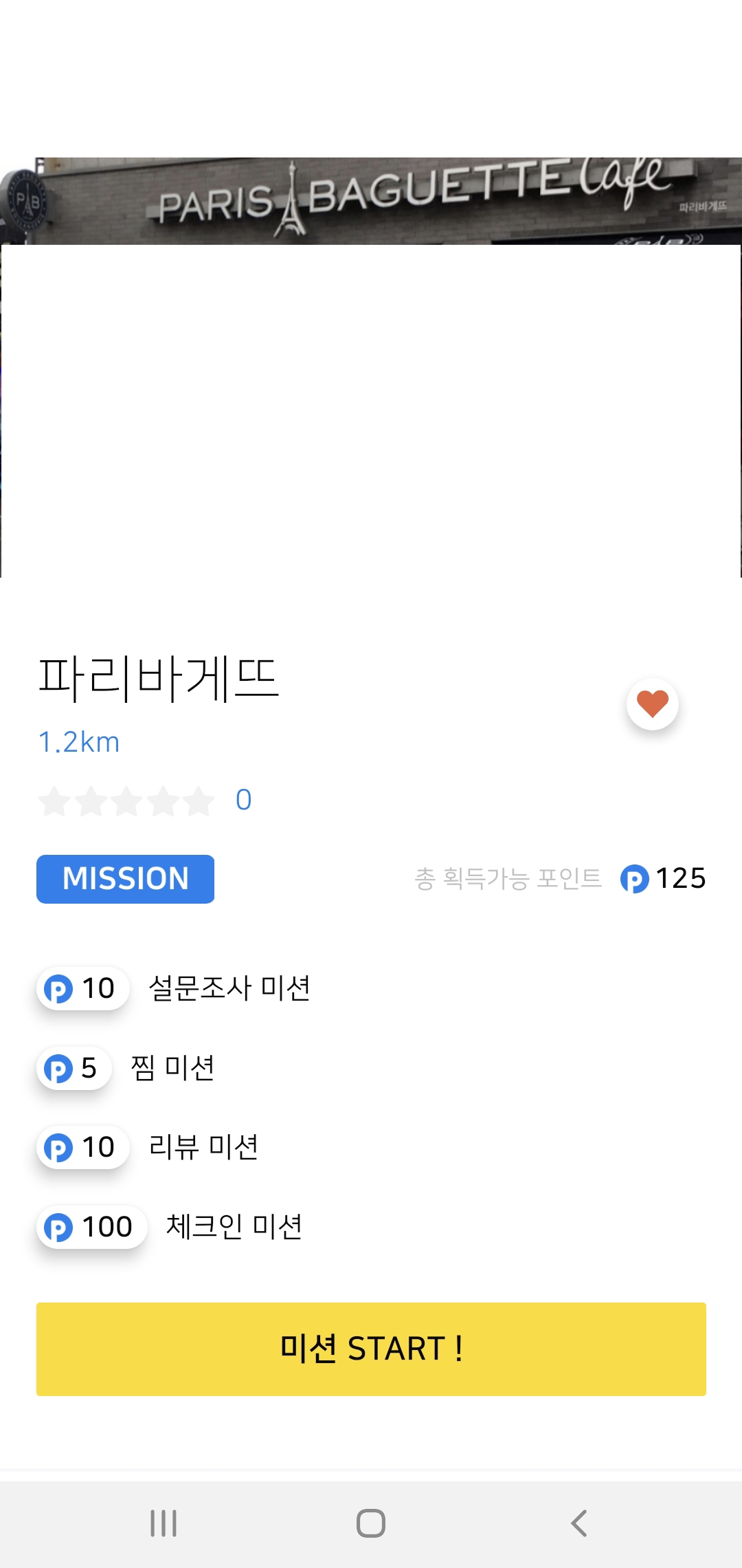 스마트폰 위치를 키면 자동으로 근처에 있는 매장을 알려주는데, 해당 매장에서 '미션 START!' 버튼을 누르면 GPS로 현재 위치가 파리바게뜨인지 확인하고 체크인 미션이 완료됩니다. 그 외에도 설문조사 미션, 찜 미션, 리뷰 미션을 통해 25포인트를 얻을 수 있는데요. 한마디로 말해 "매장에 방문해서 미션 버튼만 눌러주면 체크인 미션으로 100P를 받을 수 있다"라고 이해하시면 될 듯합니다.