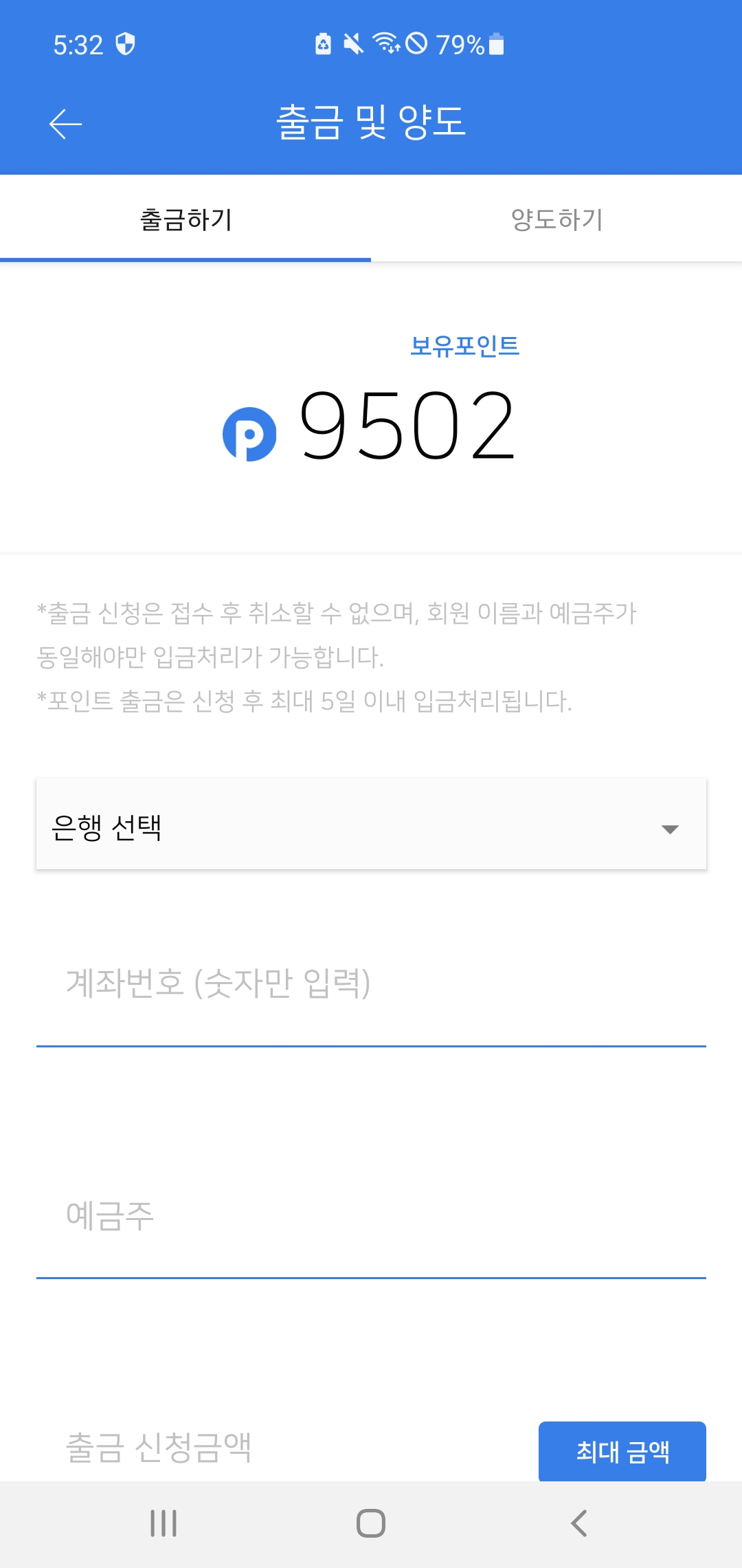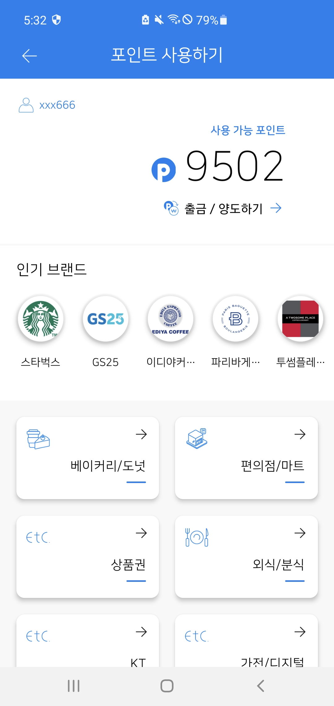 마찬가지로 홈 화면에서 포인트 사용하기를 눌러 위 페이지로 이동할 수 있습니다. 기프티콘이 많은 편은 아니지만 1:1 비율로 현금 출금이 가능하다는 점과 피자/버거/치킨 류의 기프티콘이 메뉴별로 잘 구성되어 있다는 점으로 미루어보았을 때 나름 괜찮은 편에 속합니다.
