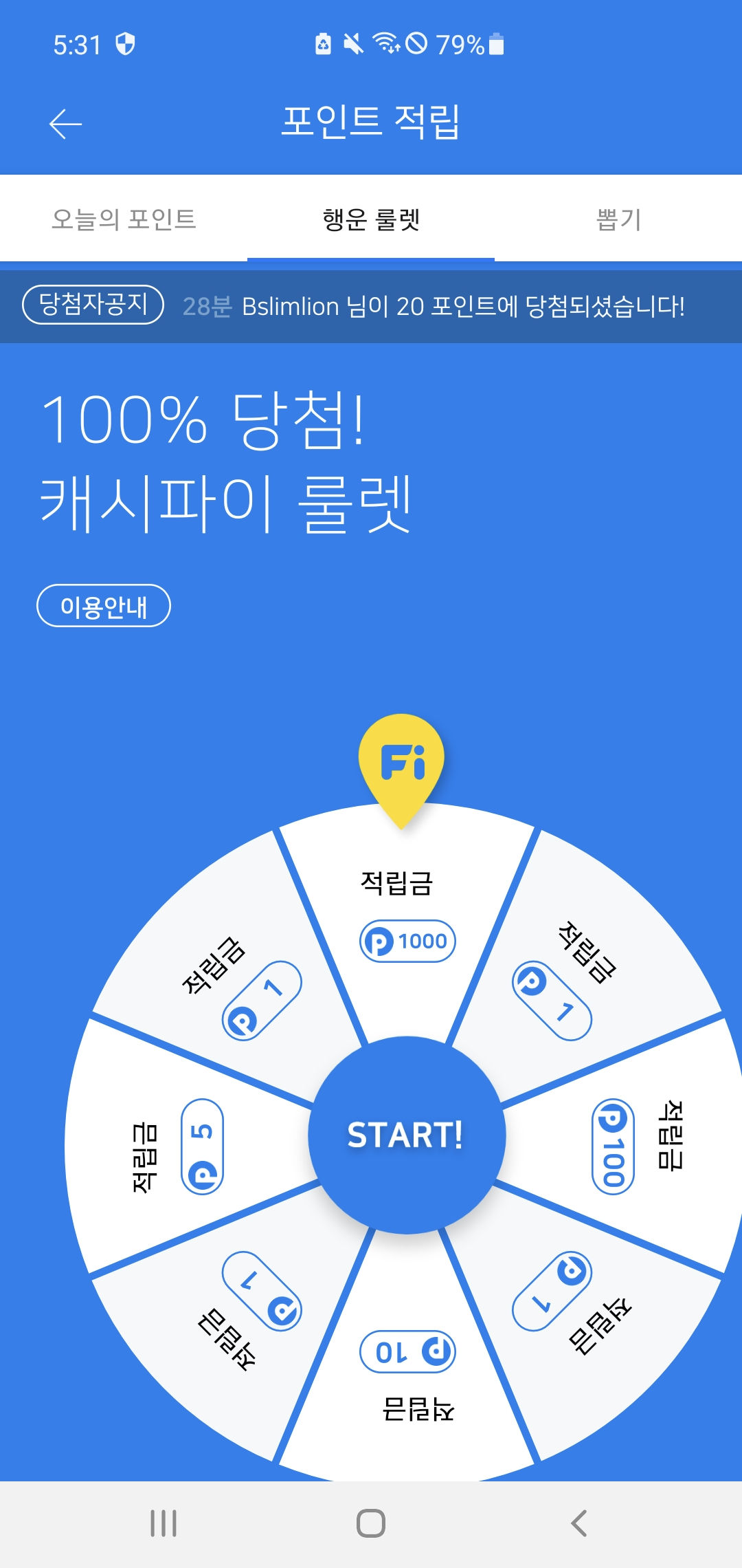 상단 '행운 룰렛' 탭을 눌러 매일 무료로 캐시파이 룰렛을 돌리실 수 있습니다. 최소 1P부터 최대 1,000P까지 얻을 수 있고, 하루에 한 번 룰렛을 이미 돌렸다 하더라도 10초 정도 되는 광고 영상을 시청하면 무제한으로 룰렛 돌리기가 가능합니다. 그리고 뽑기 페이지에서는 캐시파이 포인트를 사용하고 일정 확률로 많은 양의 포인트를 뽑는 곳인 것 같습니다.