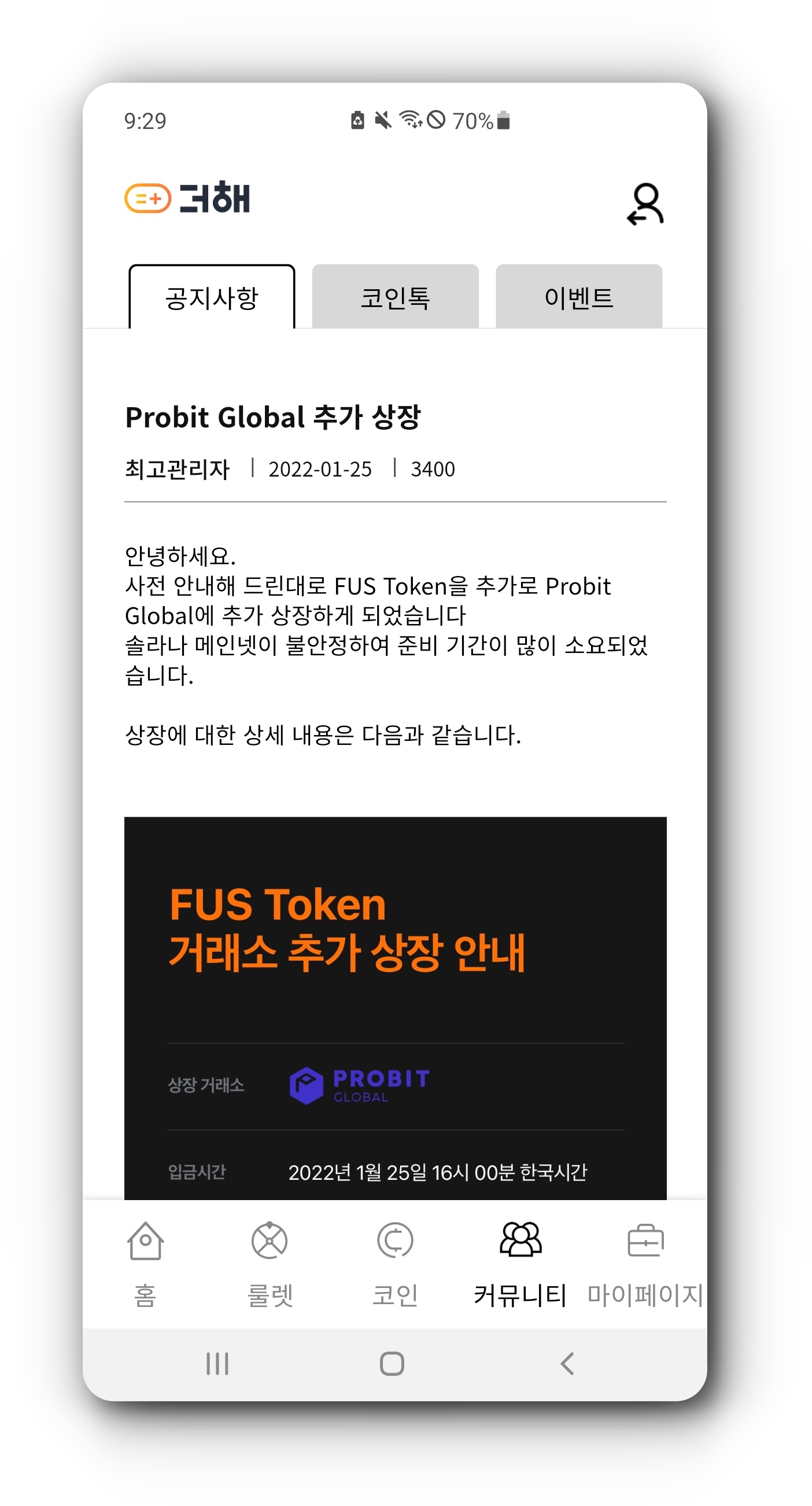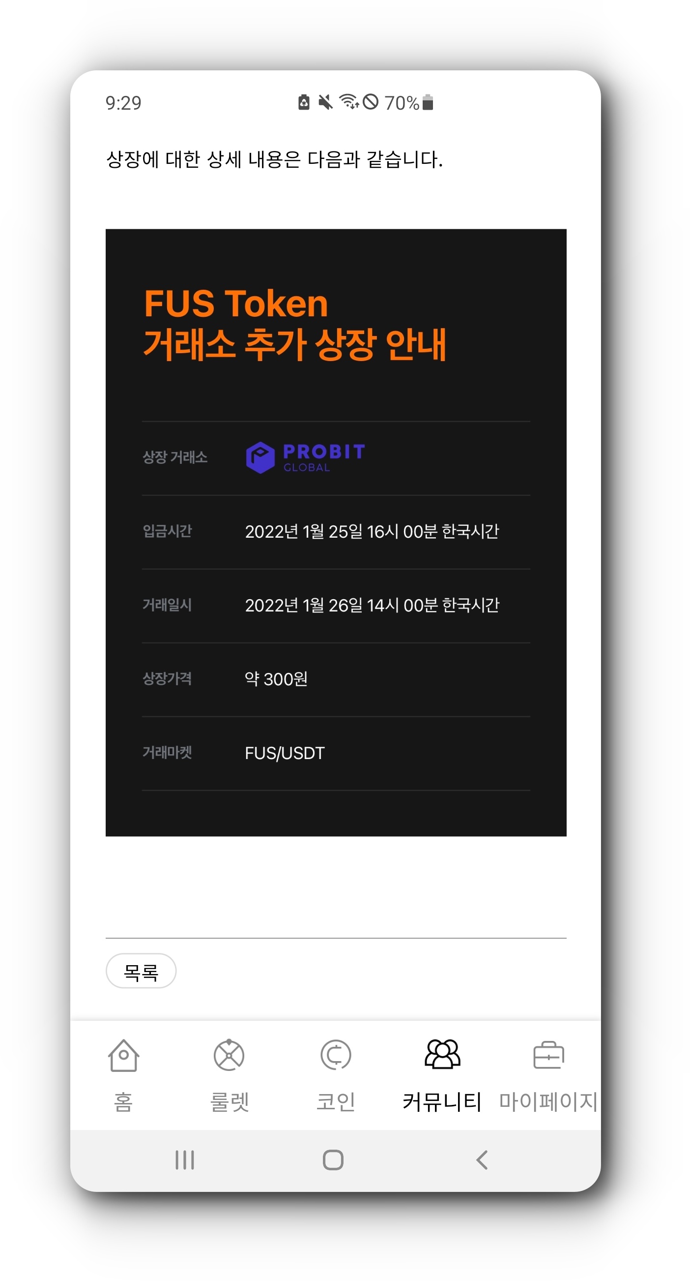- 2022년 1월 25일 공지사항에 따르면 FUS Token은 2022년 1월 26일 14시에 상장가 300원으로 상장되었다.