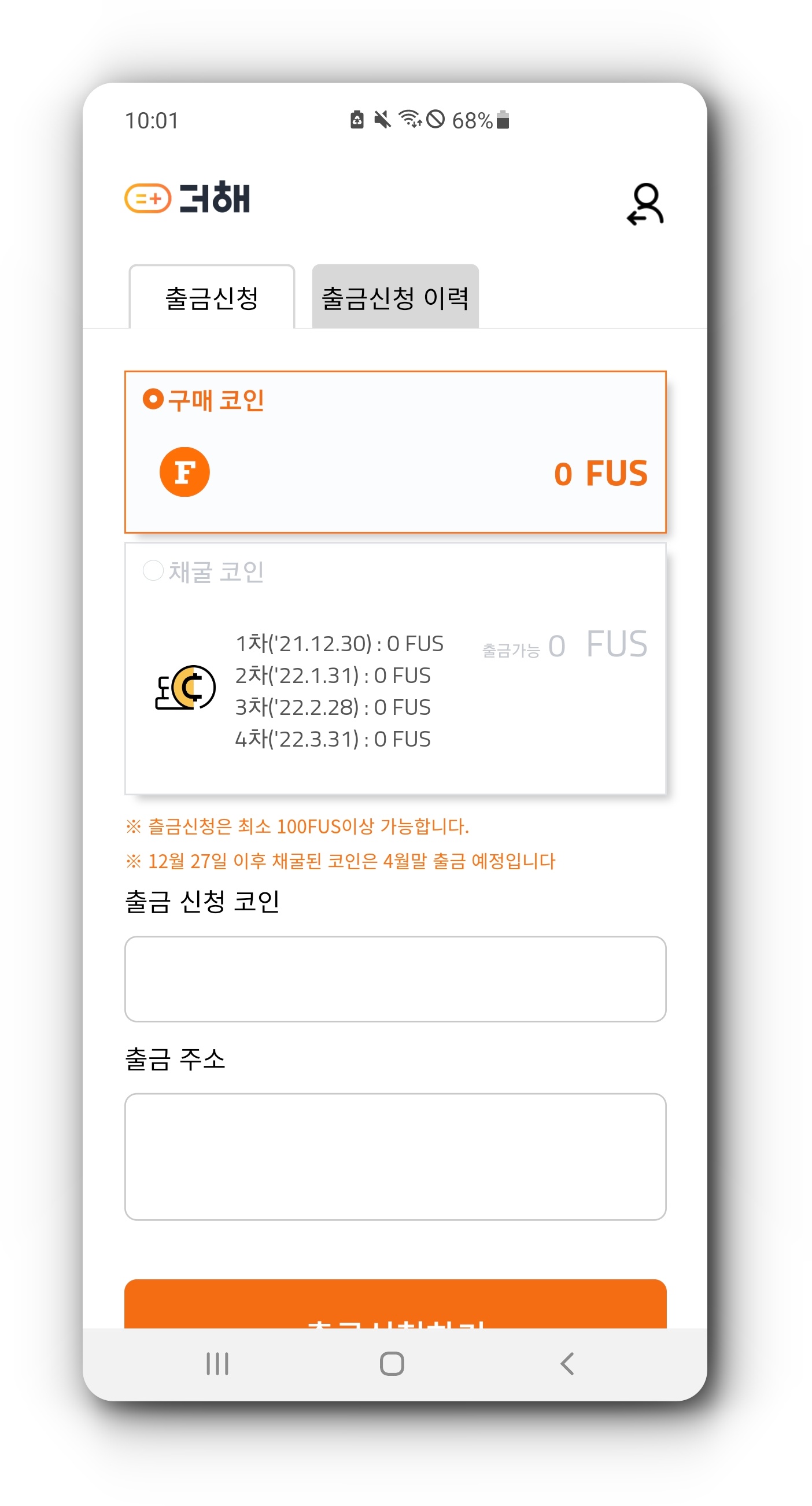 - 출금 신청은 최소 100FUS 이상부터 가능하다.