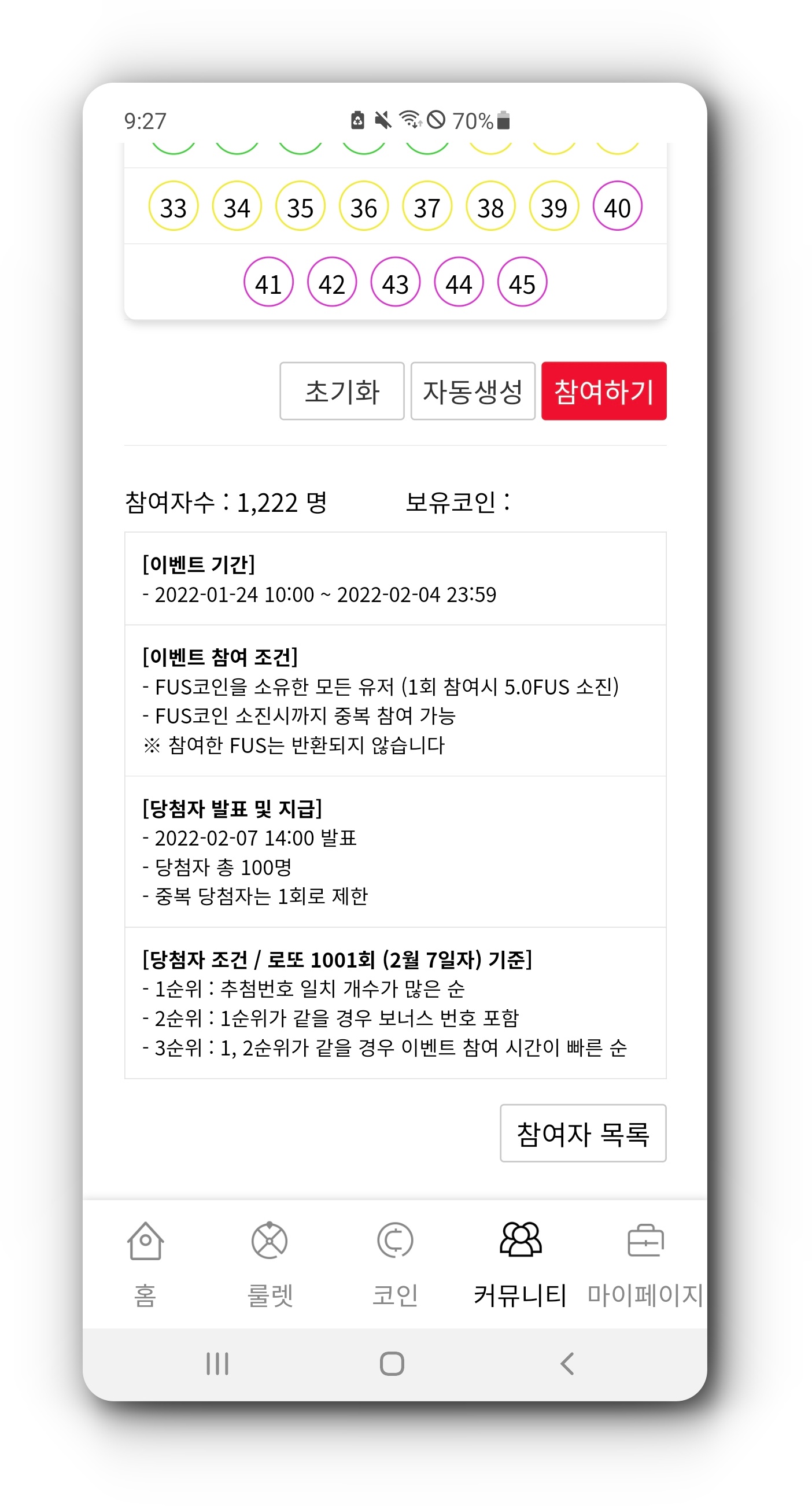 - 아래 사진은 가장 최근에 올라온 이벤트인데 로또 1001회 추첨번호와 일치 개수가 많은 사람이 1등이 된다는 내용이다.