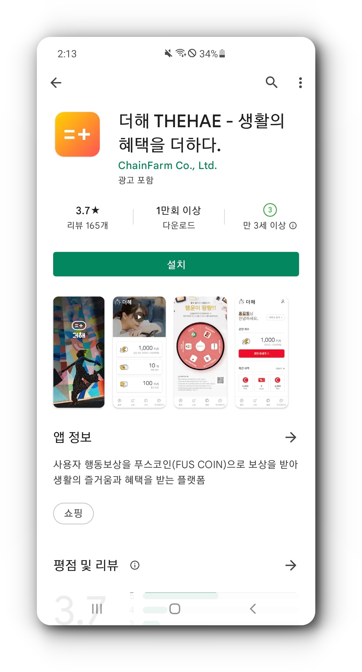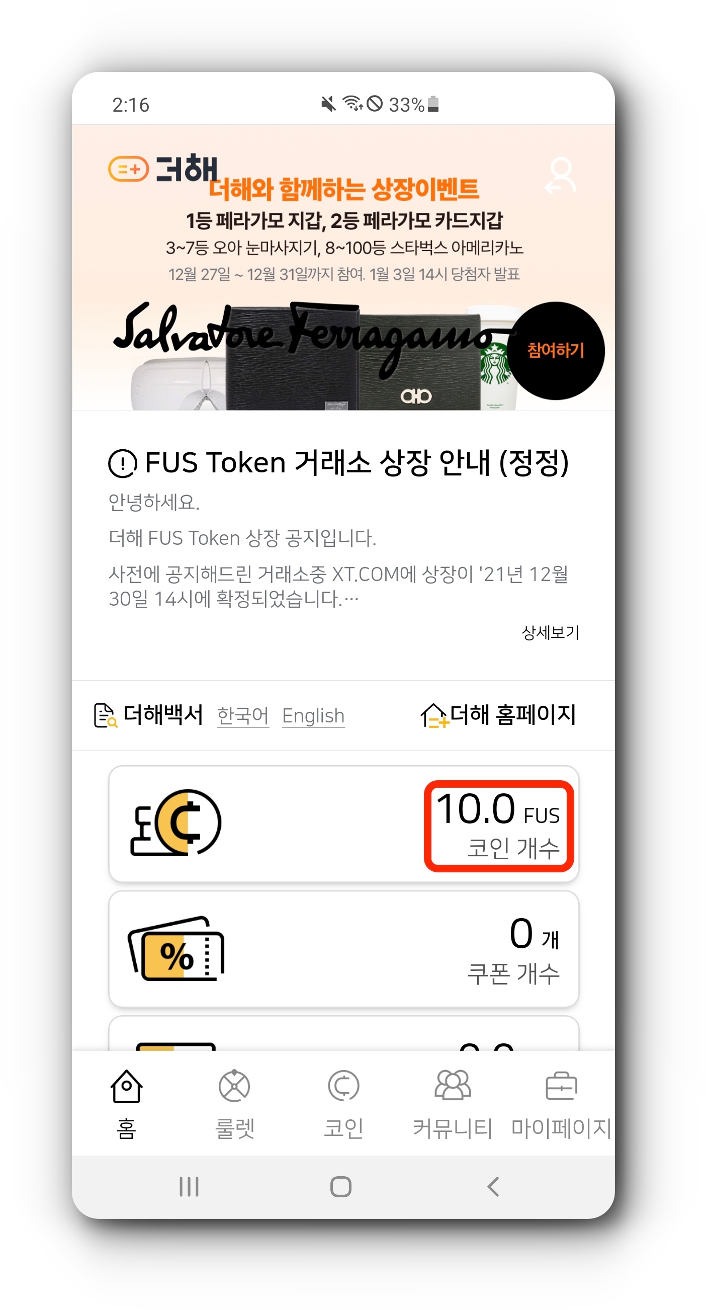 '더해'는 구글 플레이 스토어에서 설치할 수 있는 앱입니다. 더해 앱을 통해 FUS 토큰을 무료로 채굴할 수 있습니다. 채굴 방법은 간단한데요. 룰렛을 돌리기만 하면 최소 0.1FUS부터 최대 5FUS까지 얻으실 수 있습니다. FUS 토큰말고도 기프티콘에 당첨되실 수도 있어요. FUS토큰은 1월 26일 글로벌 가상화폐 거래소 Probit Global에 상장 가격 300원으로 상장된 이력이 있습니다.