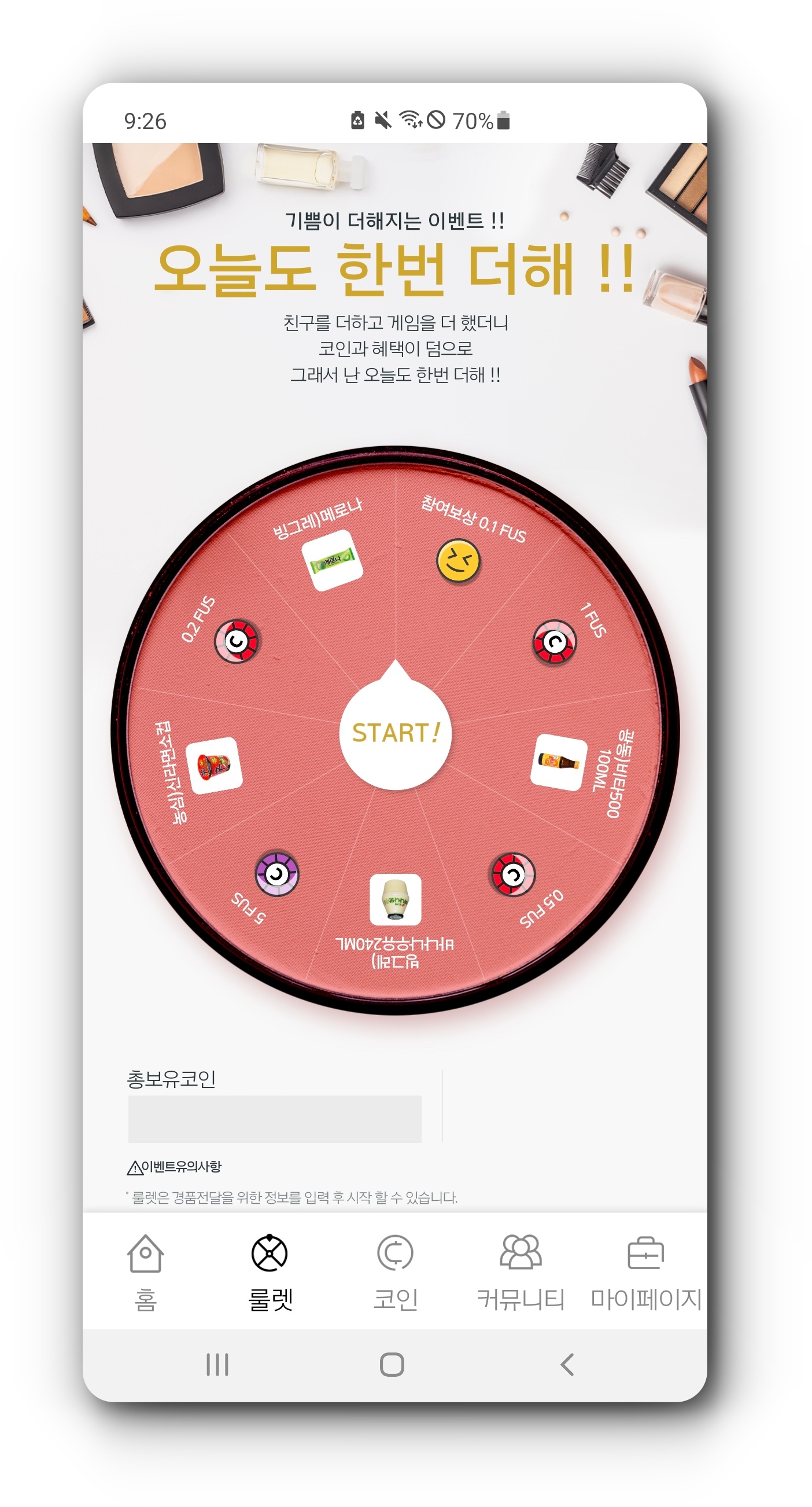 - 1회 참가할 때마다 5FUS가 소모되며, 1~5등은 이어폰, 6~100등은 스타벅스 아메리카노 기프티콘을 증정한다.