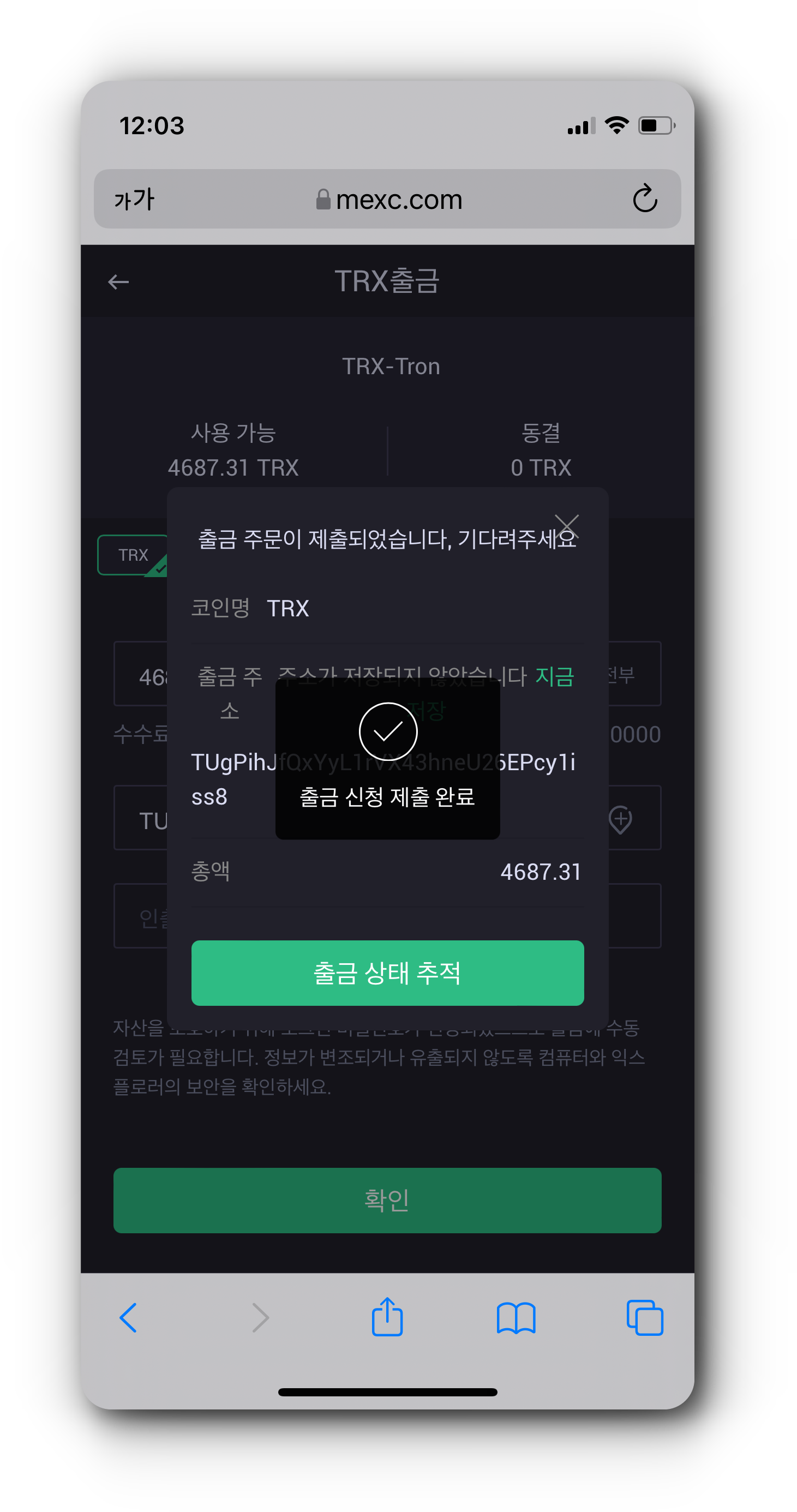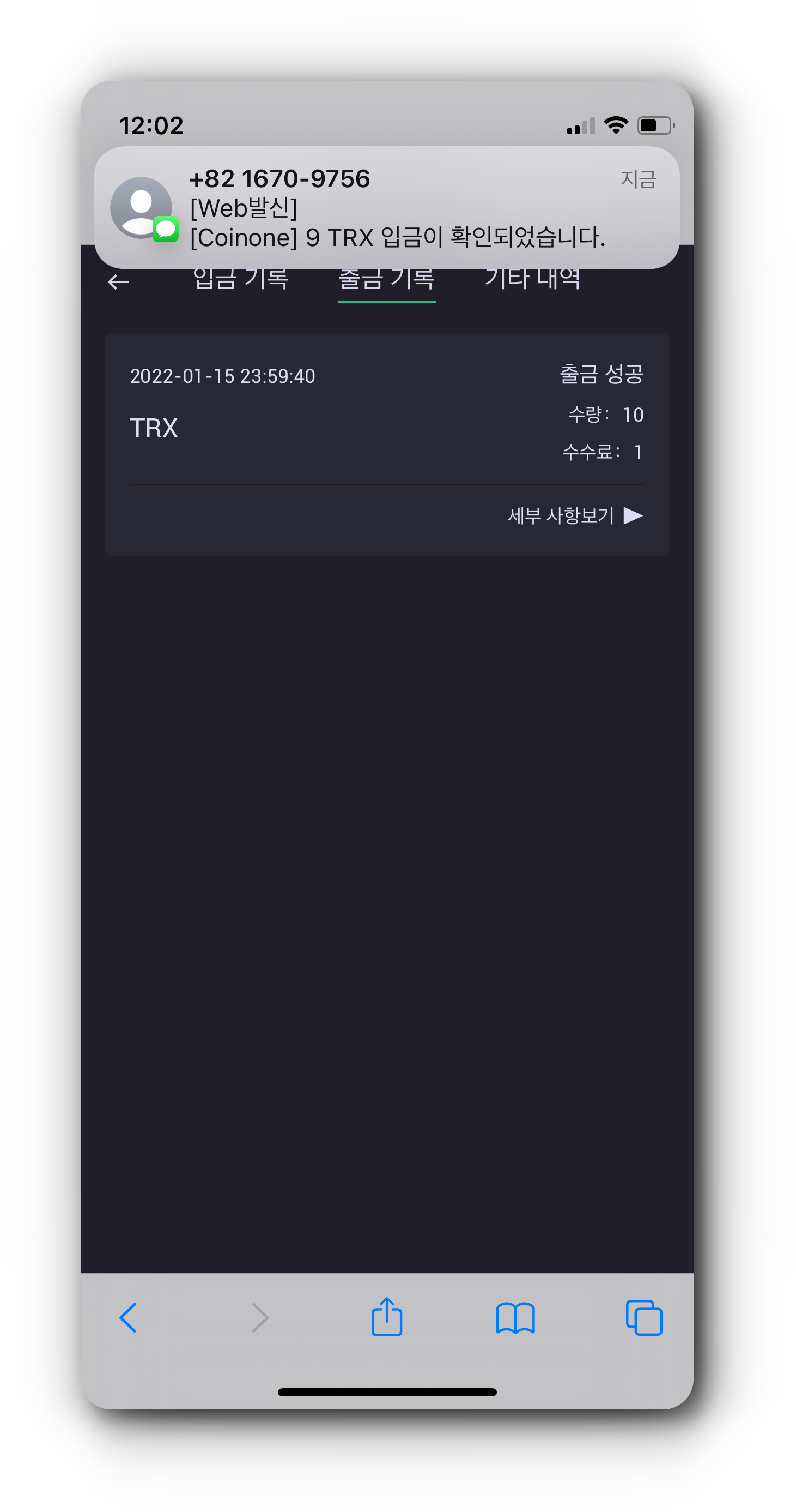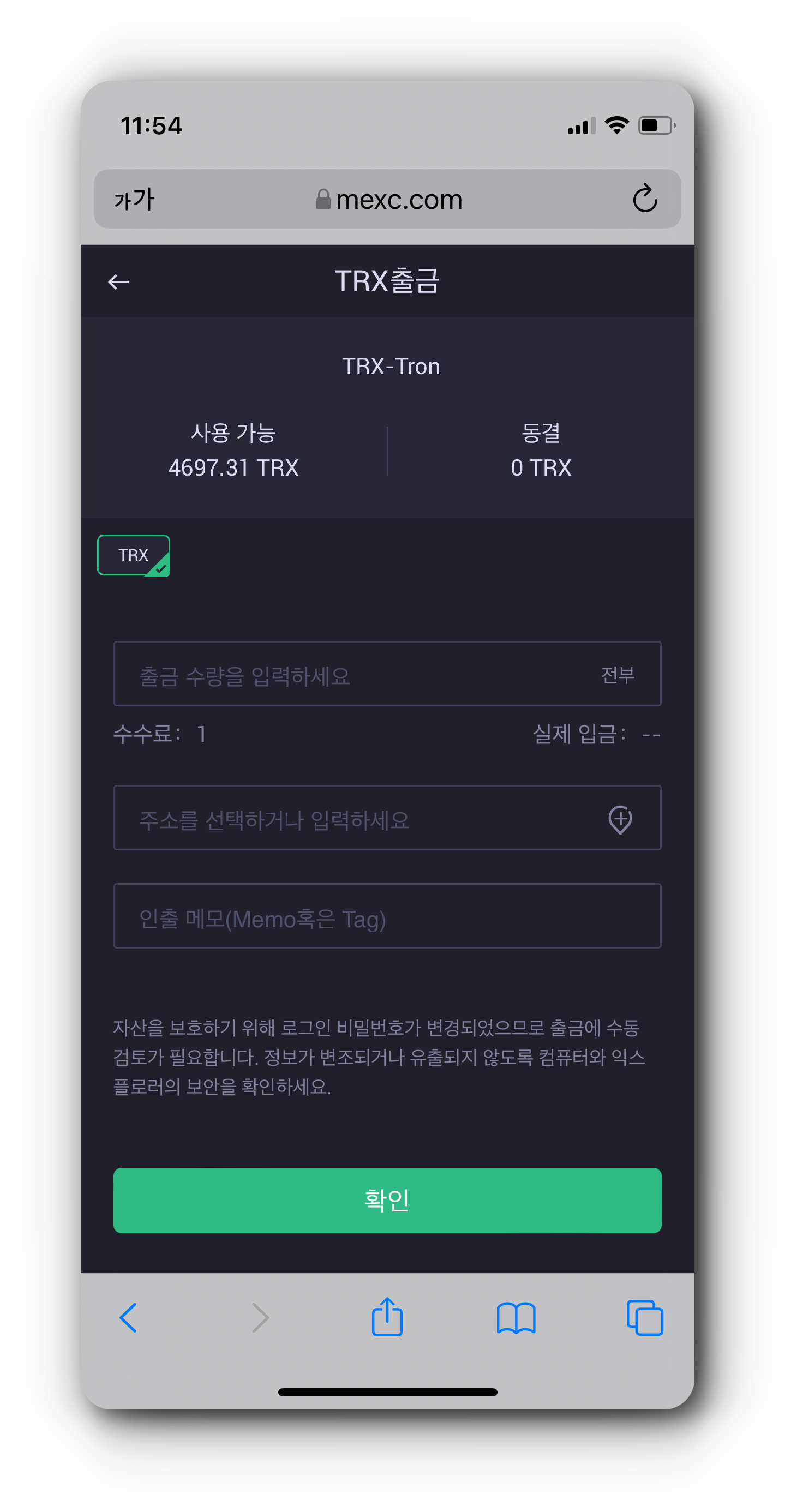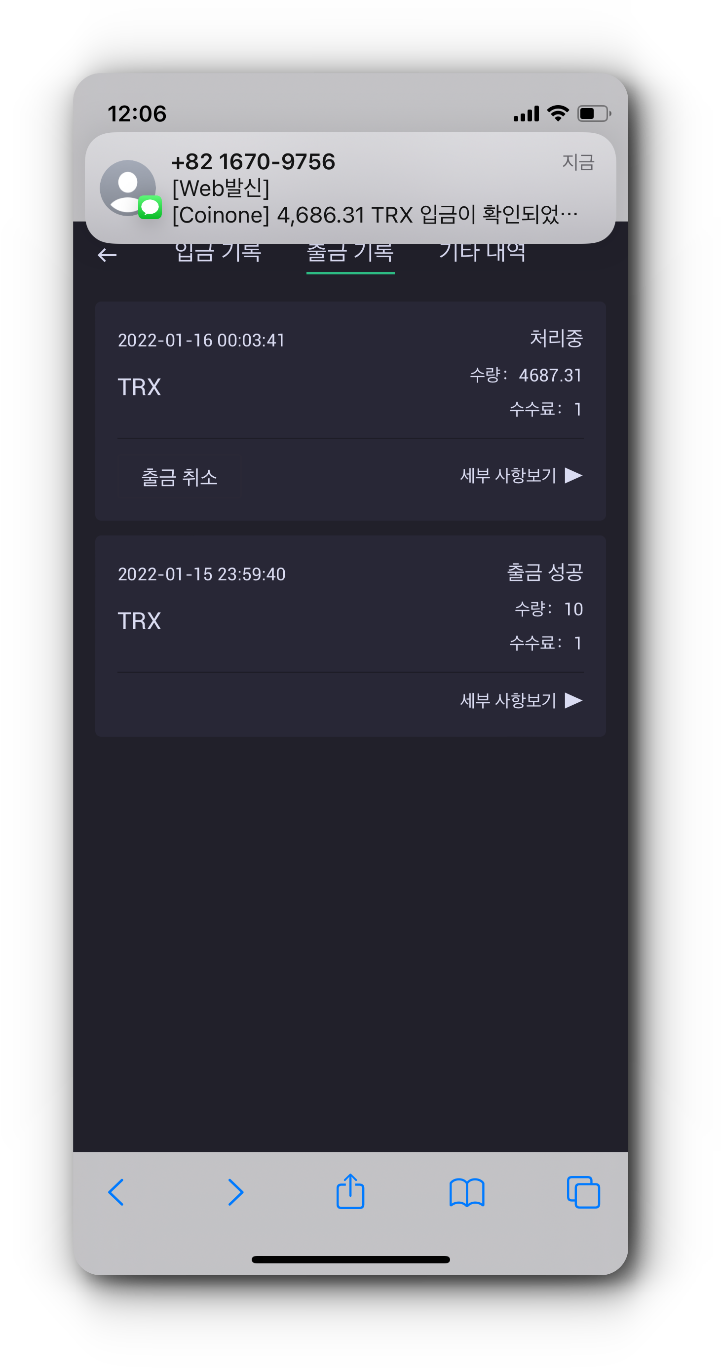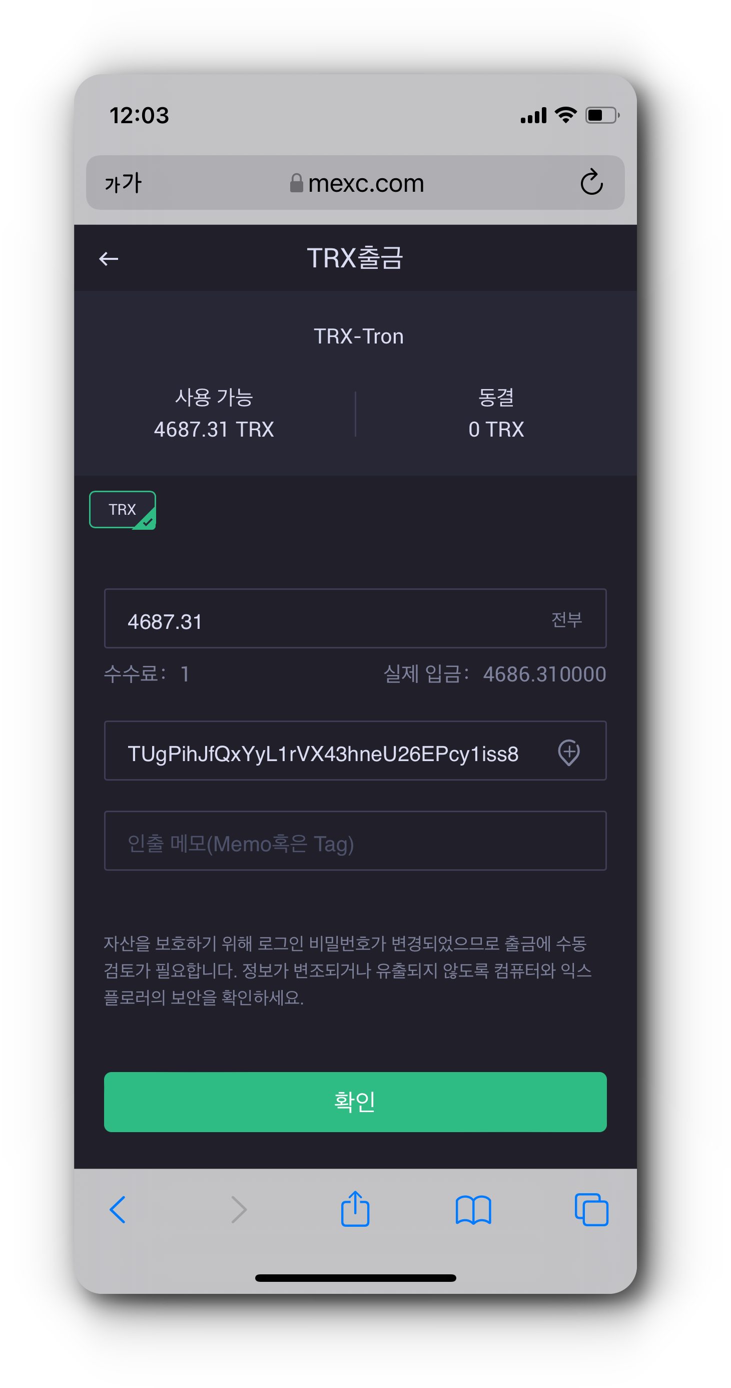 (5) 코인원 지갑에 정상적으로 TRX가 입금된 것을 확인하였으면 이제 가지고 있는 TRX 전량을 출금합니다.