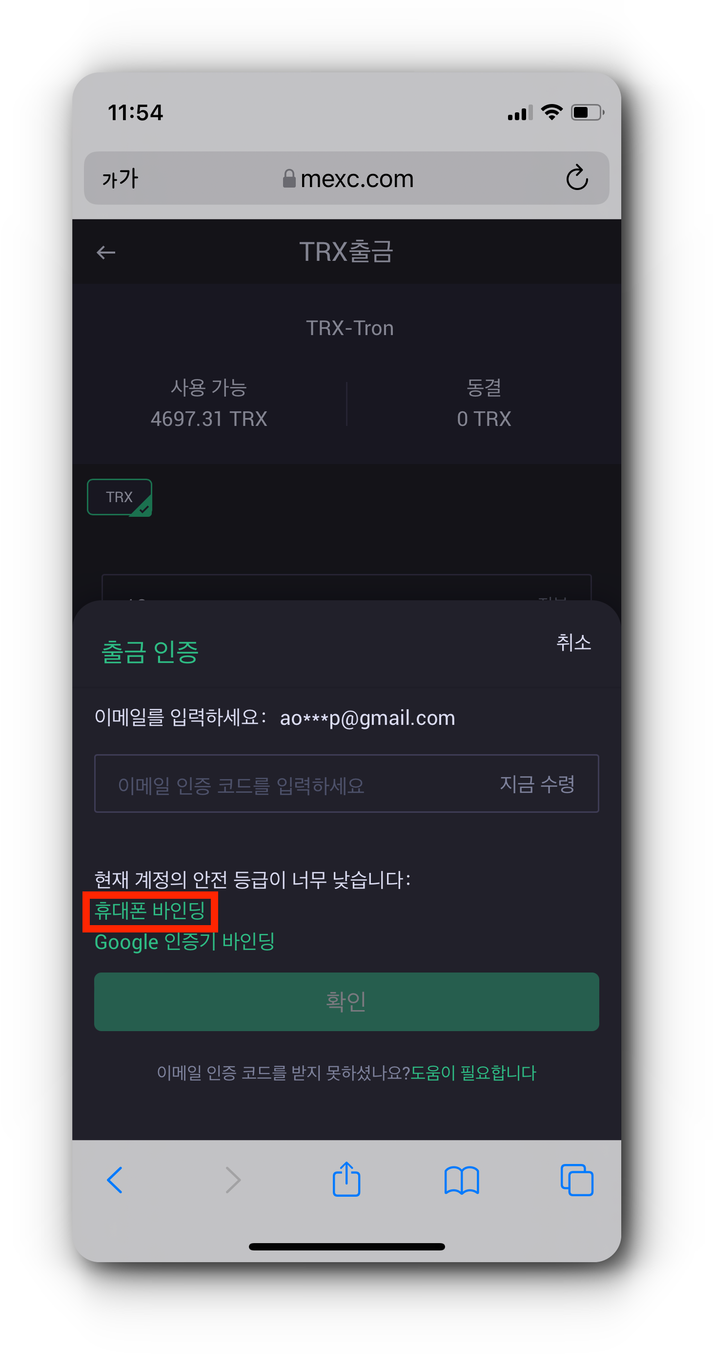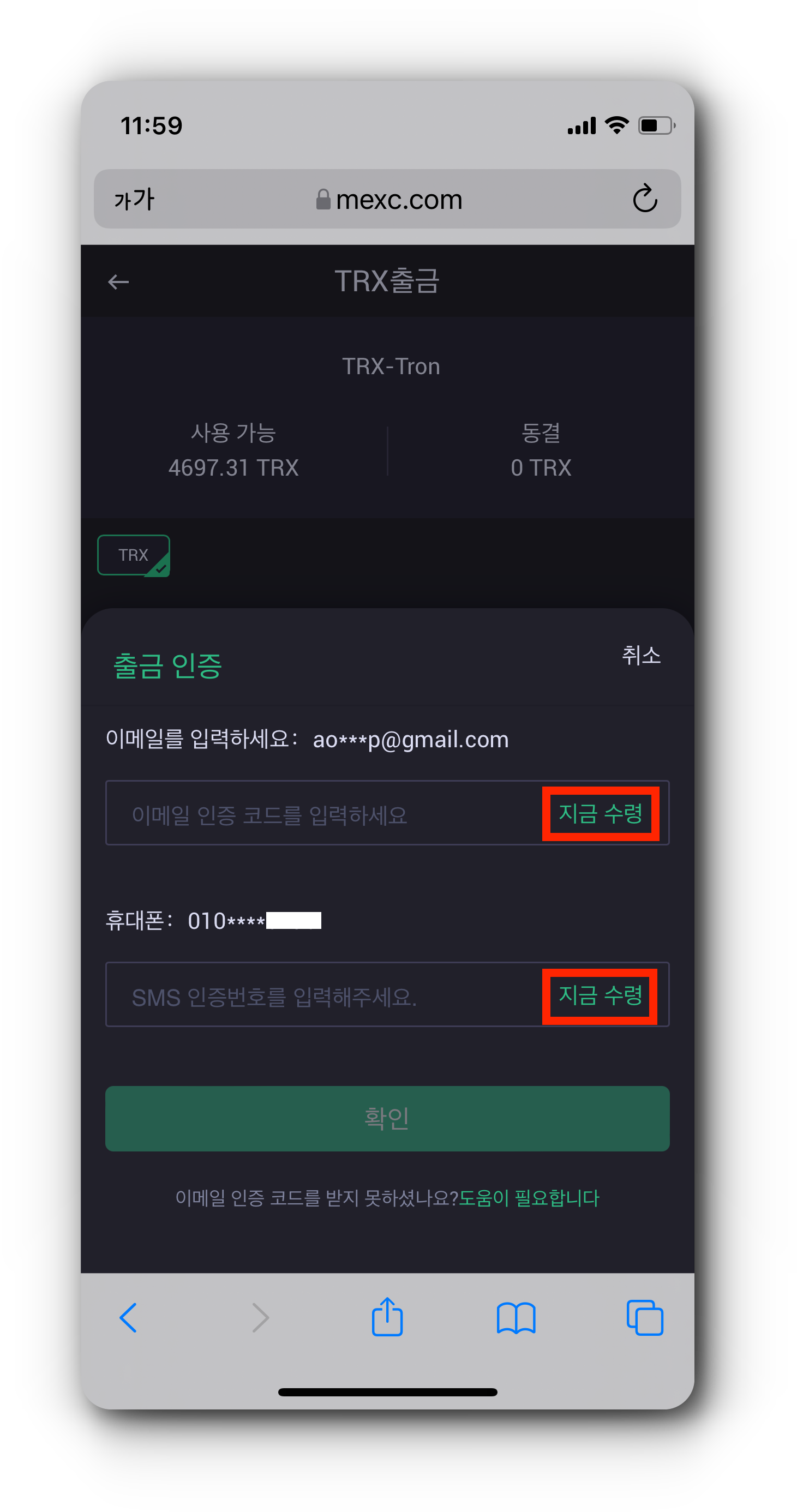 (4) 출금하기 위해선 출금 인증 과정을 진행해야 합니다. '휴대폰 바인딩'이나 'Google 인증기 바인딩'을 눌러 인증을 진행해 주세요. 저는 휴대폰 바인딩으로 인증했는데 이 경우 출금할 때 휴대폰 인증번호와 이메일 인증번호를 동시에 입력해야 합니다. '지금 수령' 버튼을 눌러 인증하면 출금 신청 제출이 완료됩니다.