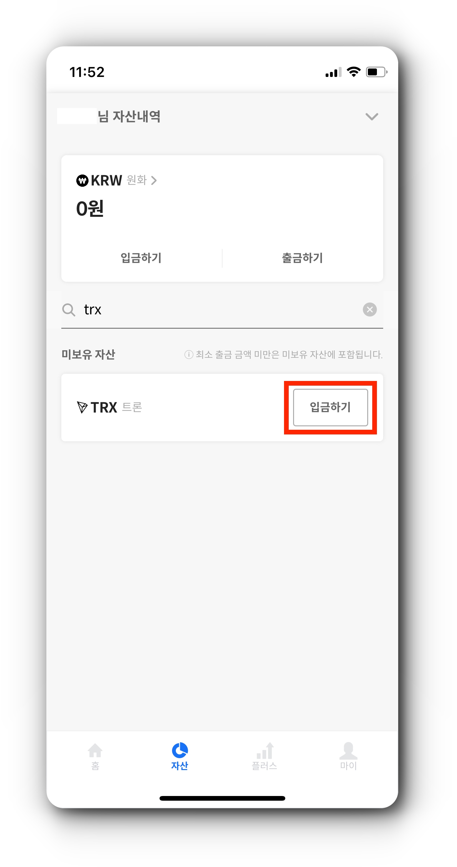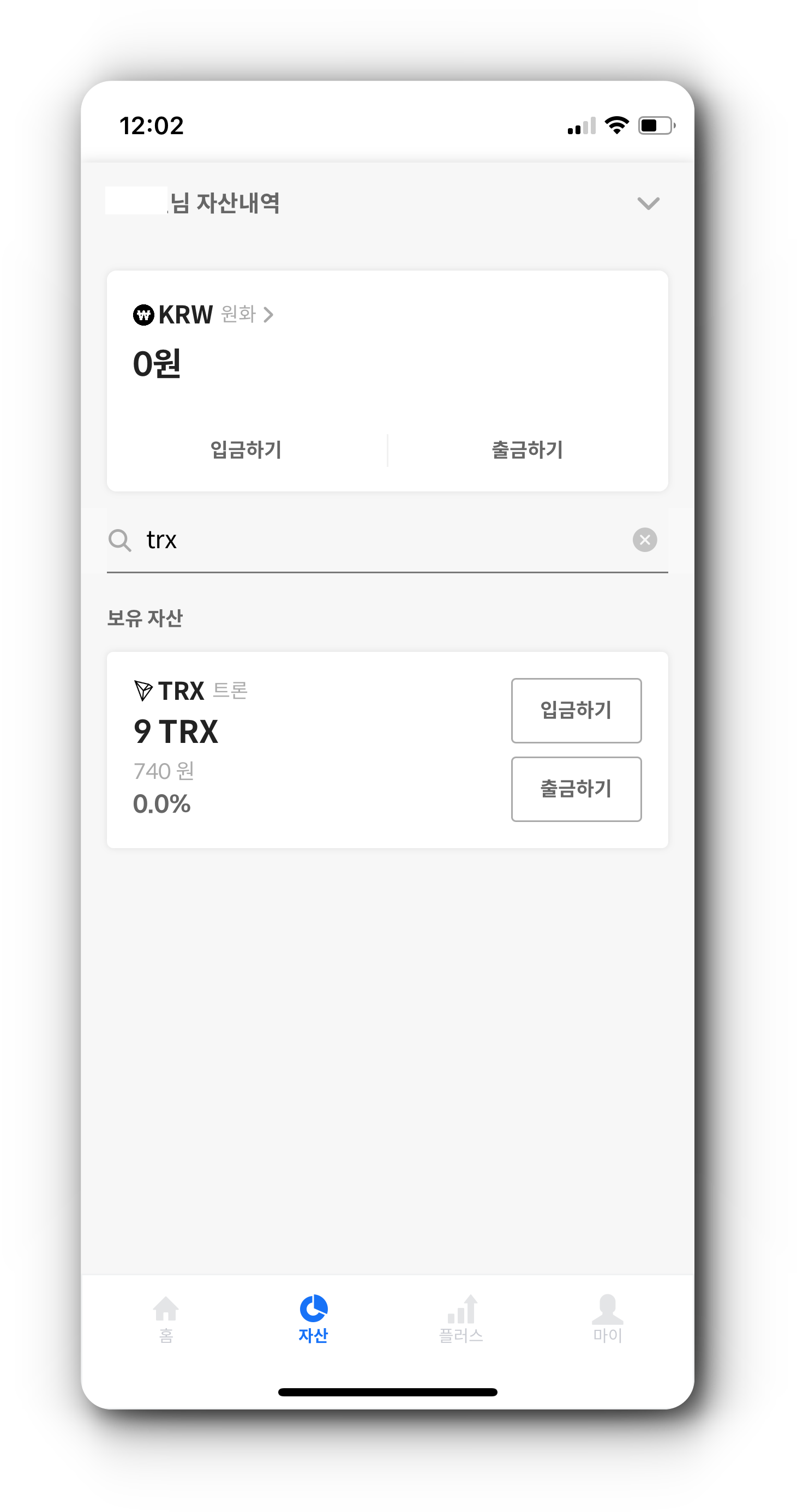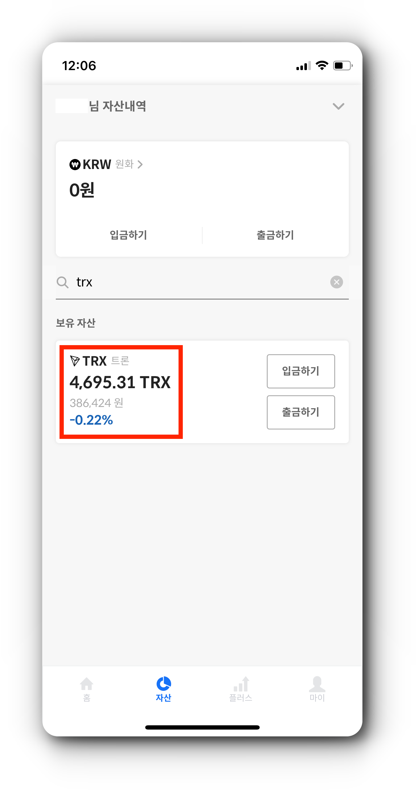 (1) 자산 탭에서 매수한 TRX를 누르면 출금할 수 있습니다. '출금' 버튼을 눌러줍니다.