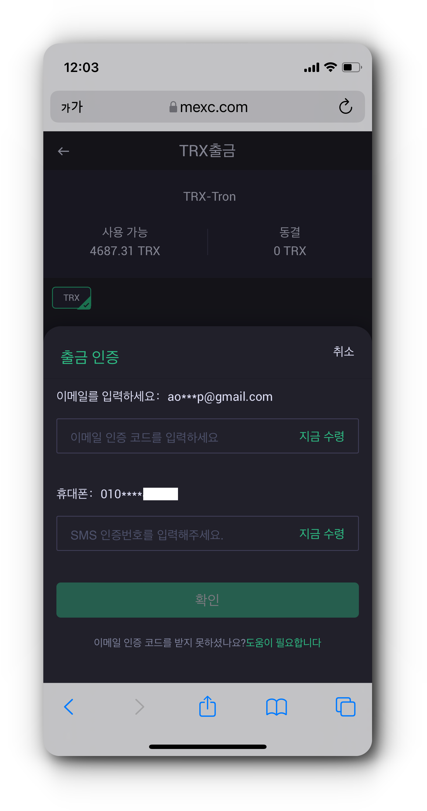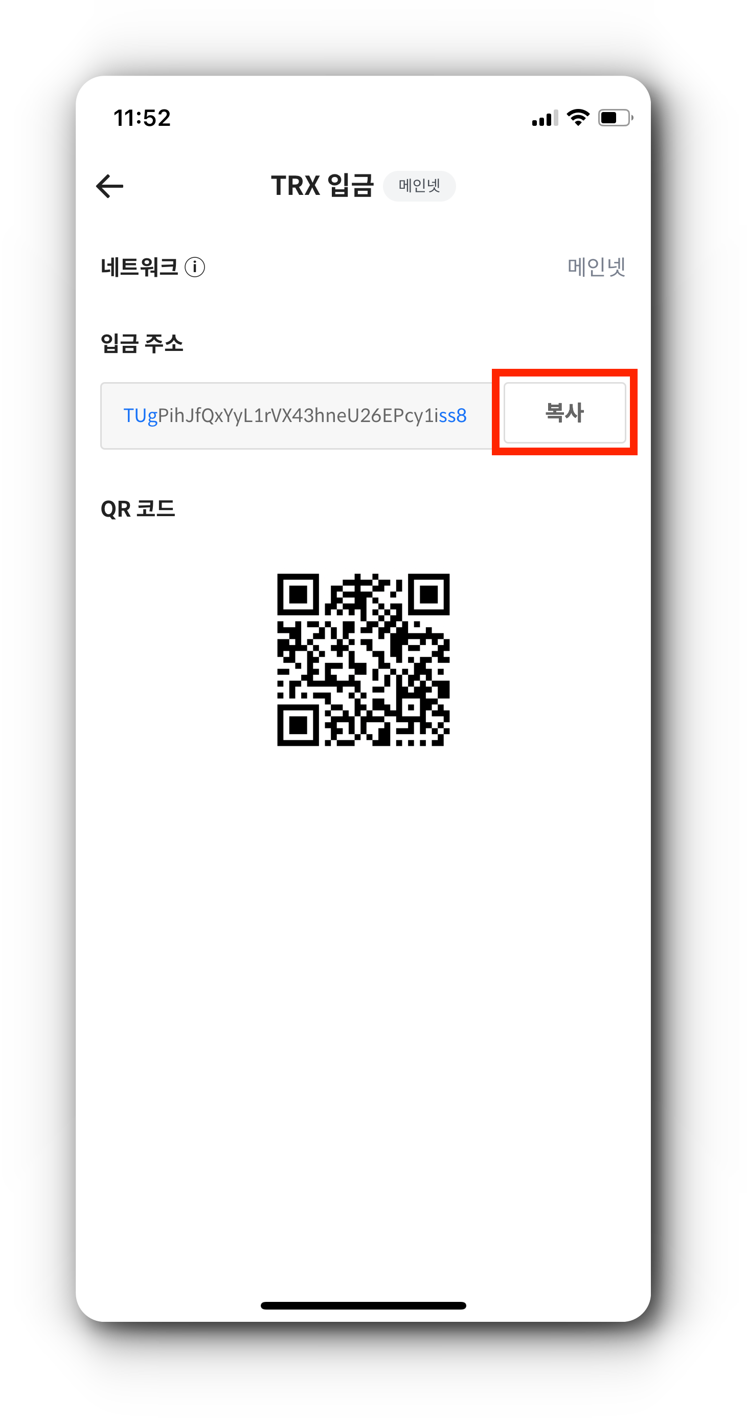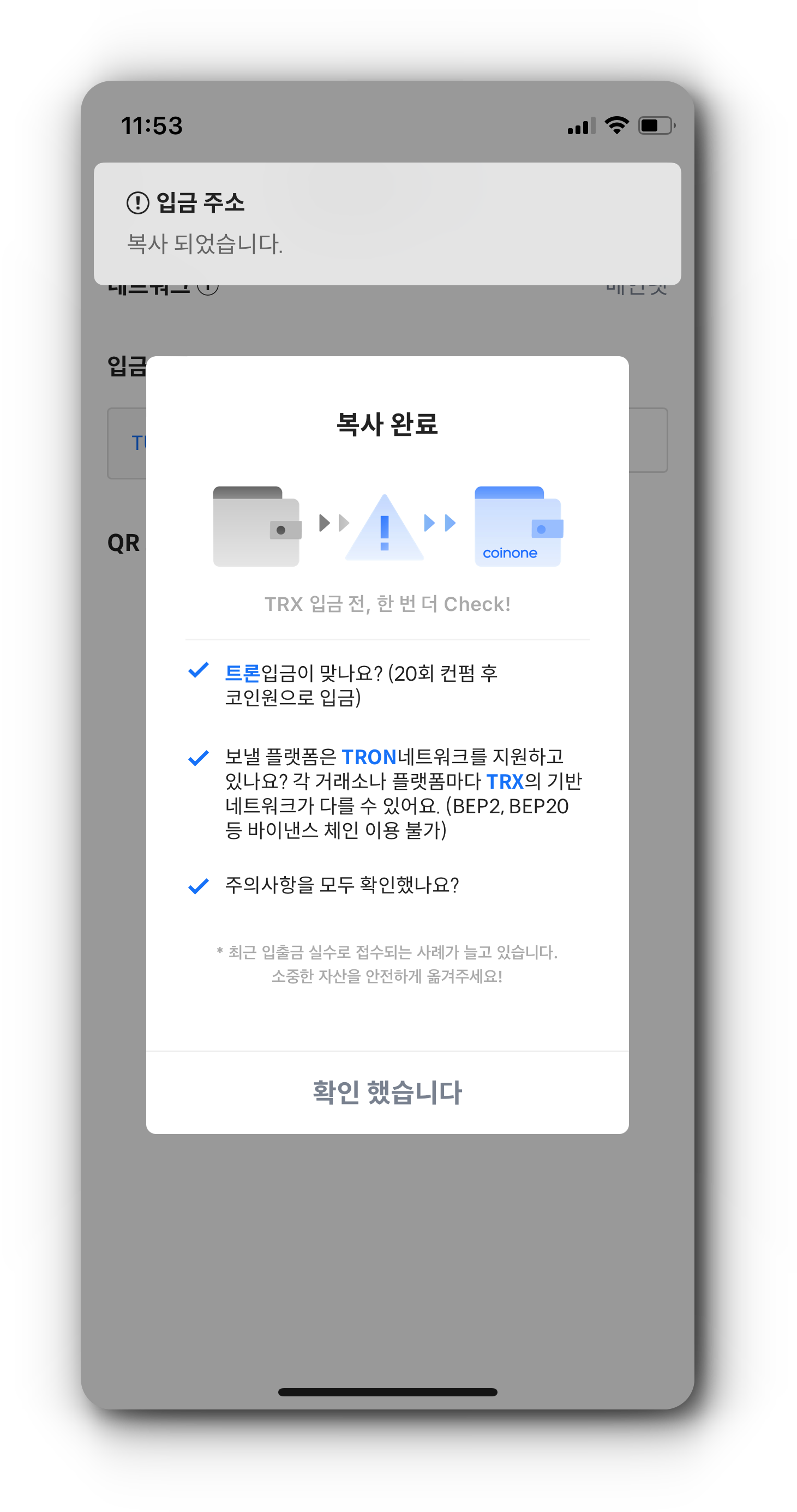 6. 매수한 TRX를 코인원 지갑 주소로 입금하기