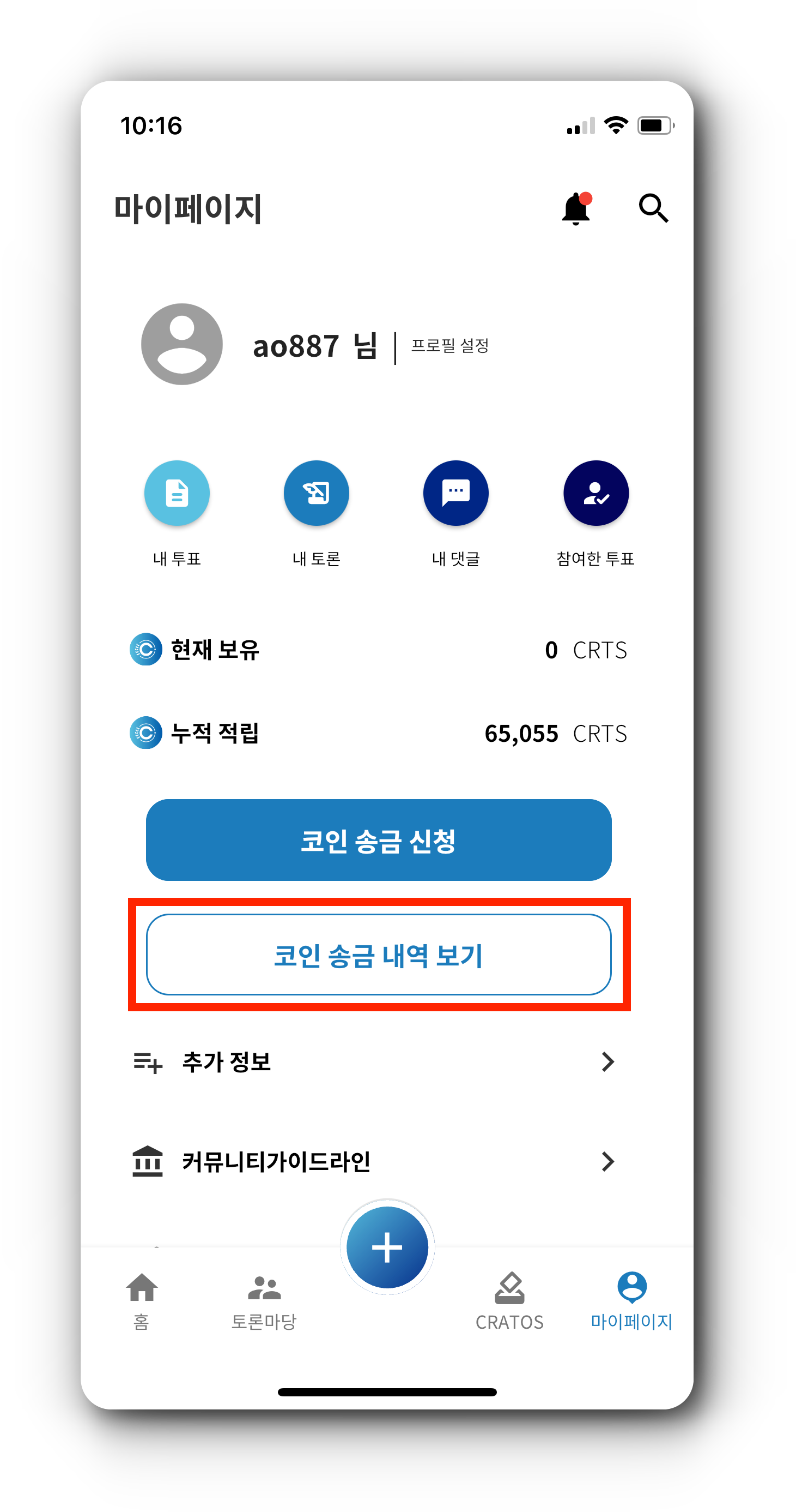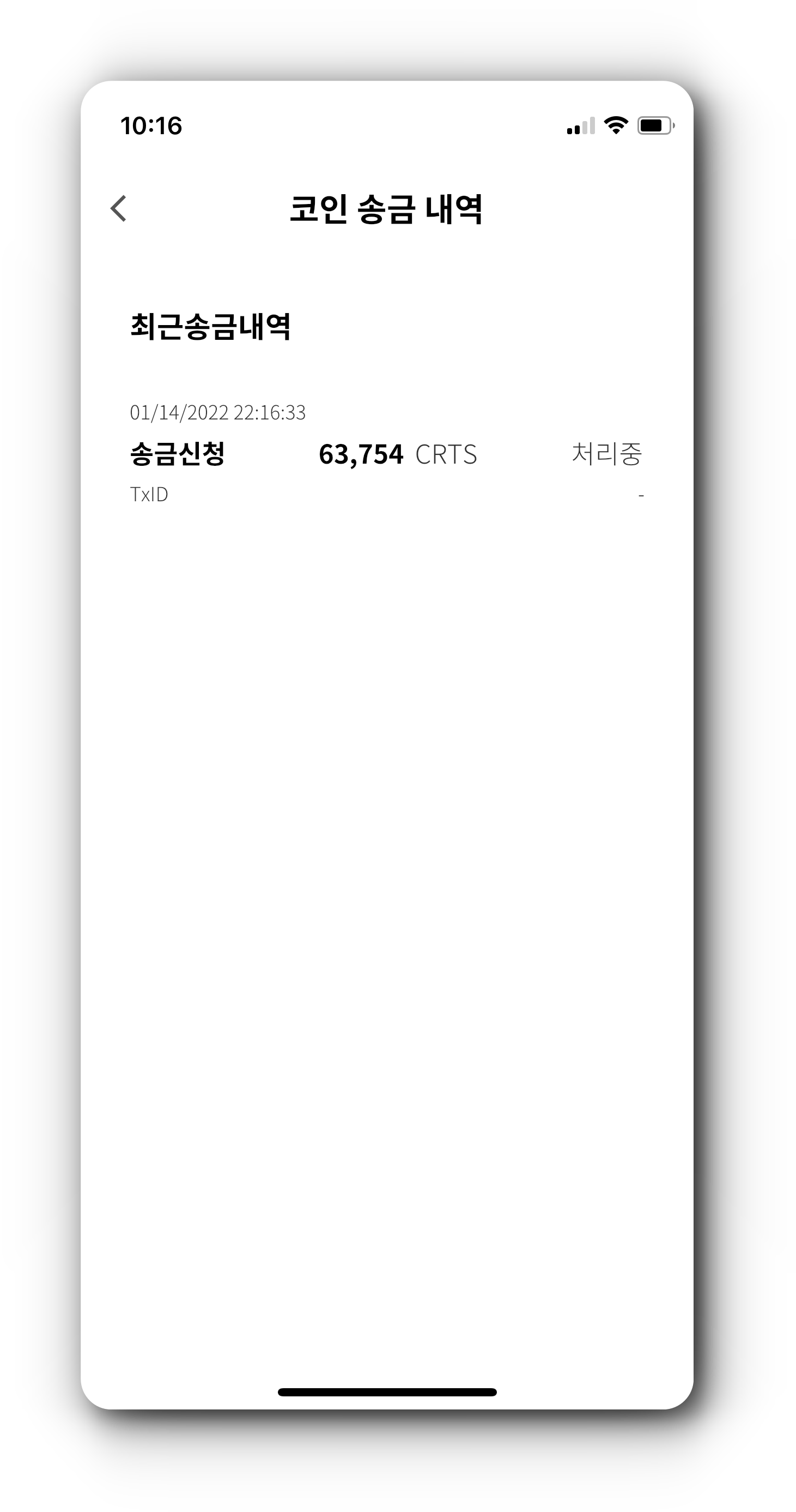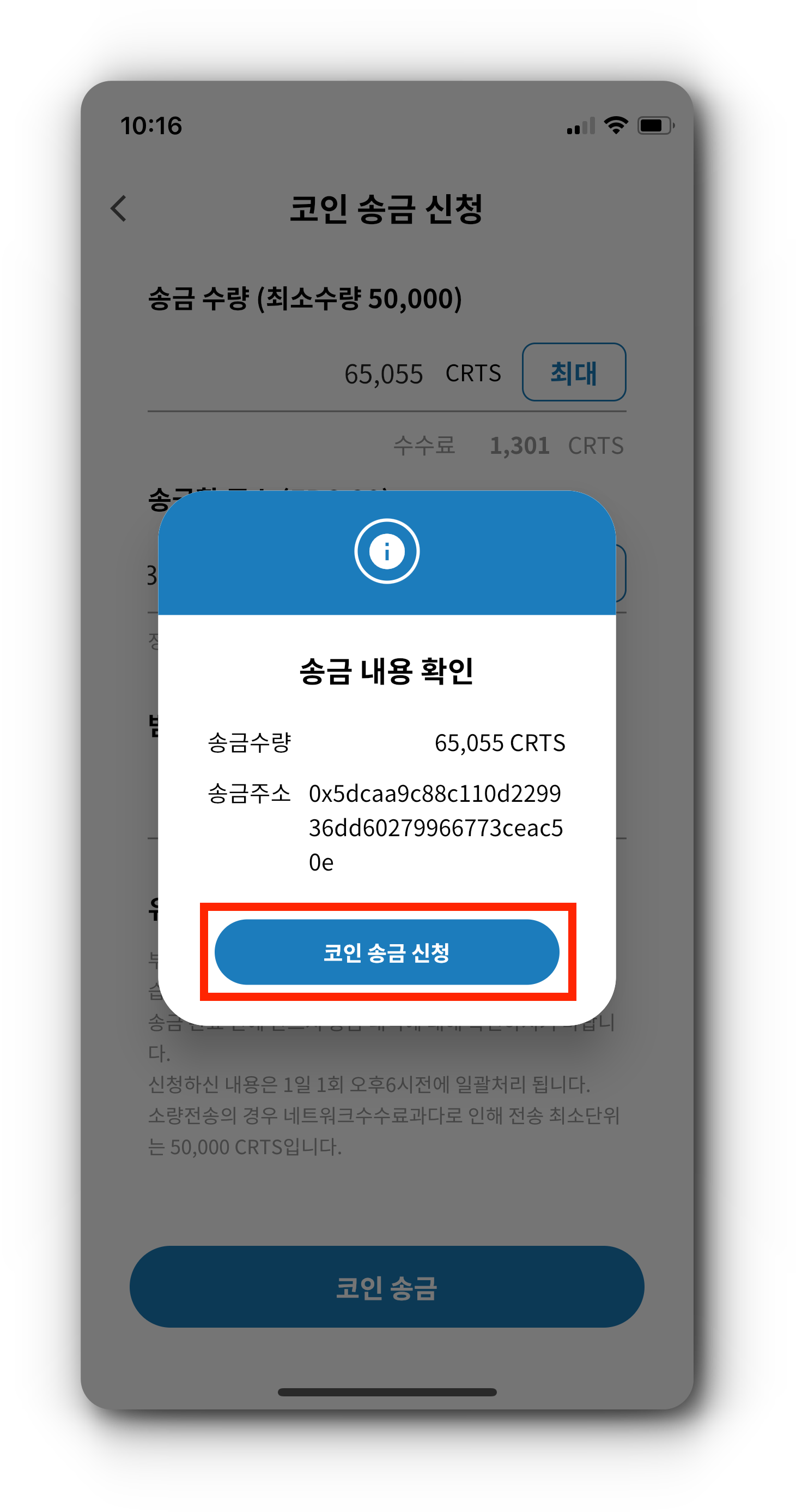 4. CRTS 코인 송금 신청이 완료된 경우