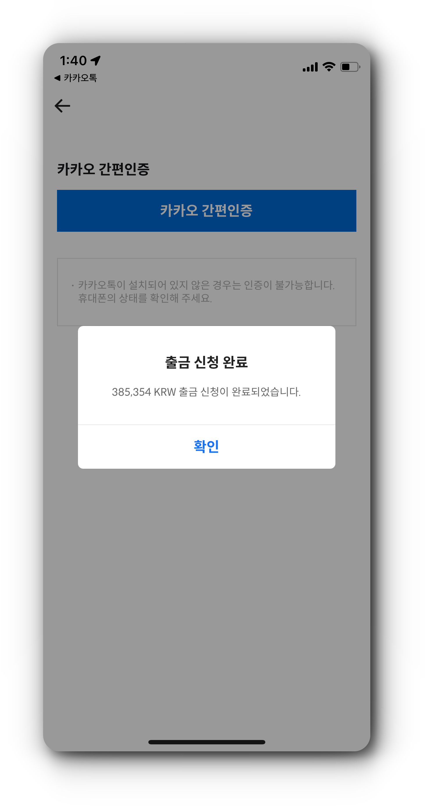 (2) '출금신청'을 누르고 '카카오 간편인증'을 진행해 주세요.
