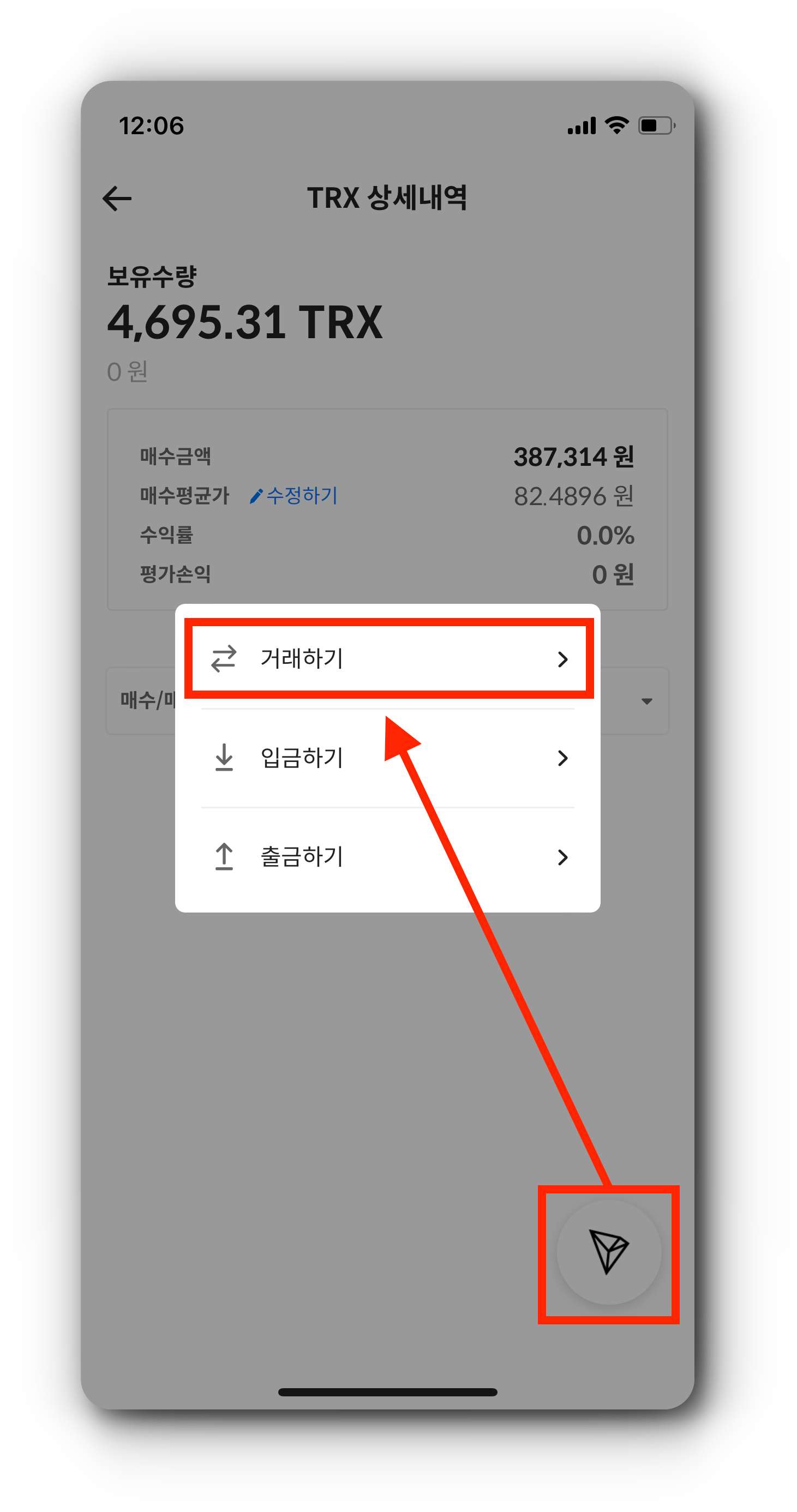 (1) TRX 전량이 코인원 지갑으로 입금된 경우, TRX를 터치하고 '거래하기' 페이지로 이동해 줍니다.