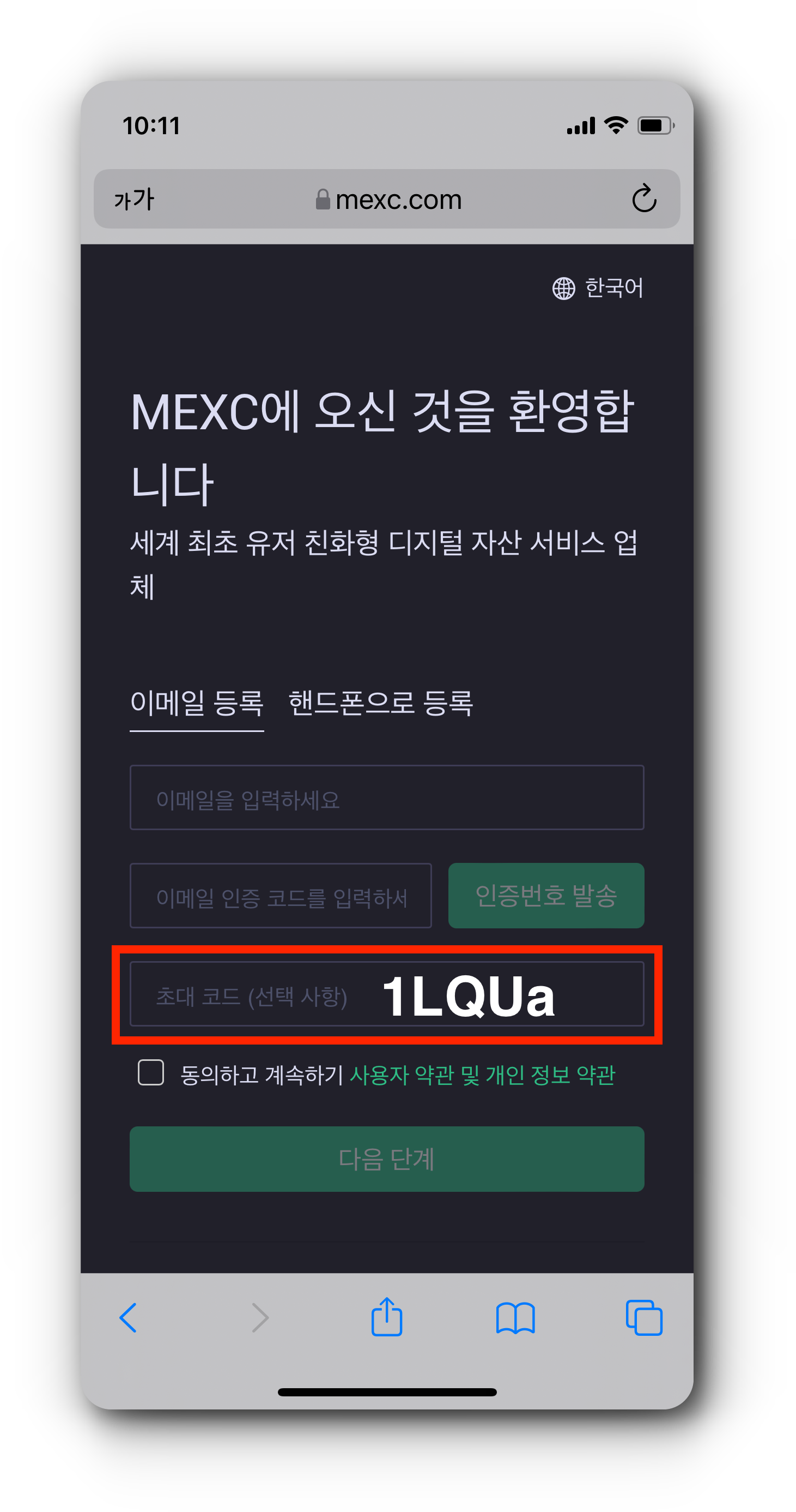(1) MEXC 가입 링크로 접속하여 회원가입을 진행해 주세요. 가입 링크로 이동하게 되면 수수료 10% 감면 혜택이 주어지는 초대코드 1LQUa가 자동으로 입력됩니다. 이메일이나 휴대폰 번호로 가입을 진행하게 되고, 비밀번호를 설정하면 가입이 완료됩니다.