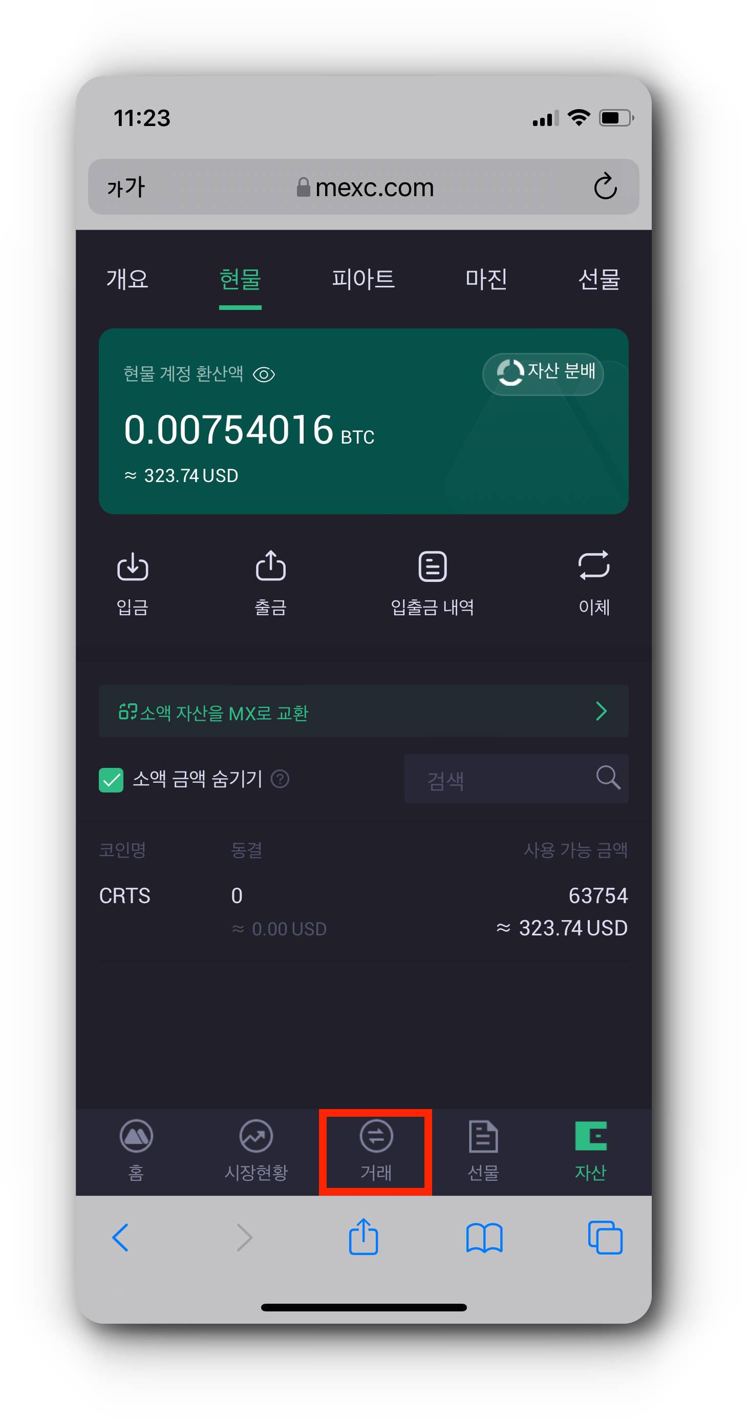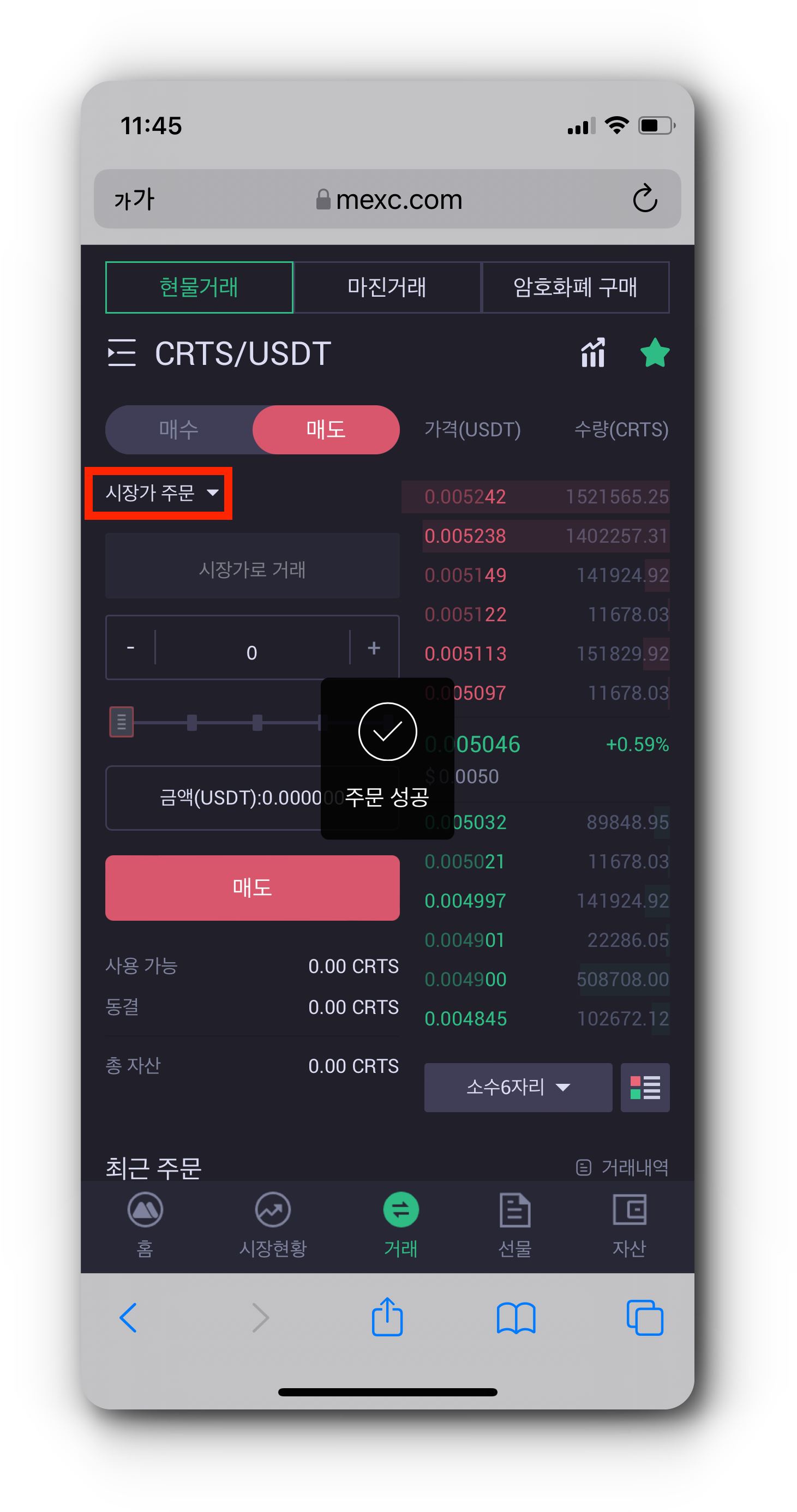(1) MEXC '자산' 탭에서 CRTS가 입금된 것을 확인했으면 이제 CRTS를 매도해야 합니다. 위 사진 순서대로 버튼을 눌러 CRTS 현물거래 페이지로 이동해 주세요.