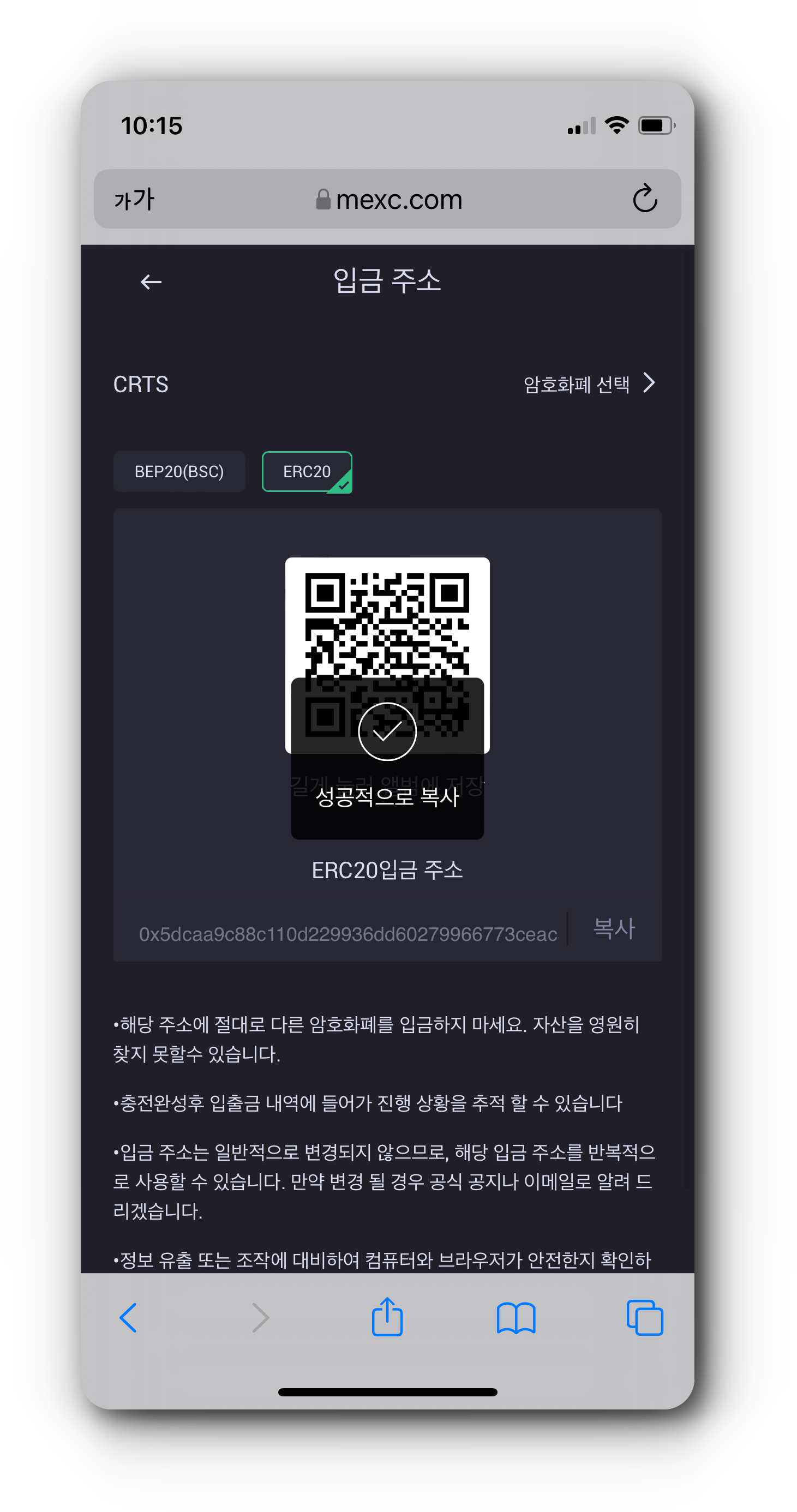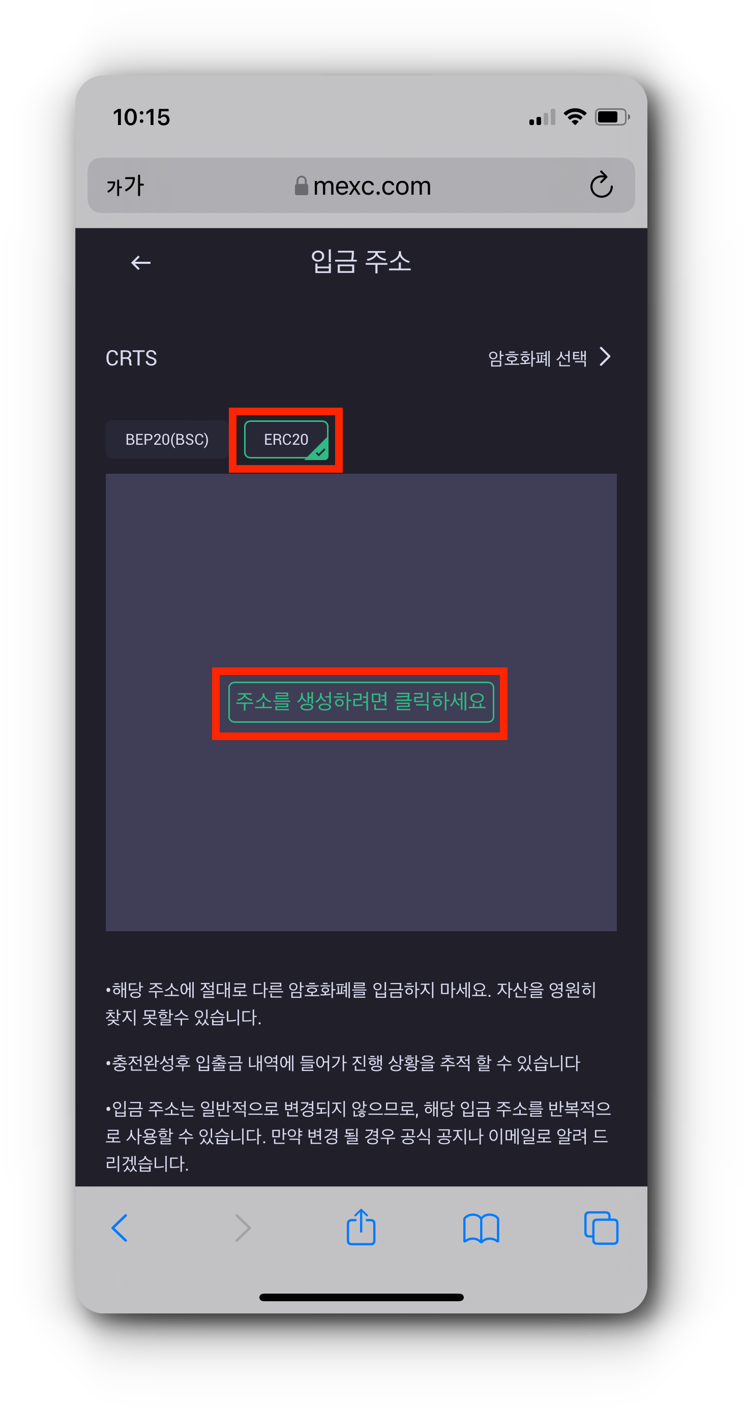 (2) CRTS 입금 주소 페이지에서 ERC20을 선택하고 주소를 생성해 주세요. 그리고 ERC20입금 주소를 복사해줍니다.