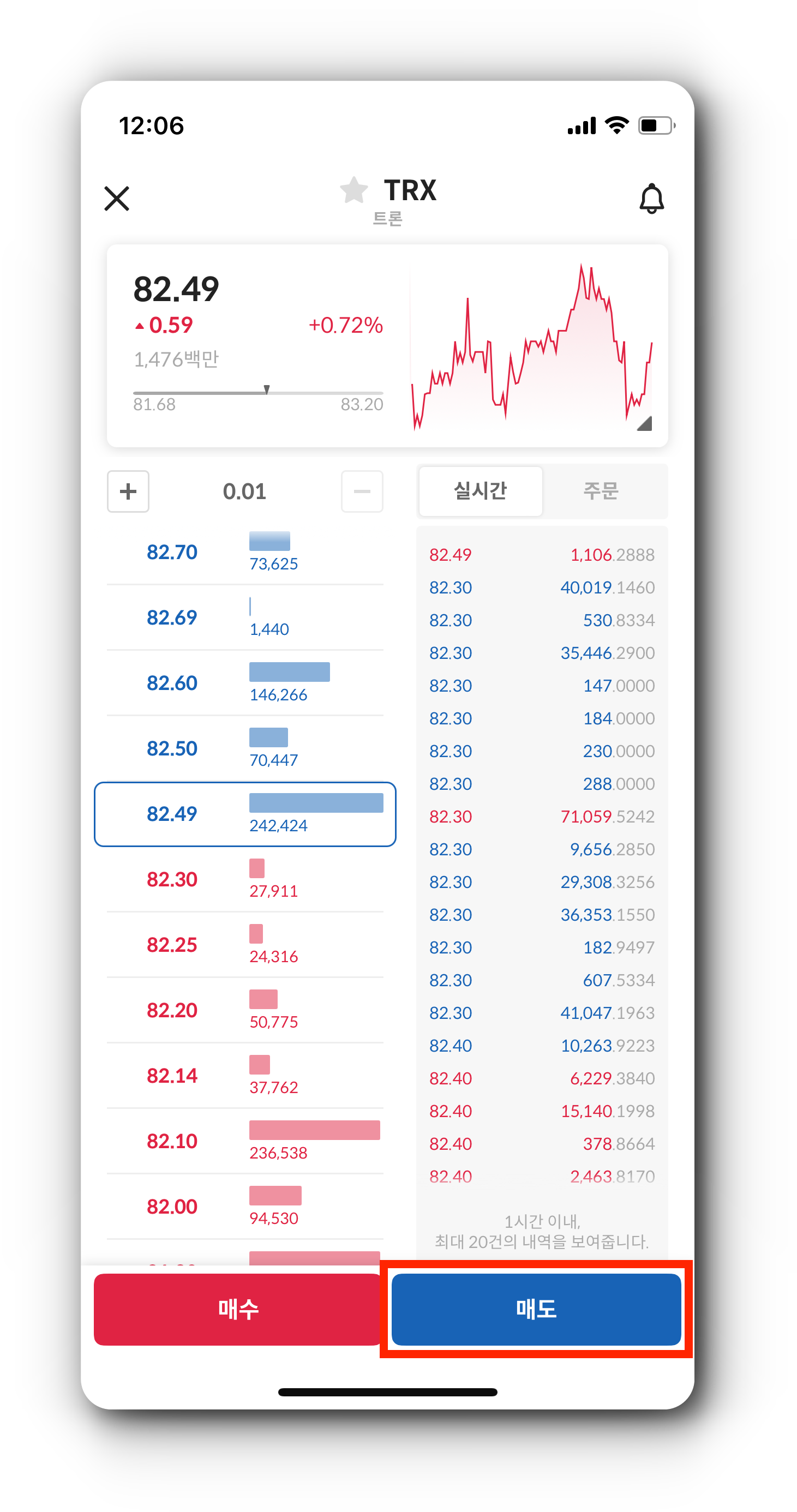 (2) '매도' 버튼을 터치하고 가격과 수량을 선택한 다음 '매도 금액' 버튼을 눌러주세요.
