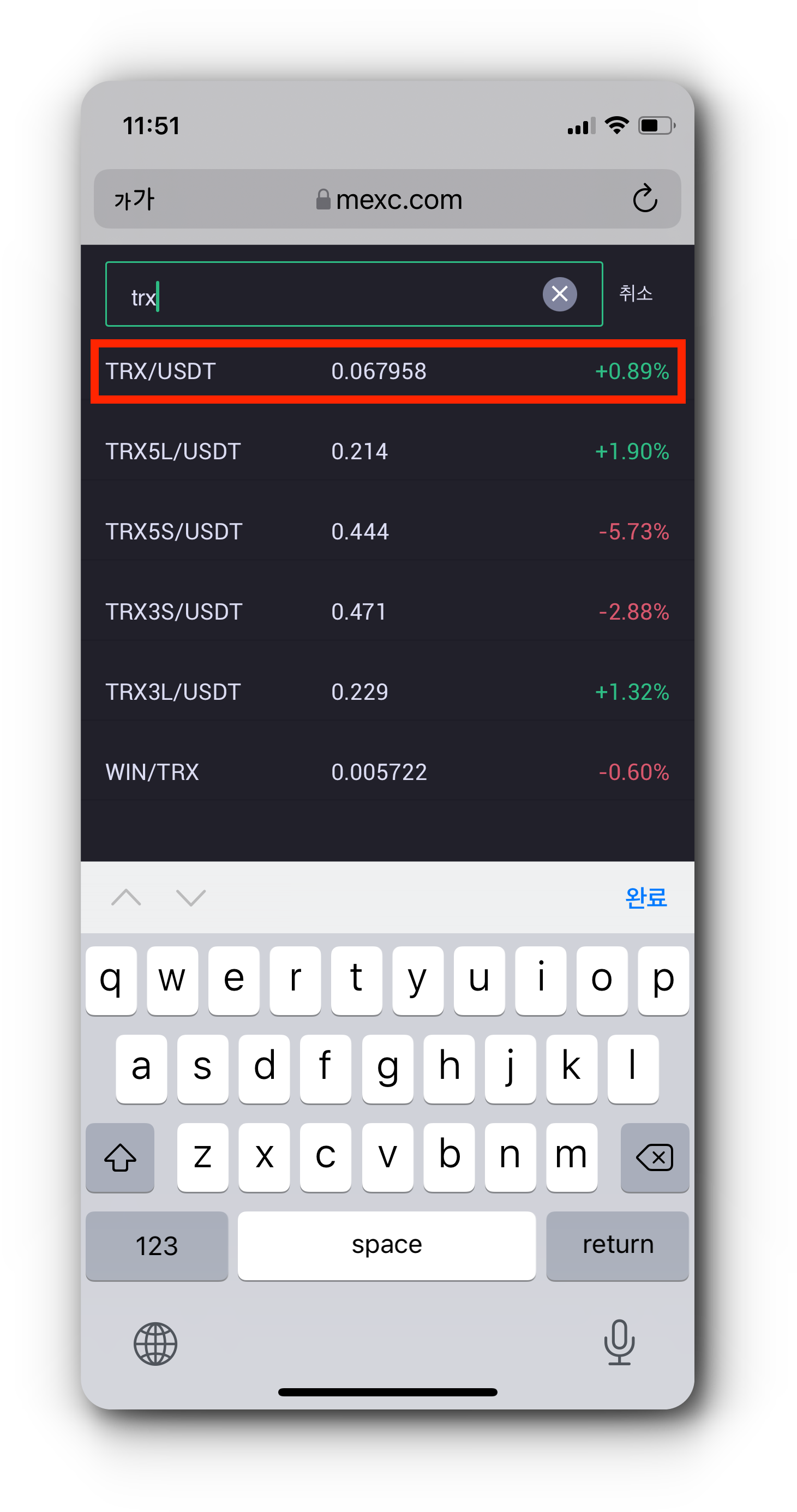 (1) 수수료가 적게 드는 TRX(트론)를 매수합니다. 홈 화면 검색창에서 TRX/USDT를 입력하고 '매수'를 눌러주세요.