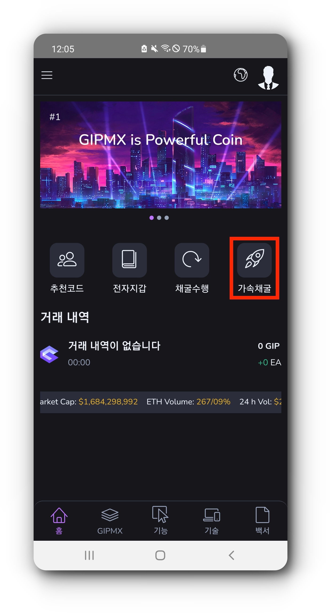 - '가속채굴' 페이지로 이동한 뒤 '가속 채굴'을 누르면 10분간 채굴이 가속됨