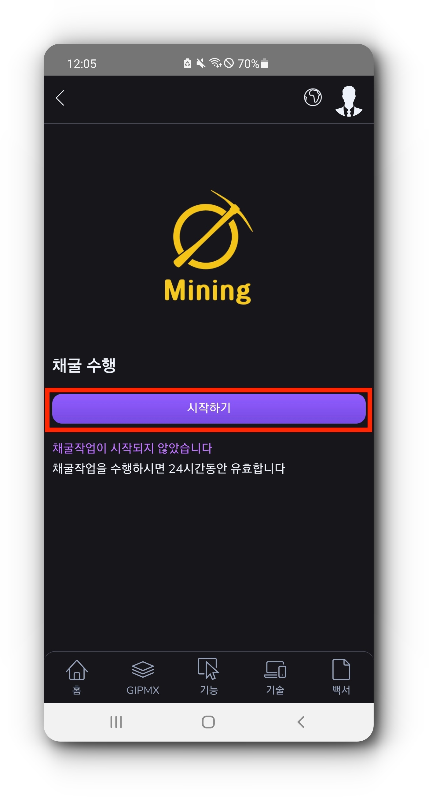 - 홈 화면에서 '채굴수행' 페이지로 이동한 뒤 '시작하기' 버튼을 누르면 채굴할 수 있음