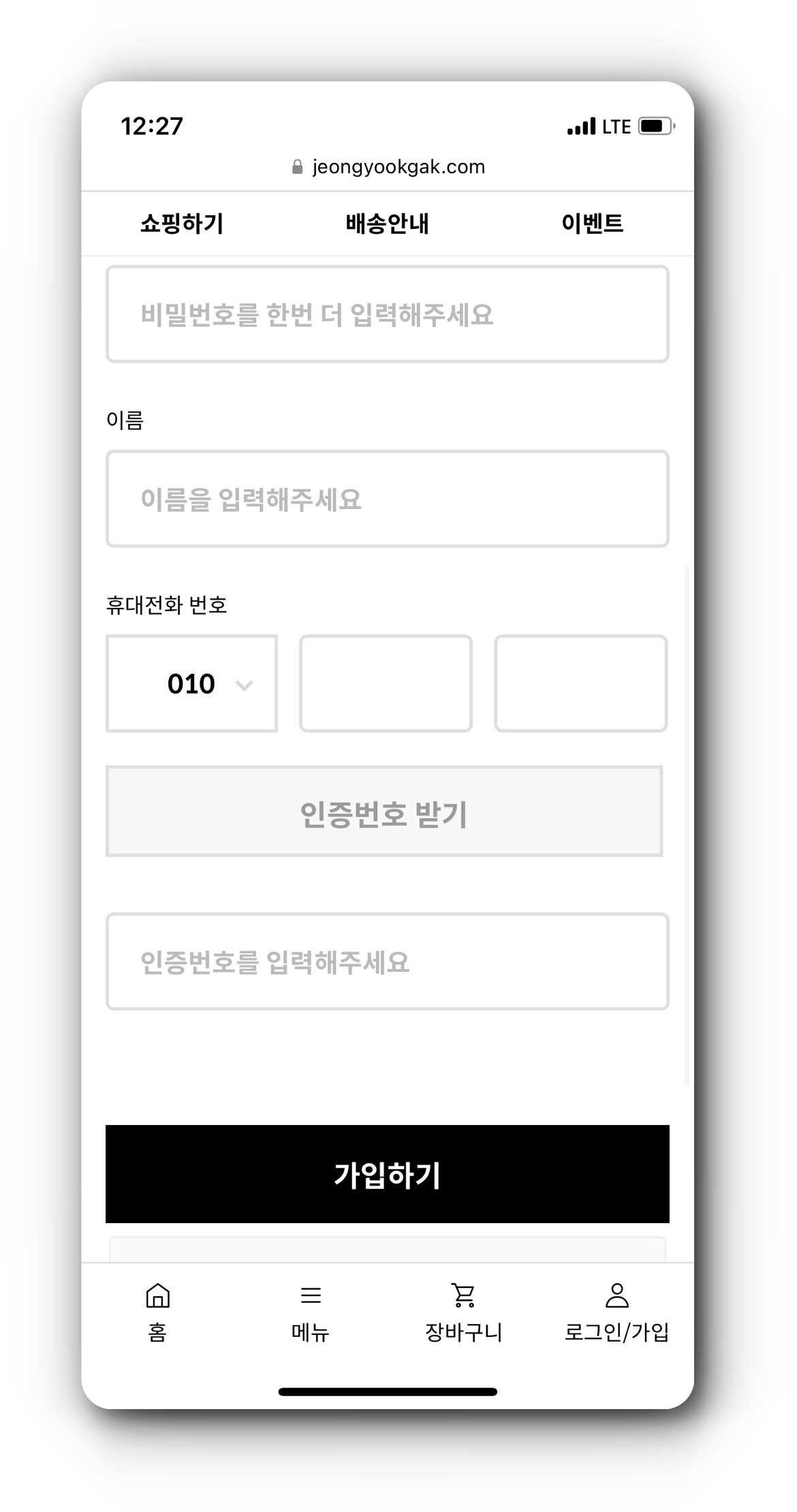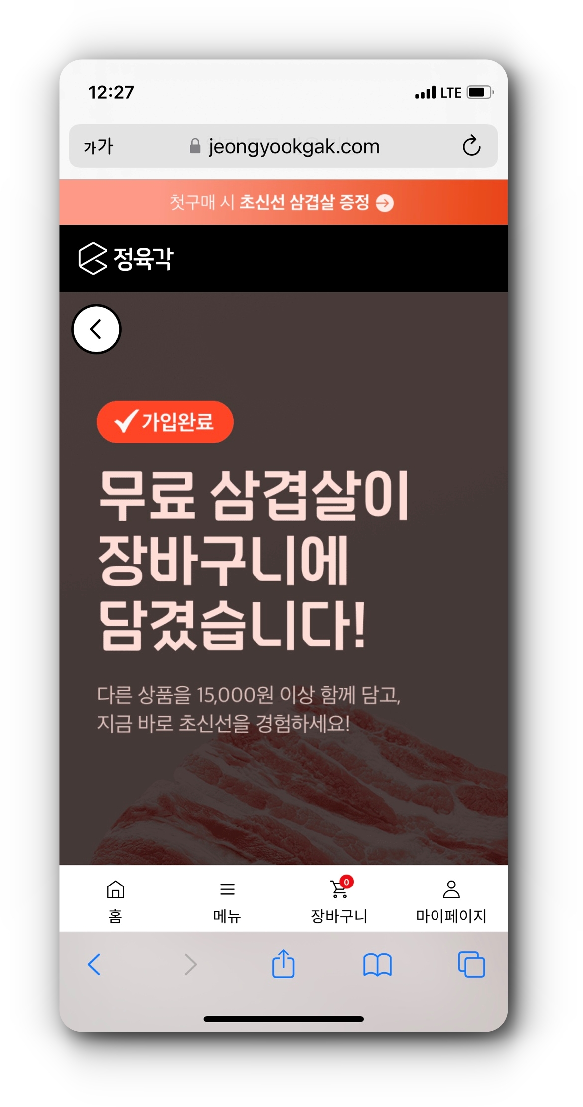 정육각 회원가입 페이지에서 아이디와 비밀번호, 이름, 휴대전화 번호, 인증번호를 입력하면 가입이 완료된다. 회원가입과 동시에 자동으로 무료 삼겹살이 장바구니에 담기게 되는데, 다른 상품을 15,000원 이상 함께 장바구니에 담고 결제하면 무료로 삼겹살 300g을 구매할 수 있다.