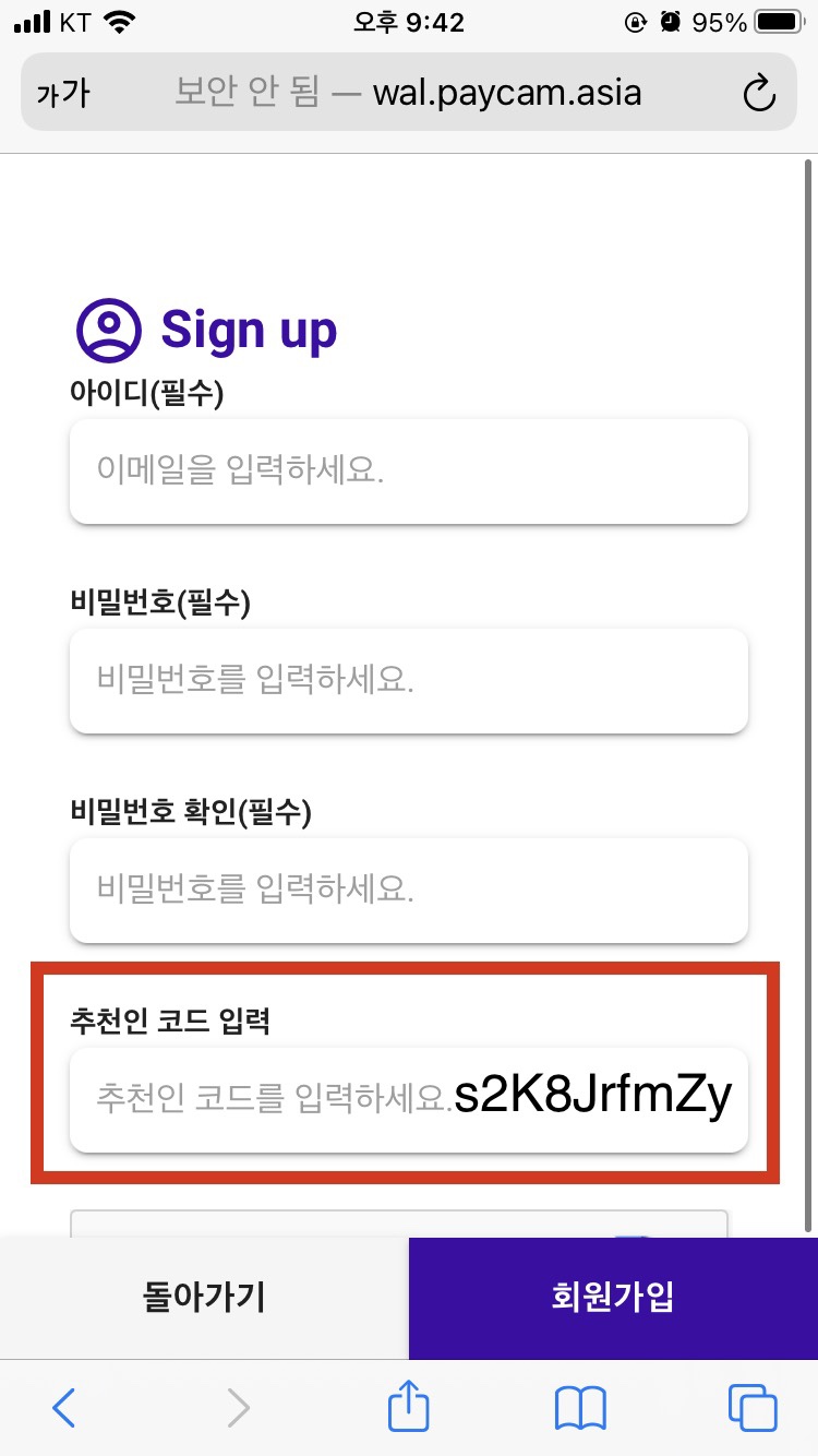 구글 검색창에 'PAYCAM Wallet'을 검색하고 사이트에 접속합니다. 그리고 회원가입을 진행해주세요. 회원가입 진행 도중 '추천인 코드 입력'란에 "s2K8JrfmZy"를 입력하시면 125PLI가 추가로 지급됩니다. 꼭 입력하시고 가입하세요.