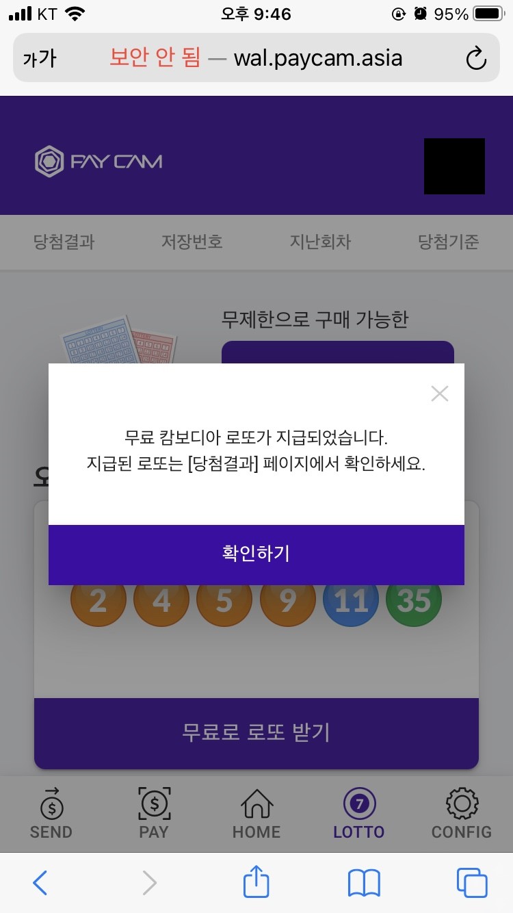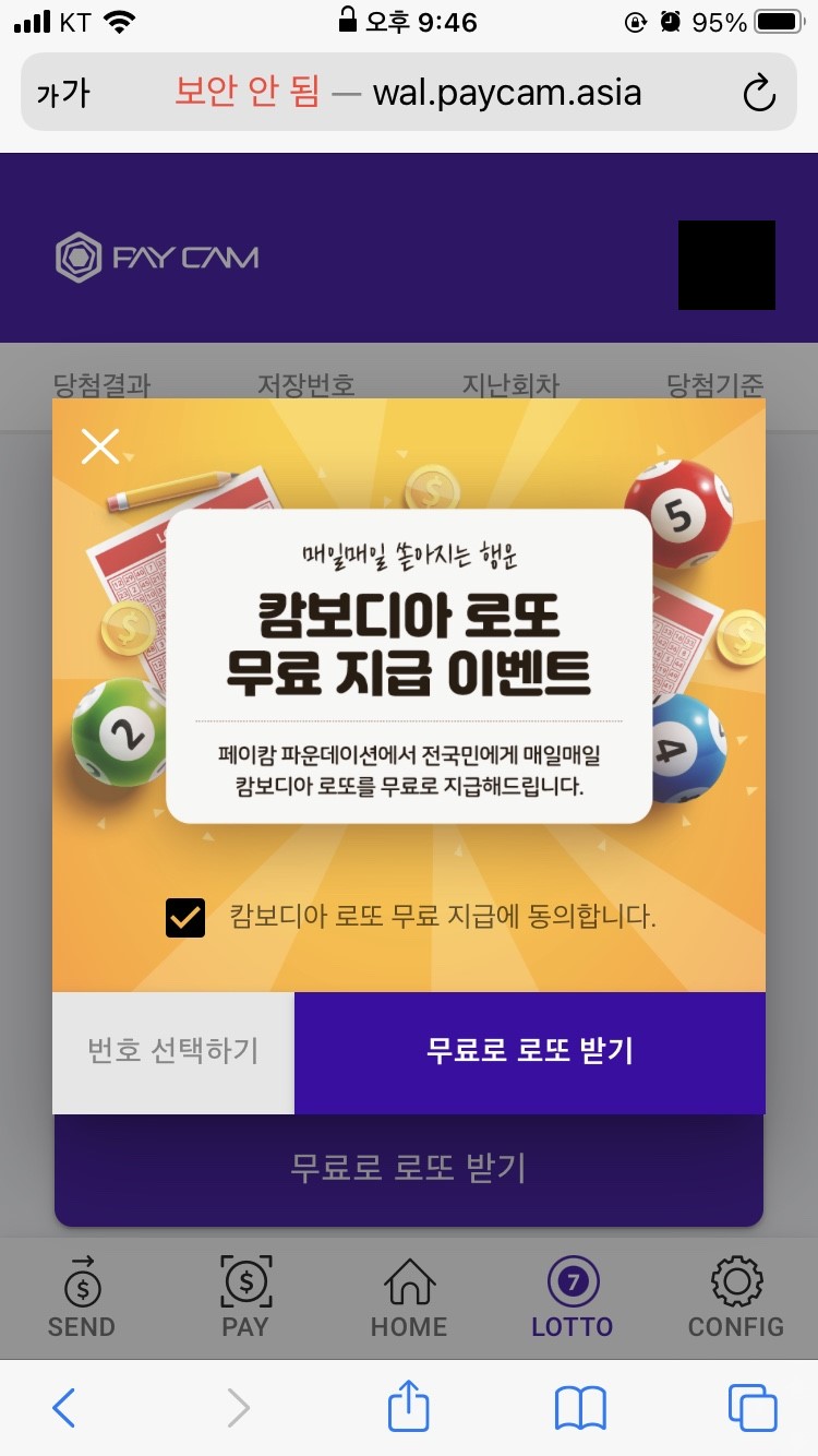 아래 4번째 탭 'LOTTO'가 보이시나요? 해당 탭에 들어가셔서 무료로 로또 받기를 클릭하세요. 그리고 캄보디아 로또 무료 지급에 동의하신 후 무료로 로또 받기를 누르시면 무료 로또 1개가 지급됨과 동시에 출석체크가 완료됩니다.