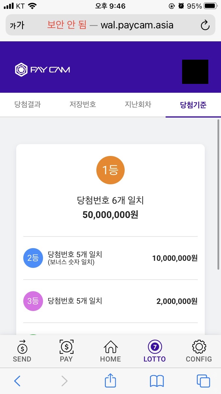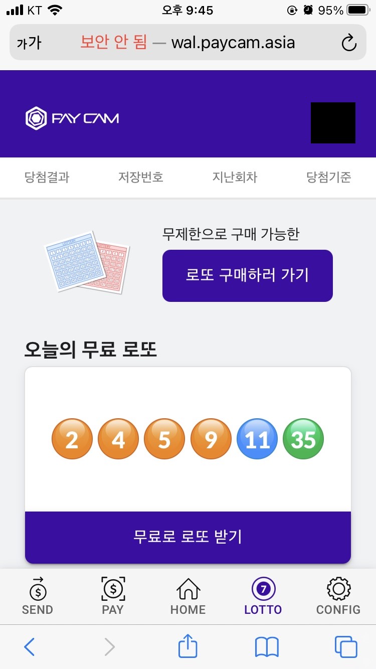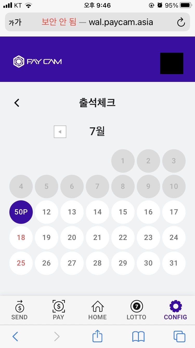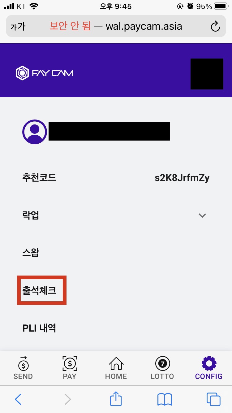 로또를 발급받고 나서, 'CONFIG' 탭의 출석체크로 들어오시면 출석체크가 완료되었는지 확인하실 수 있습니다.