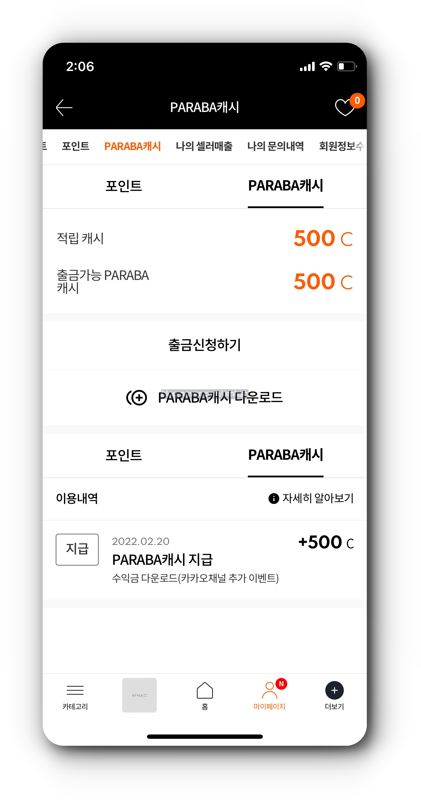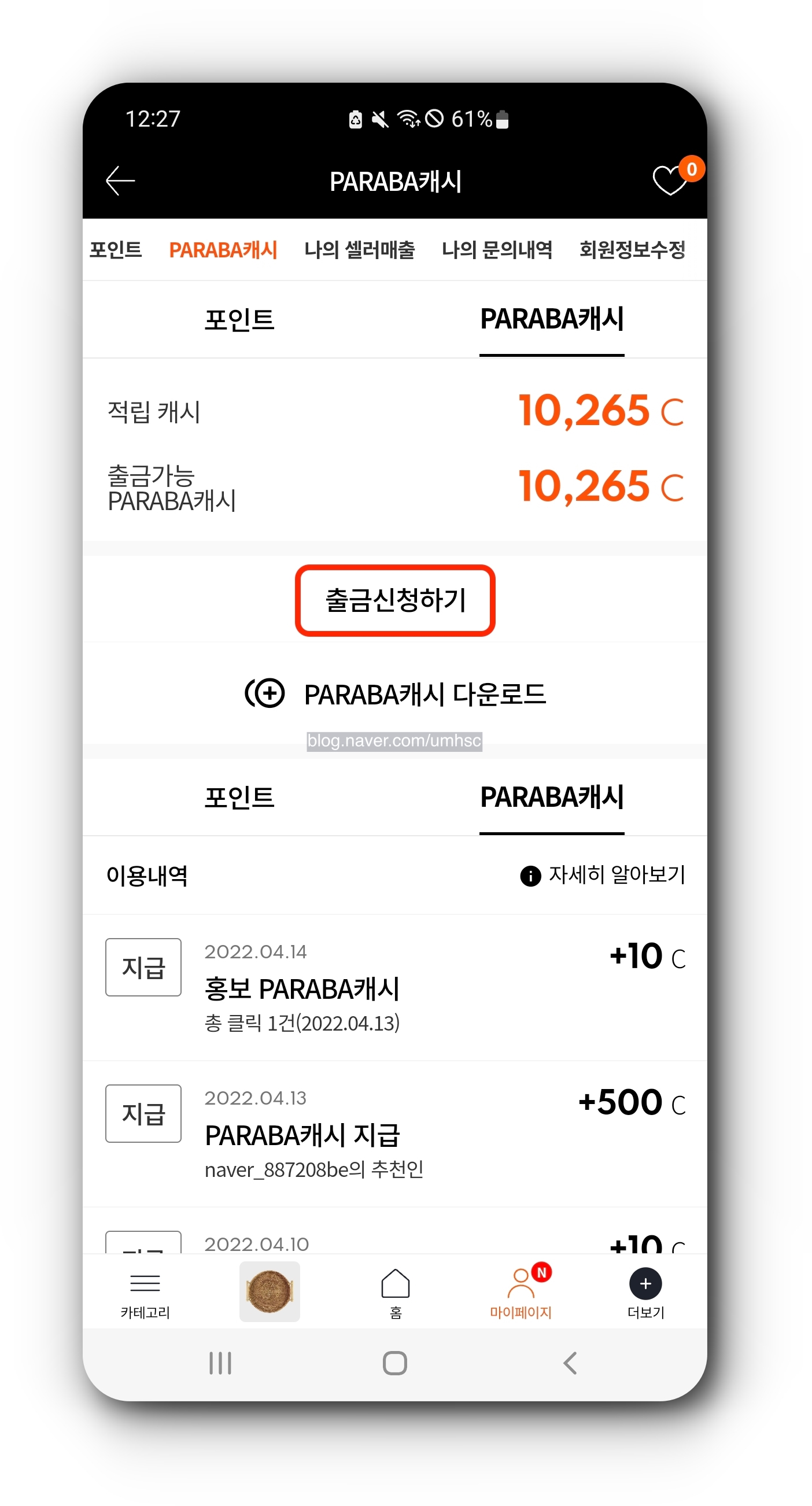 [마이페이지] > [PARABA캐시] > [출금신청하기]로 이동하여 입금자명과 주민등록번호, 입금통장정보와 입금안내 연락처를 기재하고 [출금신청하기]를 터치하면 된다.