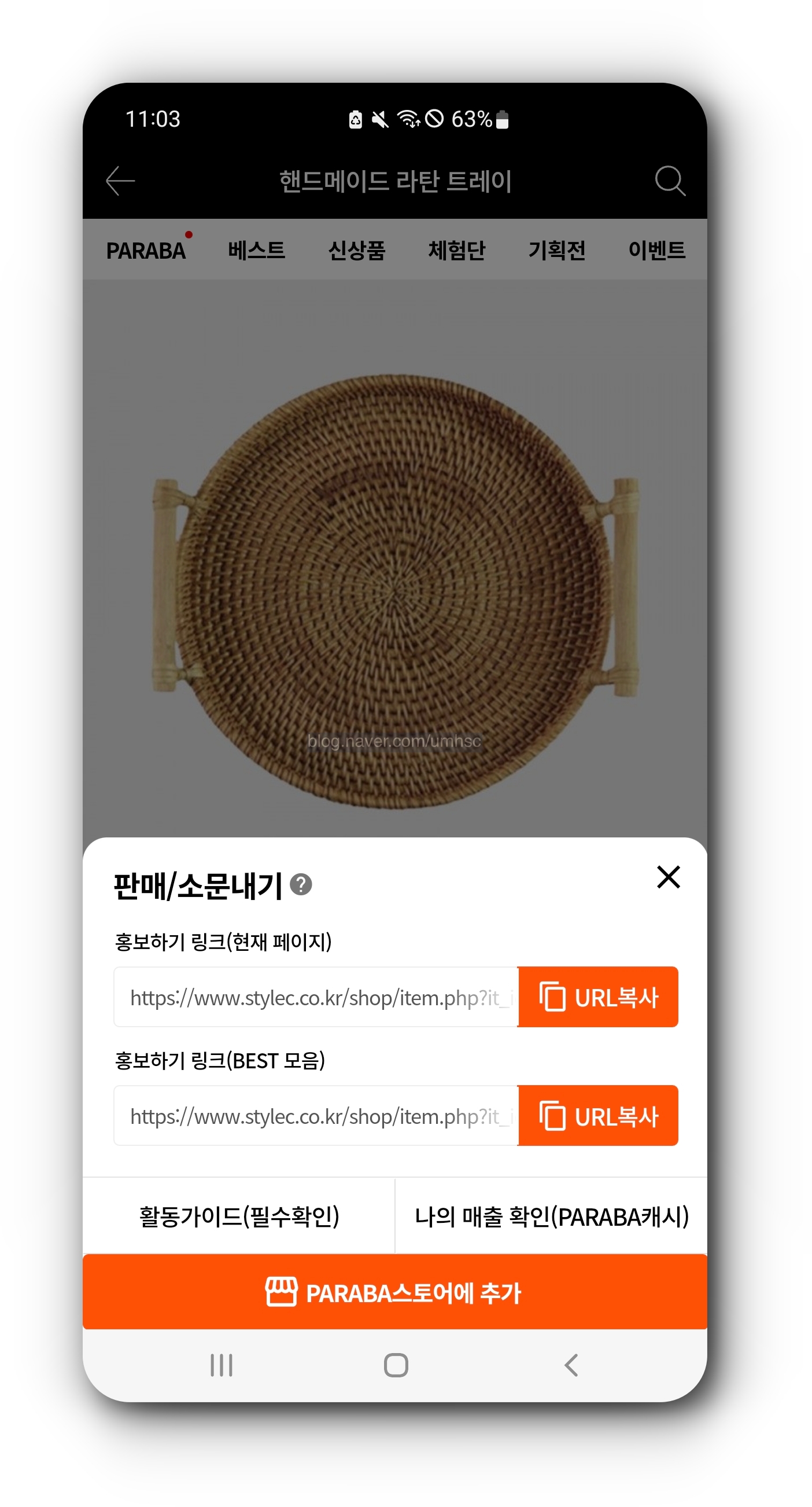 오른쪽 사진과 같이 리뷰를 작성한 다음 상품 링크를 작성하는데, 이것은 아래 오른쪽 사진에서 보는 바와 같이 판매/소문내기의 홍보하기 링크이다.