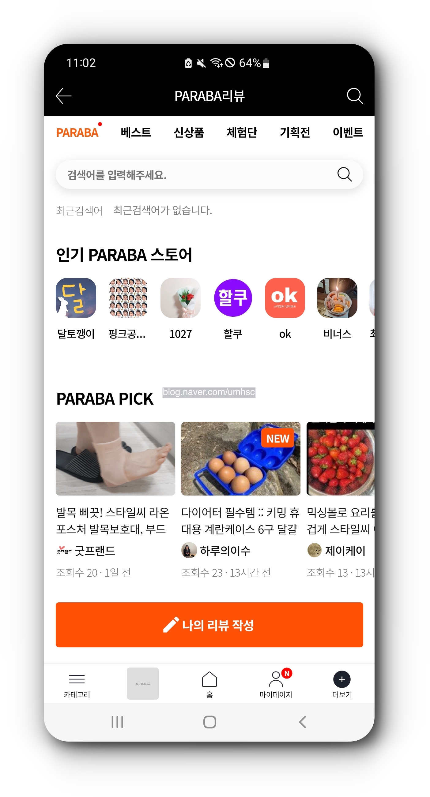 스타일씨 홈 화면에서 다른 유저들이 작성한 리뷰를 보거나 나의 리뷰를 작성할 수 있다. 리뷰를 작성할 때 사진 장수와 글자 수 등의 조건이 일부 존재한다.