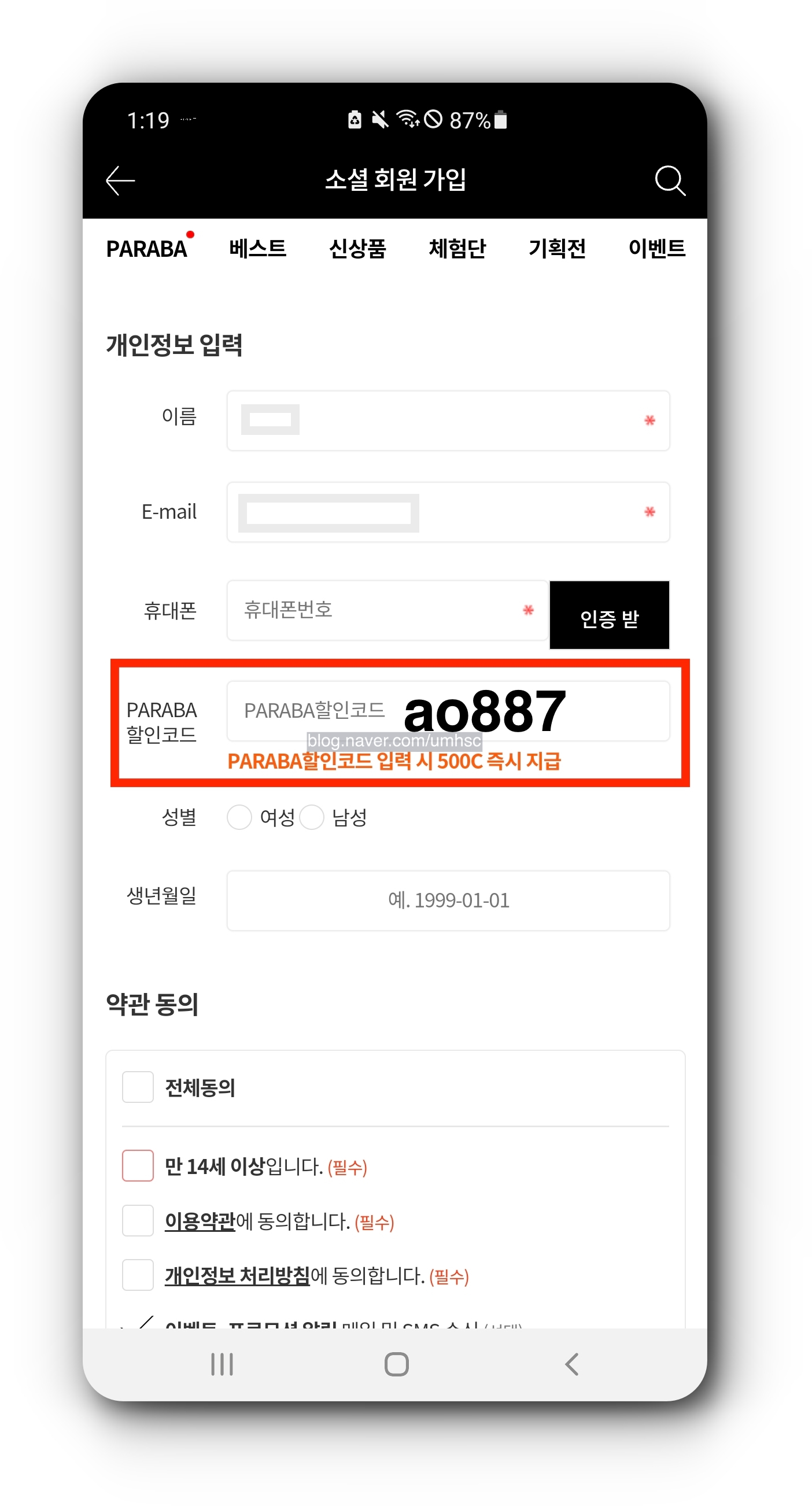 회원가입 페이지에서 PARABA할인코드 입력란에 ao887을 입력하면 500C가 즉시 지급된다. 회원가입 페이지말고 상품 결제 페이지에서도 PARABA할인코드를 입력할 수 있는데 여기서도 ao887을 입력하면 결제 금액에 따라 할인 혜택을 받을 수도 있다.