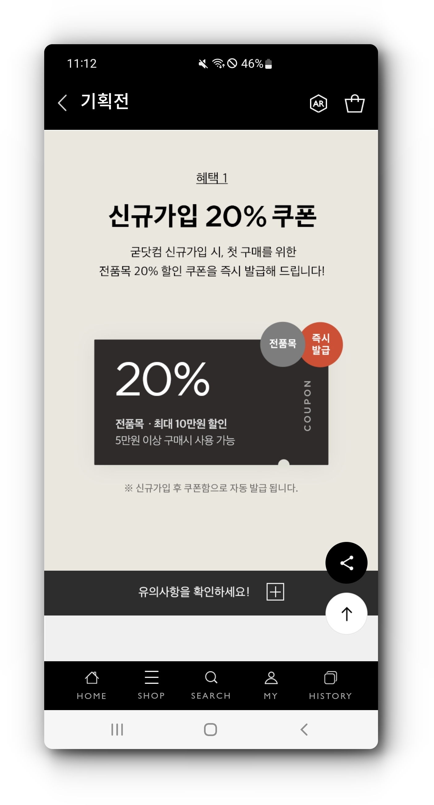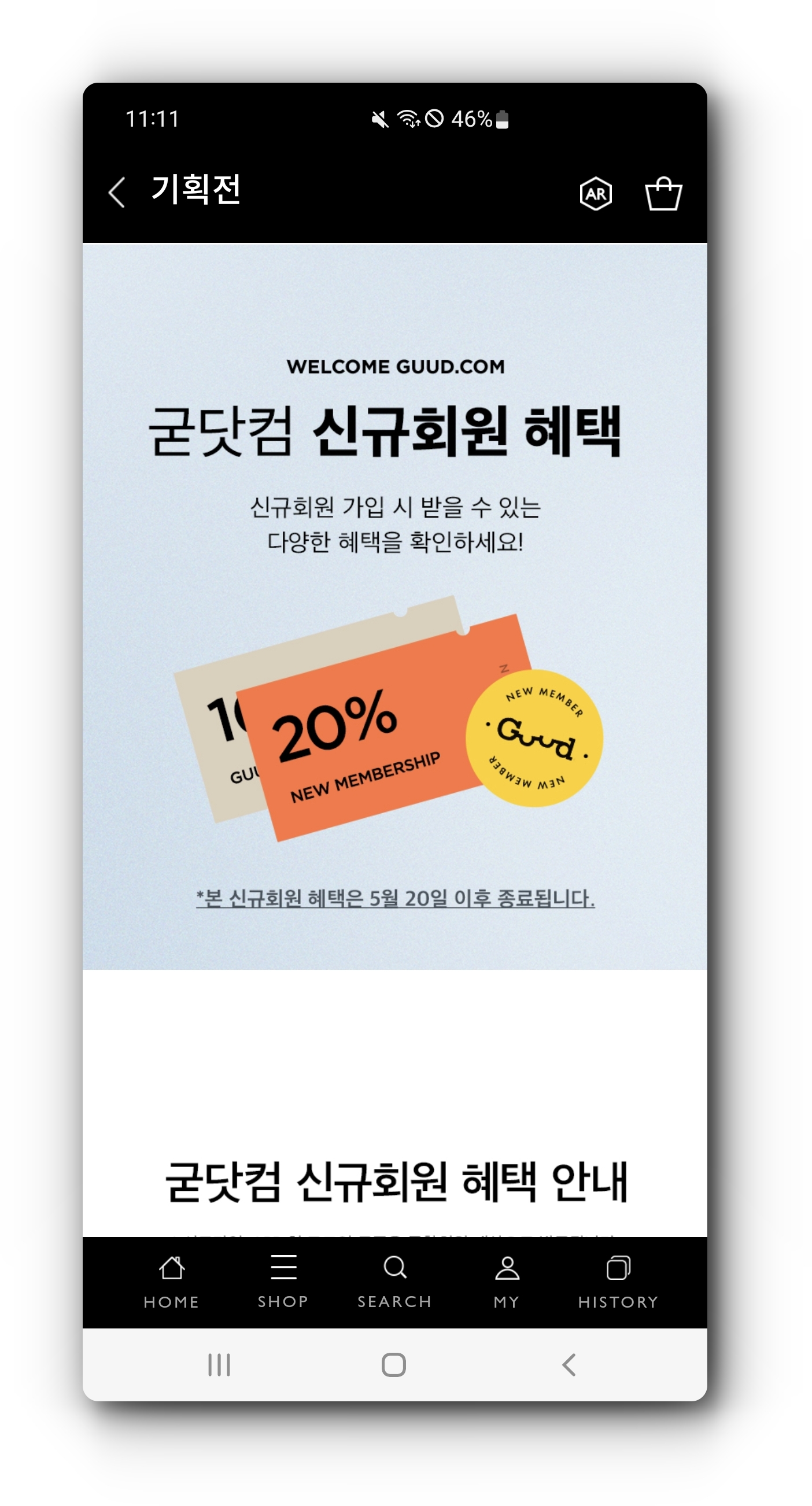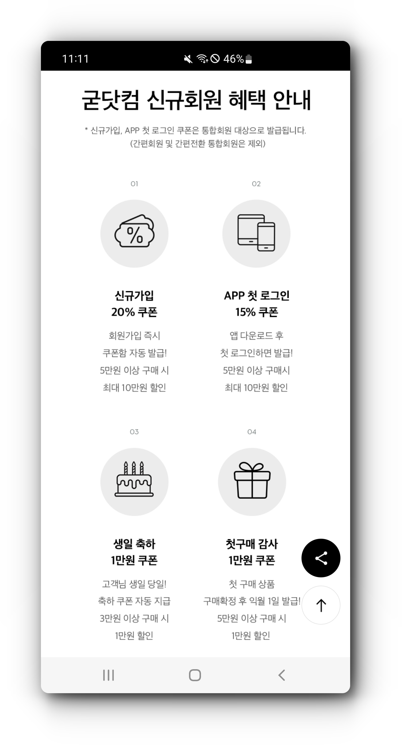- 굳닷컴 APP 첫 로그인 시 15% 할인 쿠폰 지급
