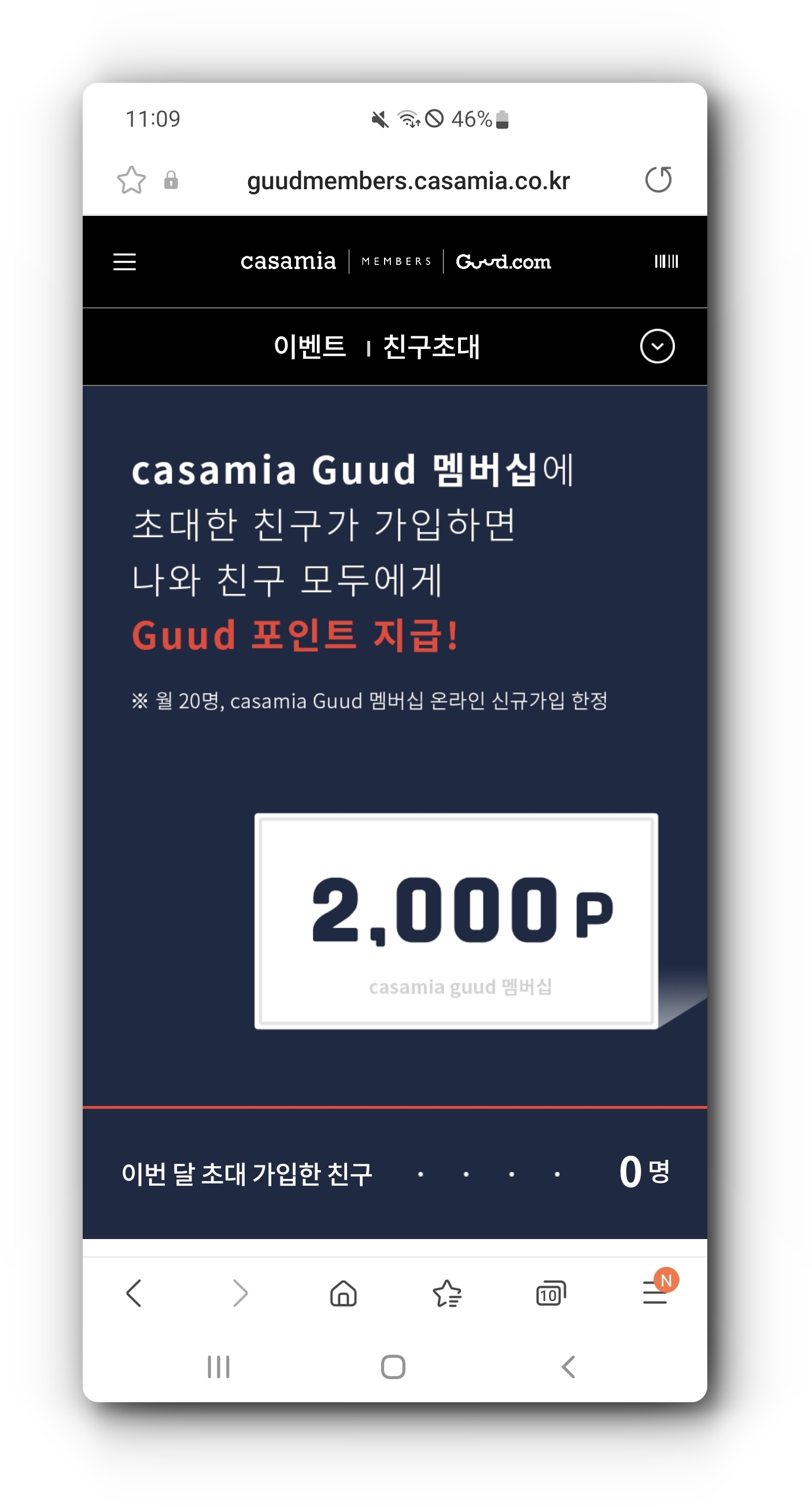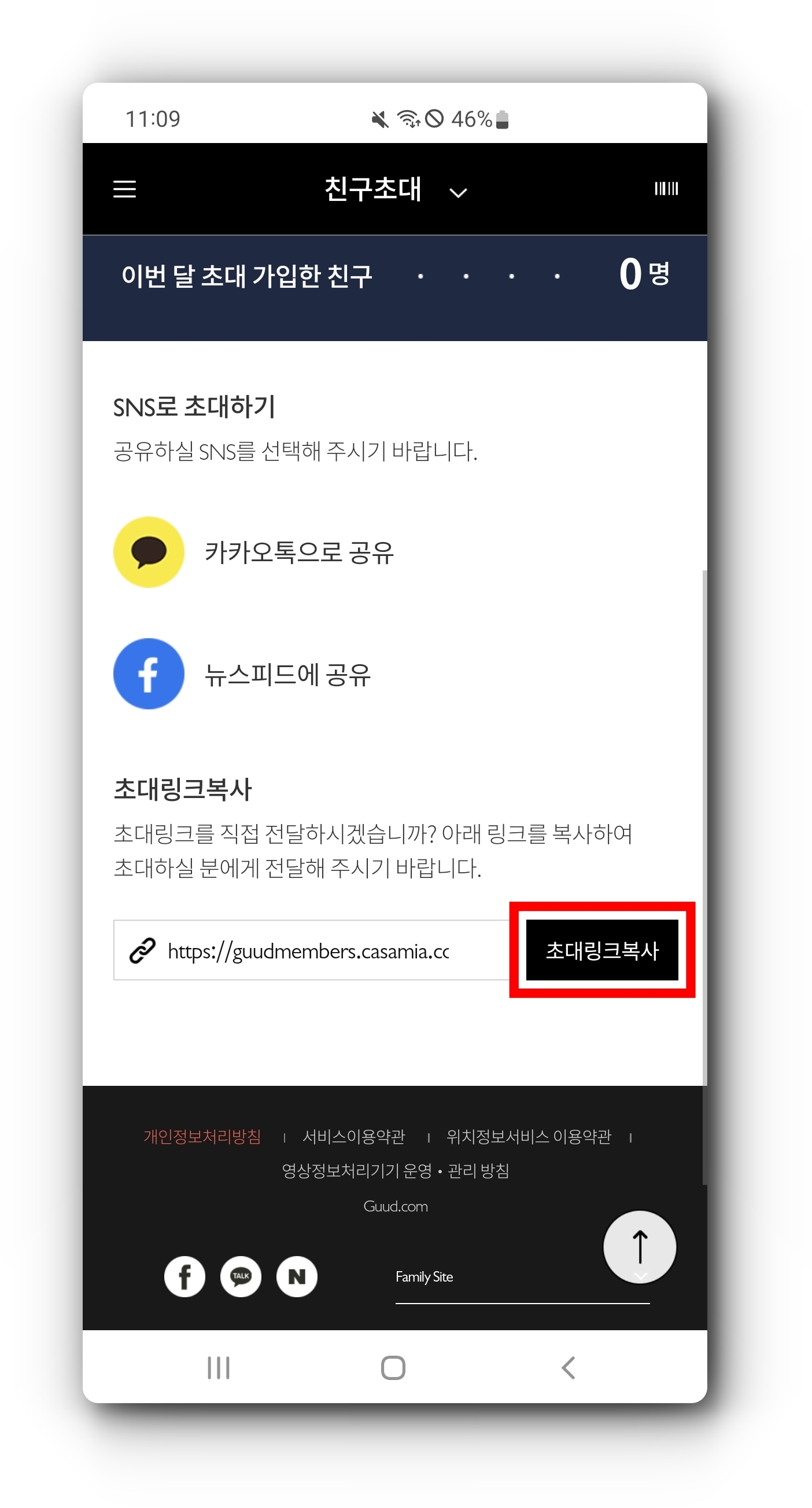굳닷컴 앱이나 웹사이트에서는 자신의 친구초대 링크를 확인할 수 없고 '까사미아 멤버십' 사이트로 이동하셔야 확인하실 수 있습니다.