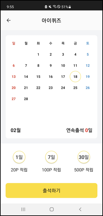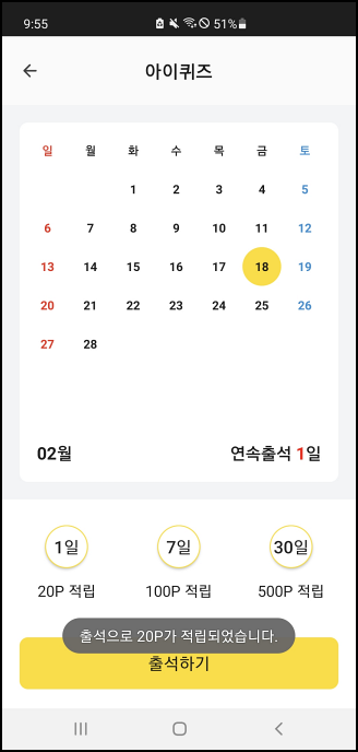 아이퀴즈 홈 화면에서 [출석체크] 배너를 눌러 해당 페이지로 이동할 수 있다. 아이퀴즈에서는 연속 출석일수에 따라 포인트가 지급되는데 1일차, 7일차, 30일차 순으로 20P, 100P, 500P를 적립해주고 있다.