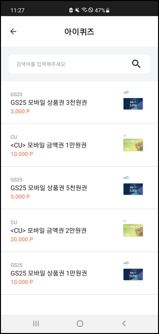 국가의 수도 문제나 사자성어 문제가 주로 등장하며, 퀴즈의 정답을 맞히면 보상으로 10~20P가 적립된다. 퀴즈에 참여하기 위해 사용되는 퀴즈 기회는 퀴즈 PLUS에서 광고를 시청하고 추가적으로 얻을 수 있다.