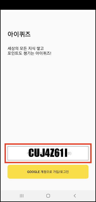 1. 구글 플레이 스토어에서 아이퀴즈 앱을 설치하고 실행한다. 앱을 처음 실행하면 오른쪽 사진과 같이 추천인 코드를 입력하는 칸이 등장하는데, 여기에 CUJ4Z61I를 복사해서 붙여넣고 구글 계정으로 로그인하면 된다.