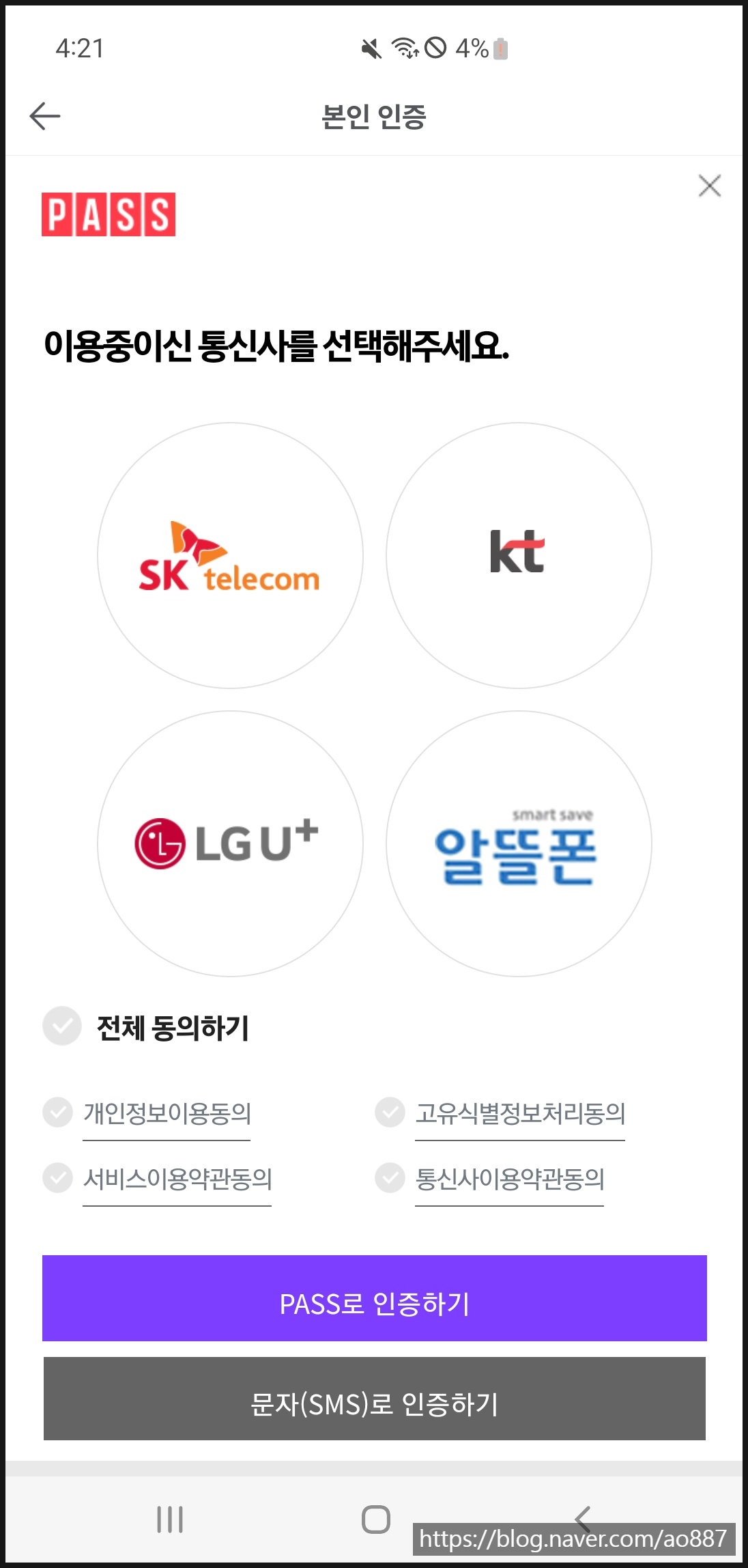 이용약관 동의 후 [본인 인증으로 정보 수집하기] 버튼을 터치합니다.