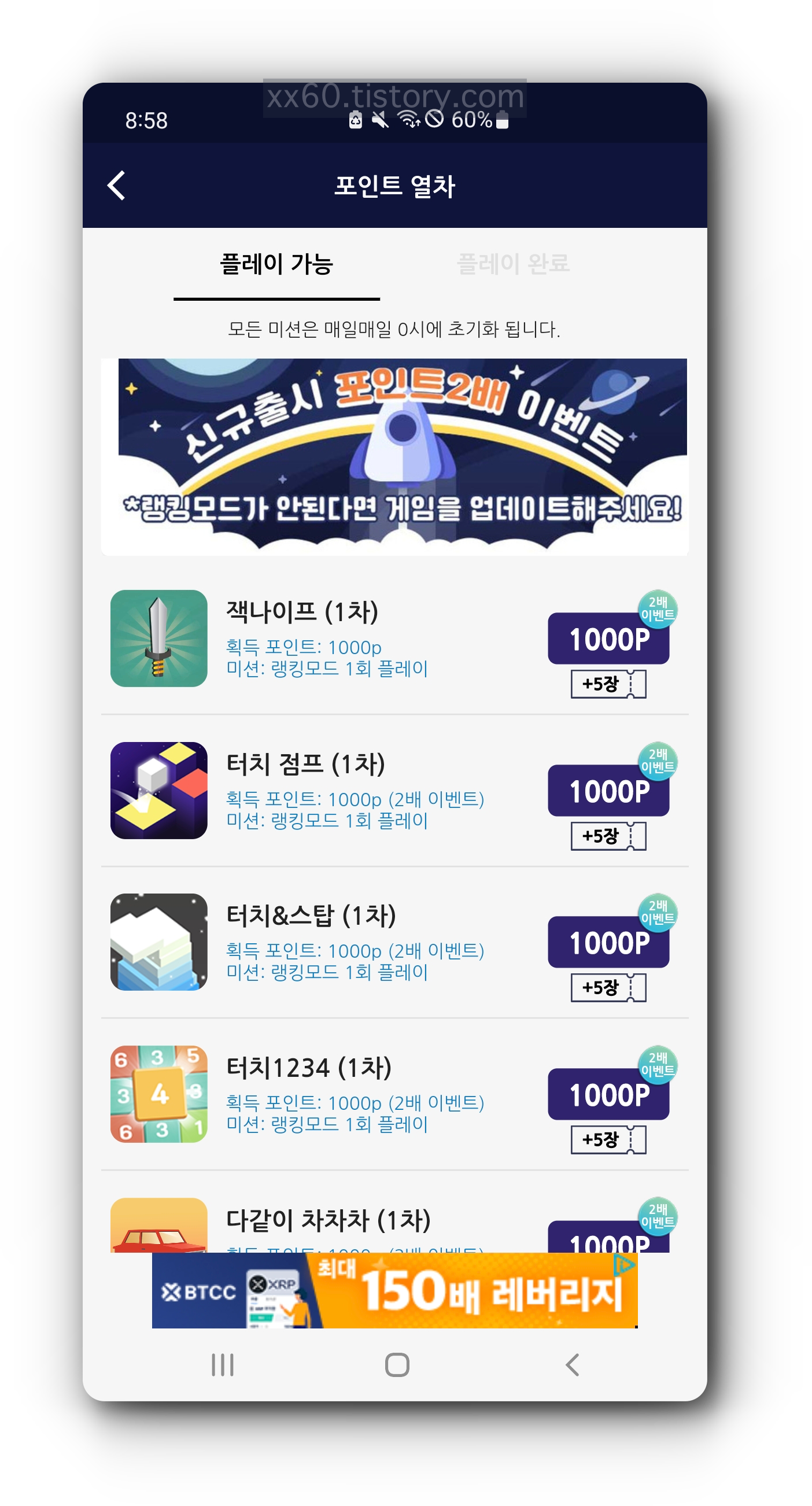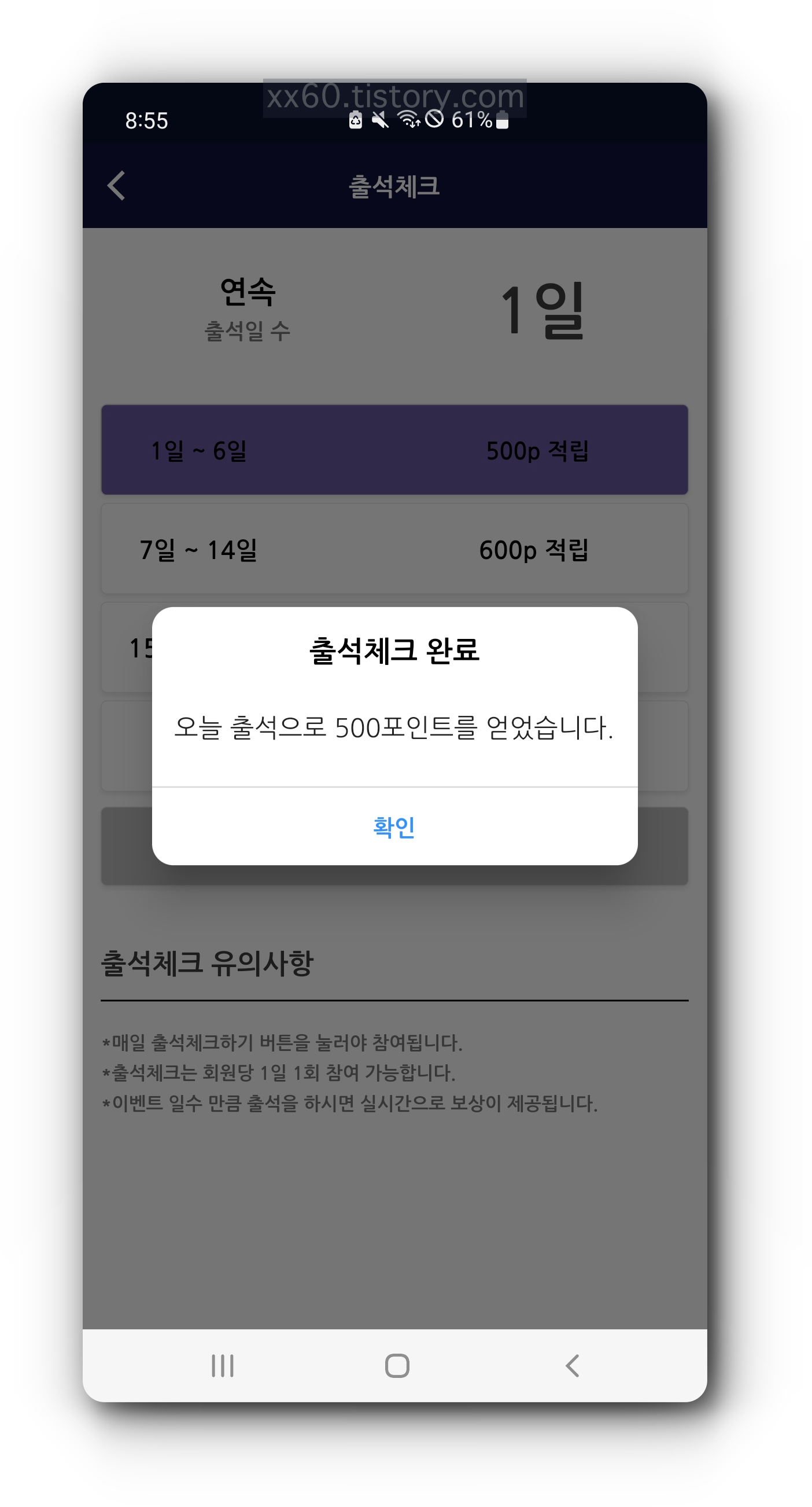 출석체크를 마친 후 뒤로가기 버튼을 눌러 홈화면으로 돌아오면 초대 보상으로 5만 포인트가 지급되었다는 창을 확인할 수 있습니다.