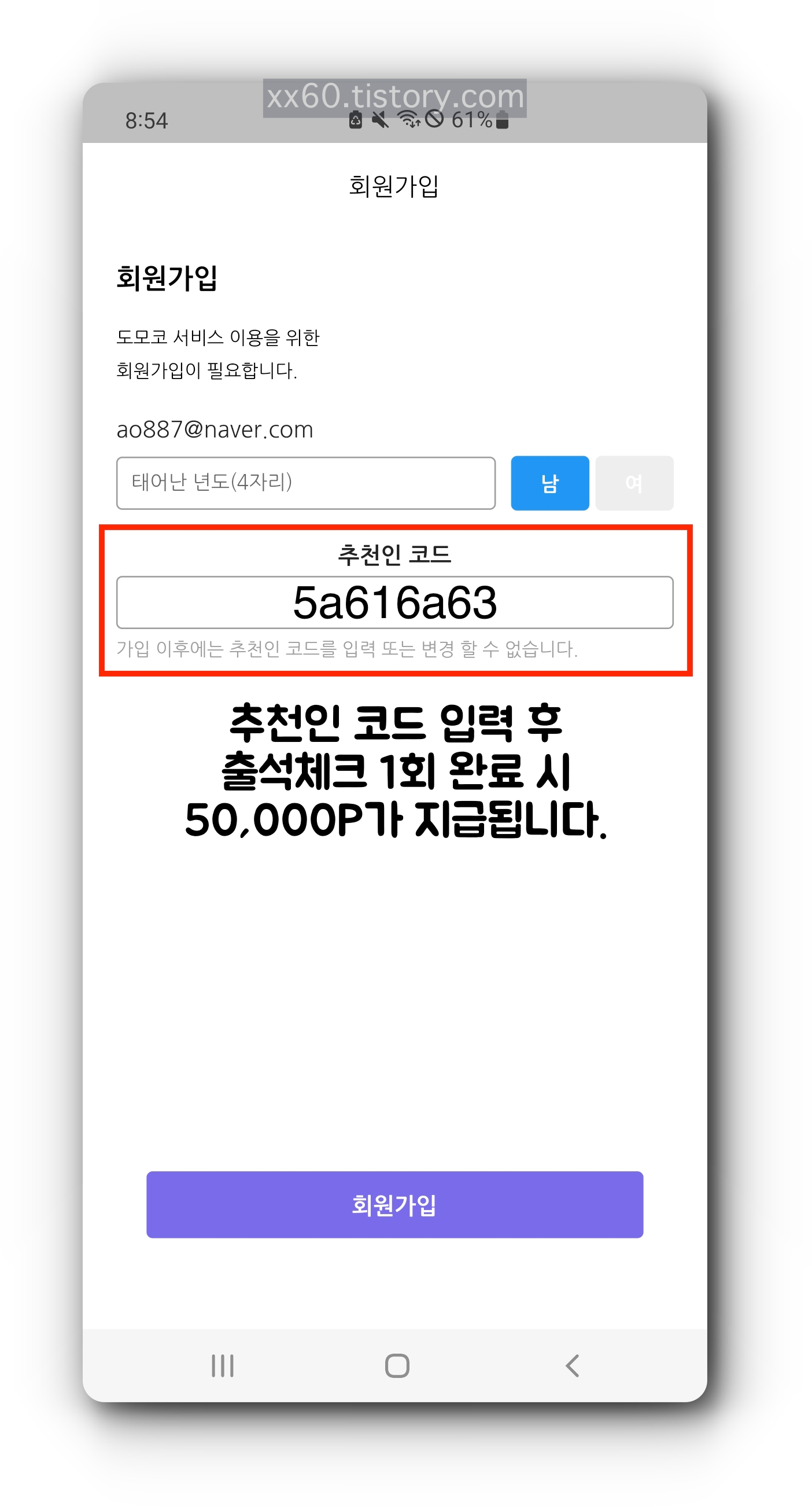 휴대전화번호 본인인증을 마친 후에는 태어난 년도와 성별, 추천인 코드를 입력하게 됩니다. 여기서 추천인 코드에 5a616a63를 입력하고 출석체크를 최초 1회 완료하면 5만 포인트를 받을 수 있으니 꼭 입력하는 것을 추천드립니다.